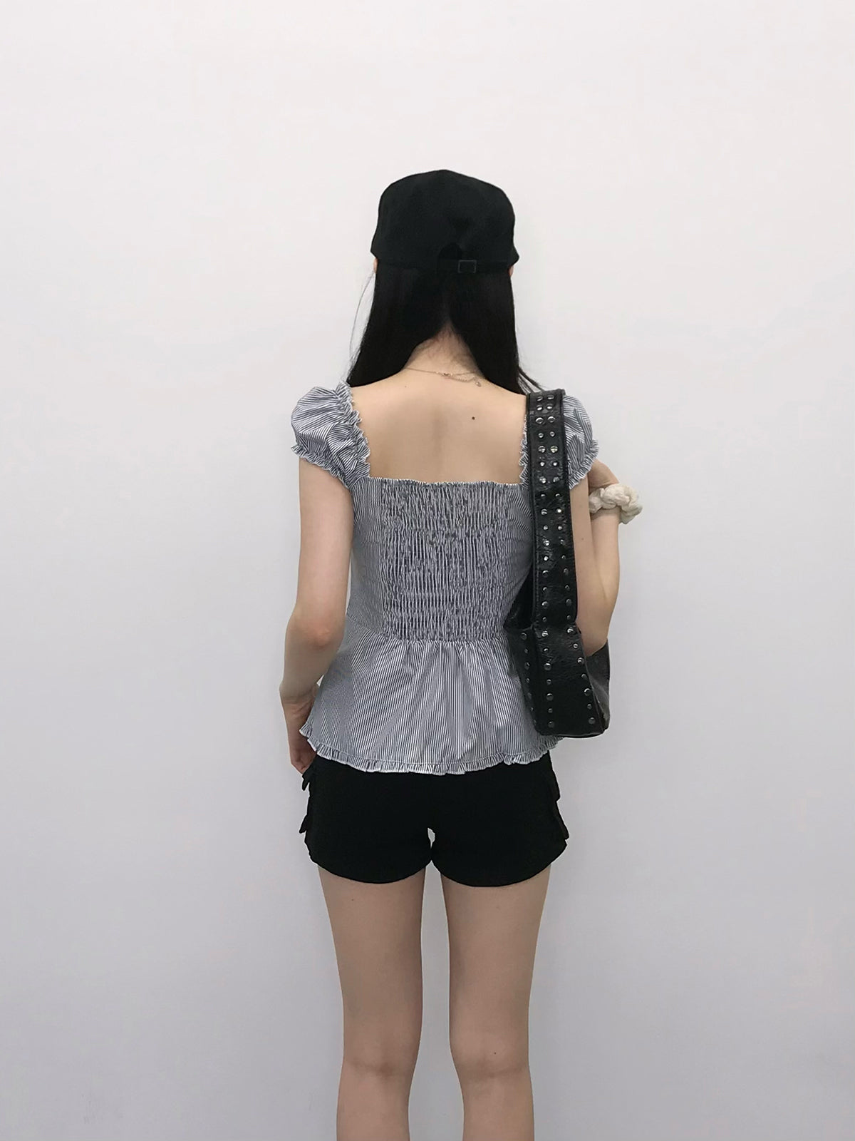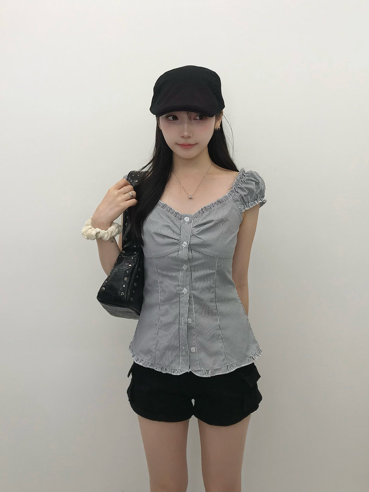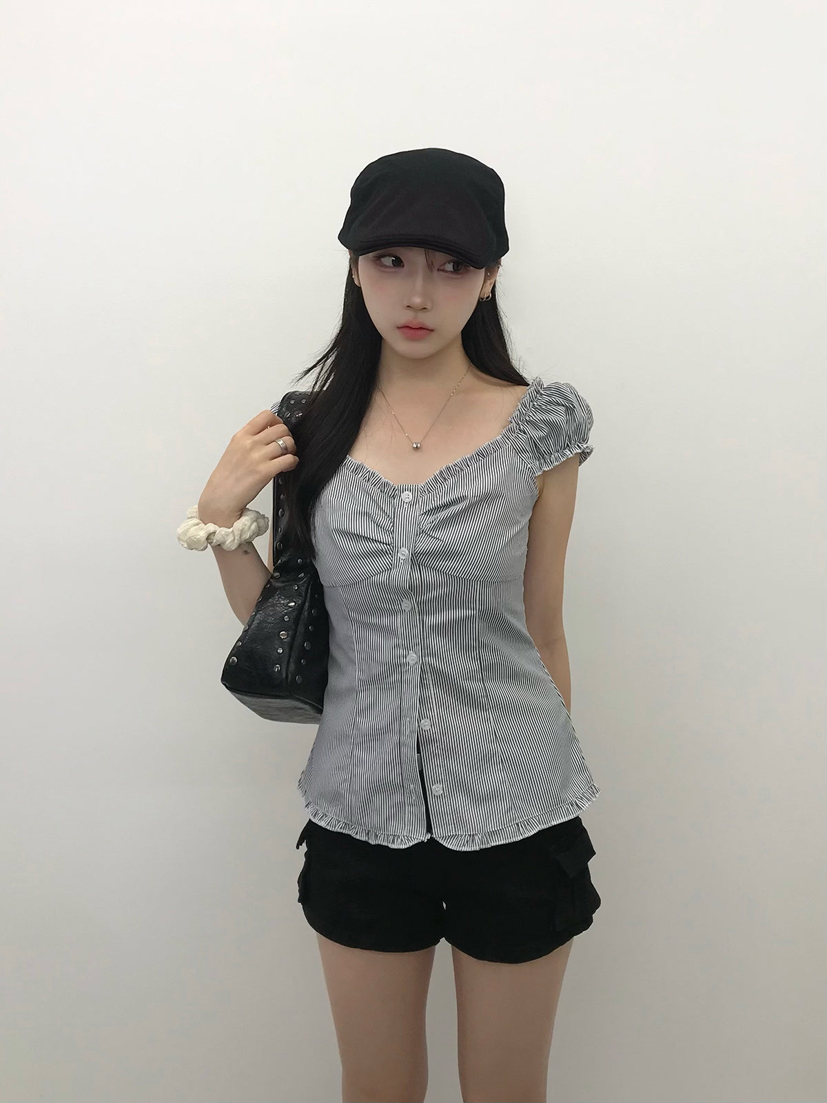 ストライプ柄に胸元のギャザーとフリルを添えた、ディテールにこだわった一枚。