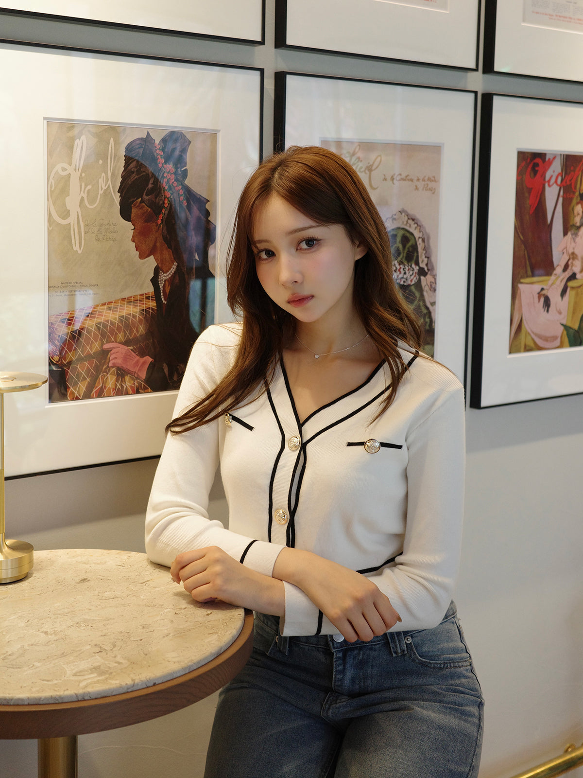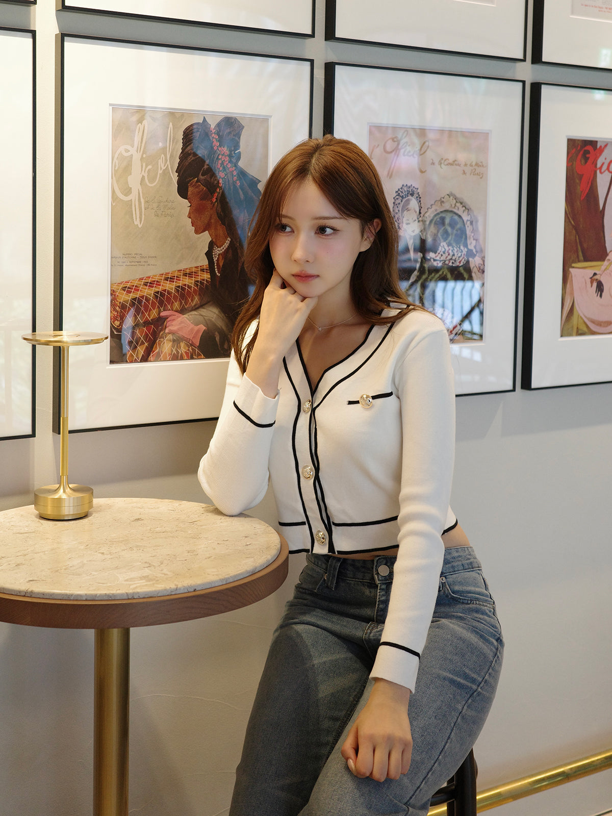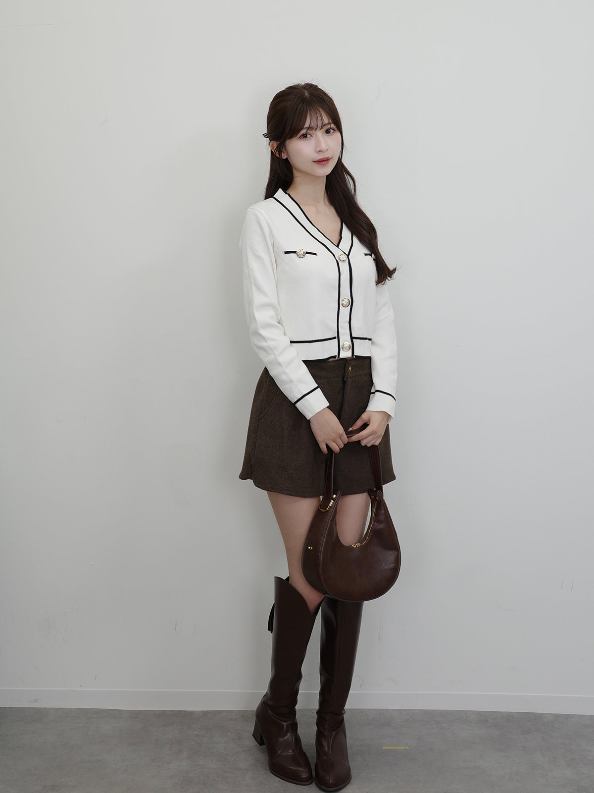 クラシカルムード漂う配色ラインが上品な印象のカーディガン。