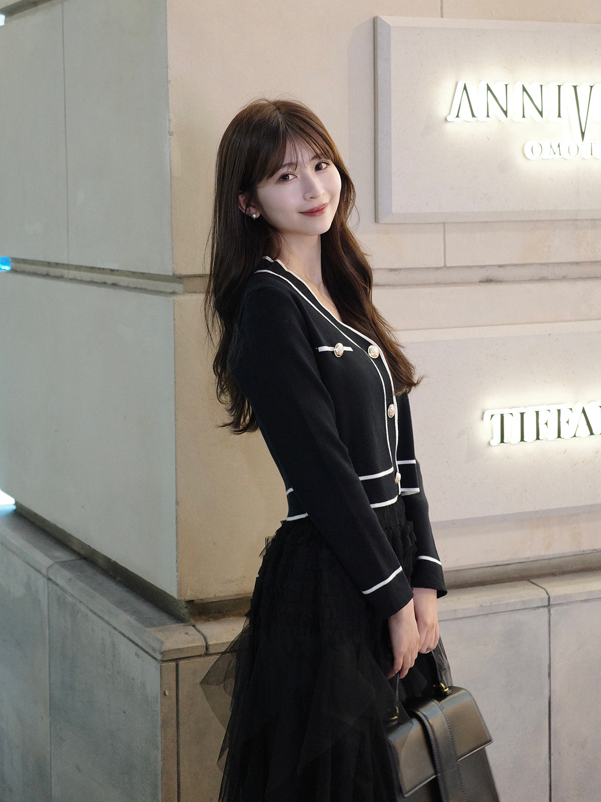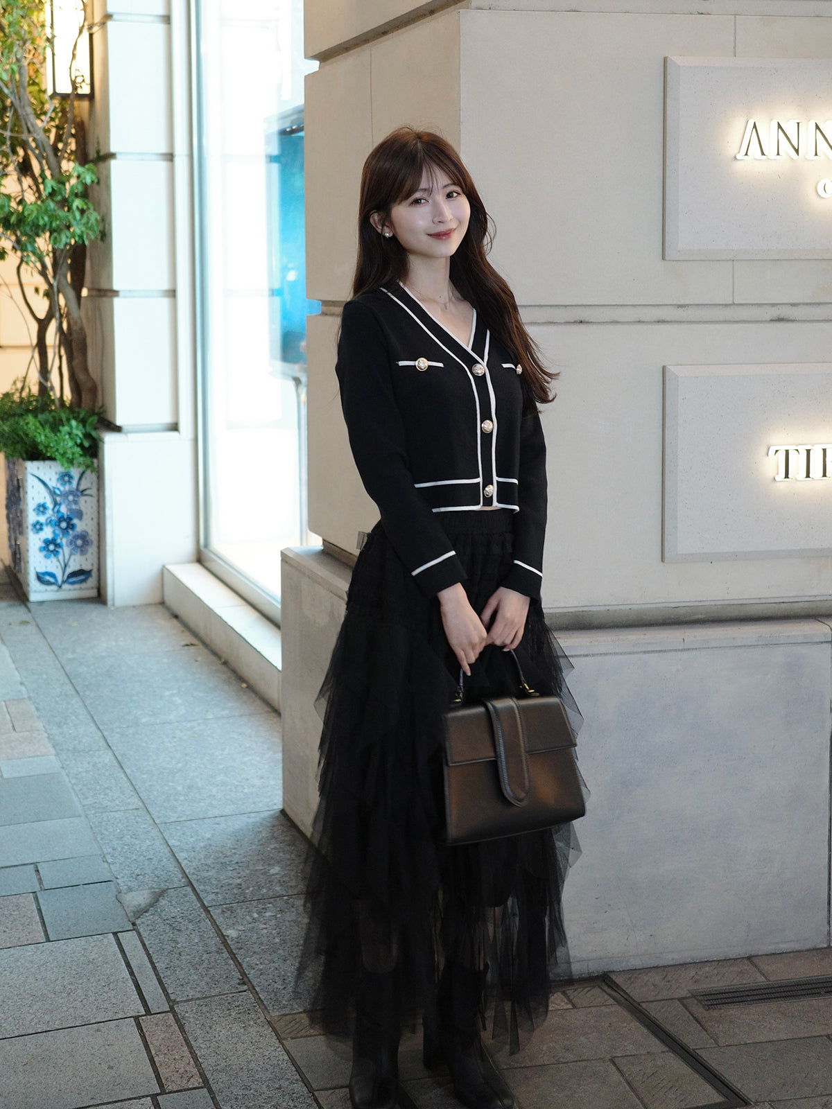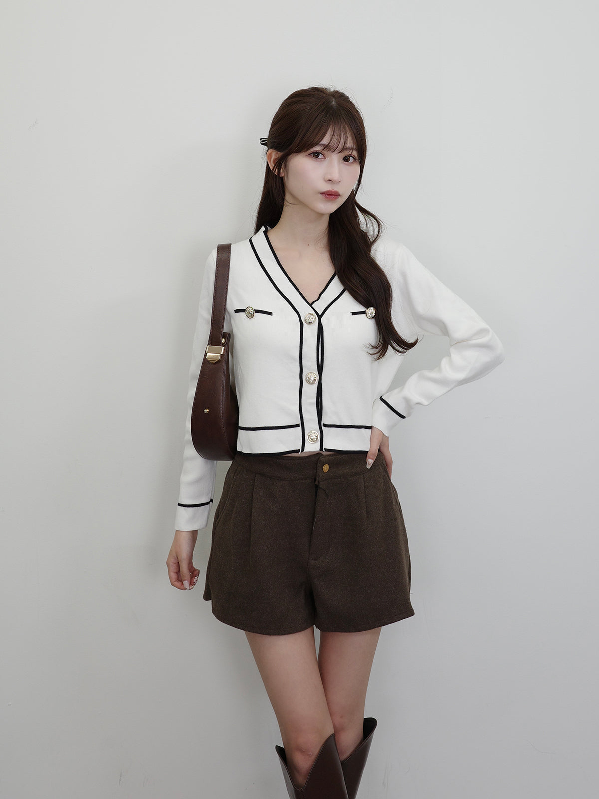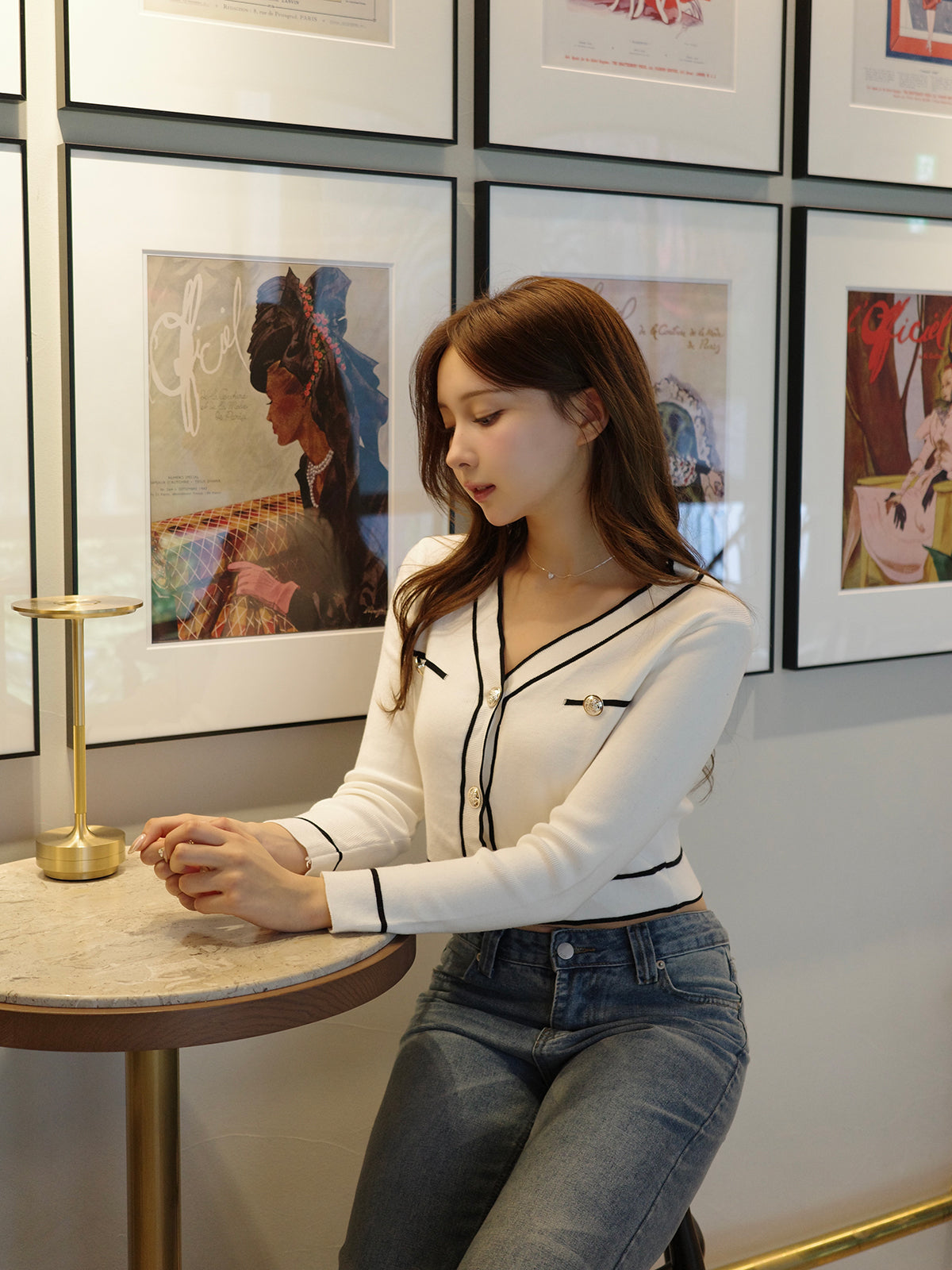 クラシカルムード漂う配色ラインが上品な印象のカーディガン。