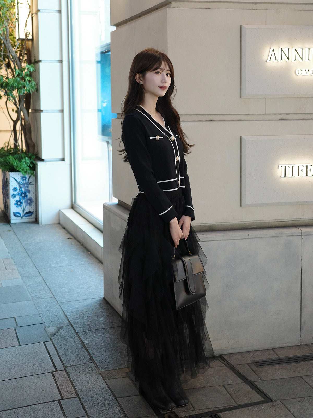 デコルテを美しく見せるVネックとすっきり見せる丈感で、女性らしい着こなしに。
