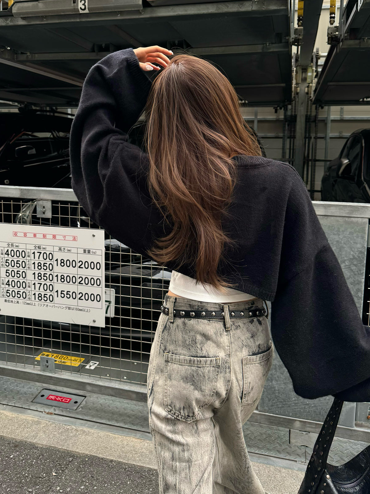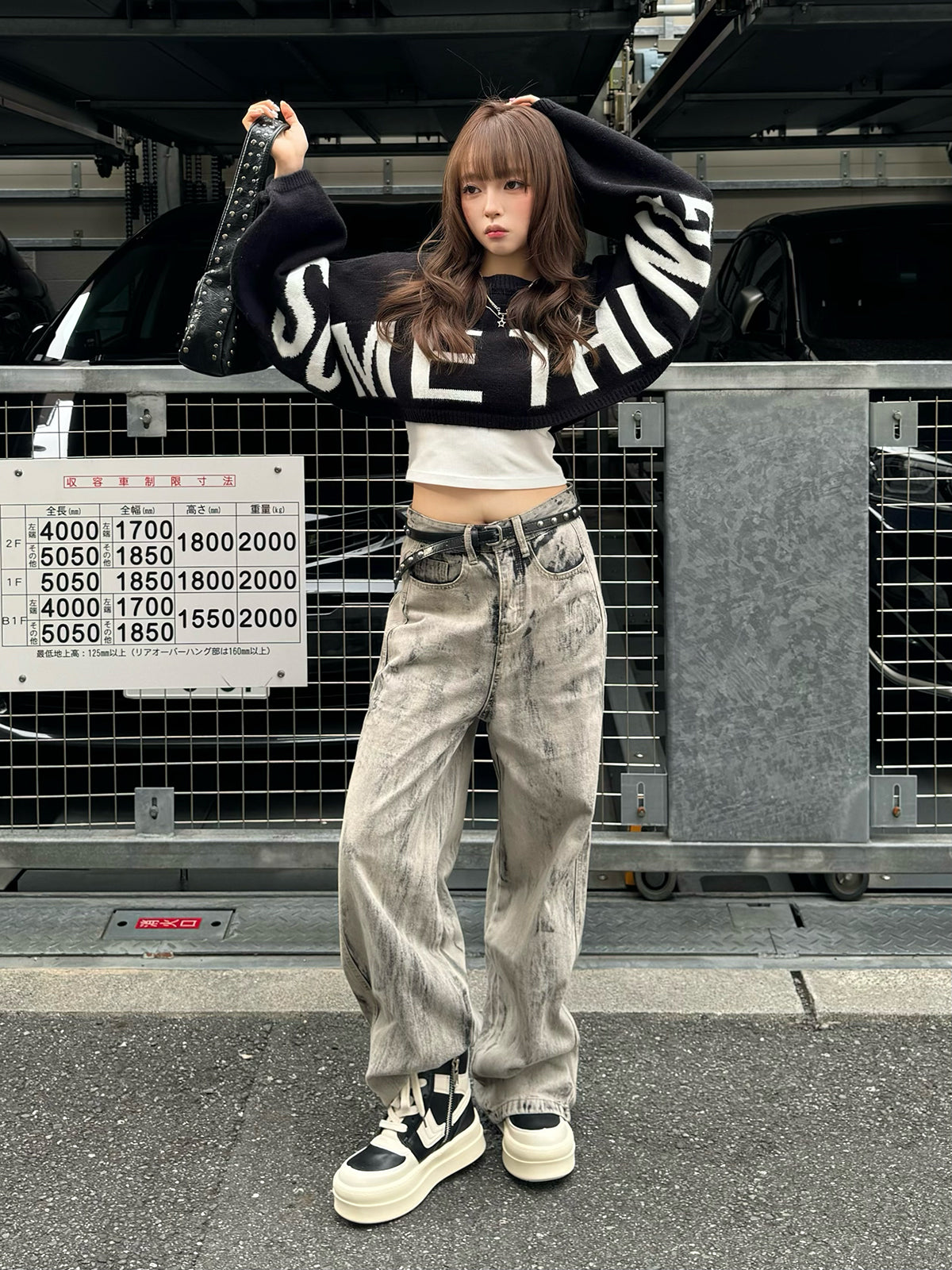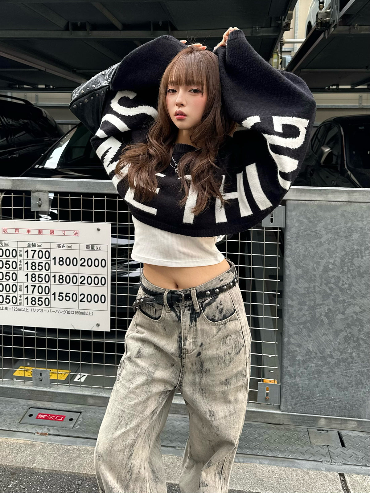 ショート丈が今年らしいシルエットを引き立てるビッグロゴショートニット。