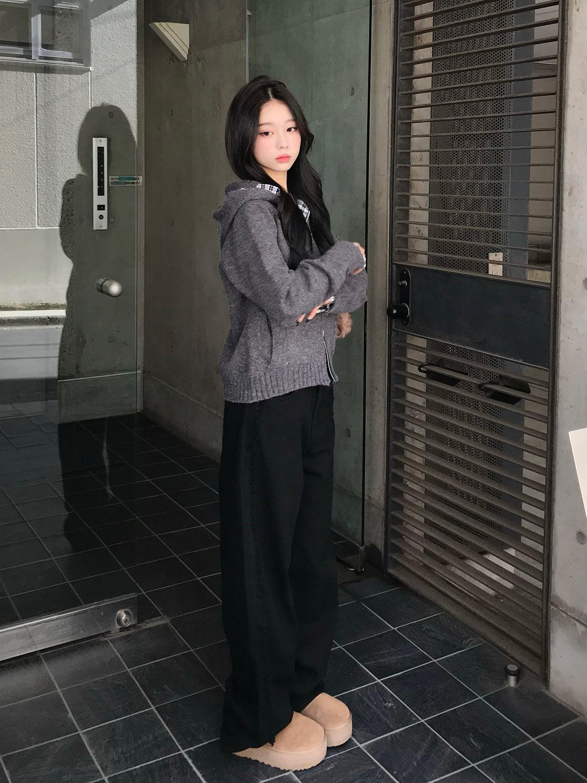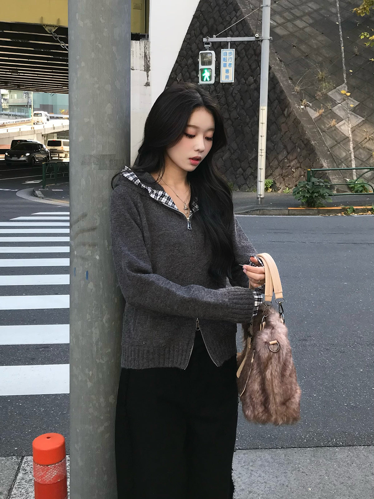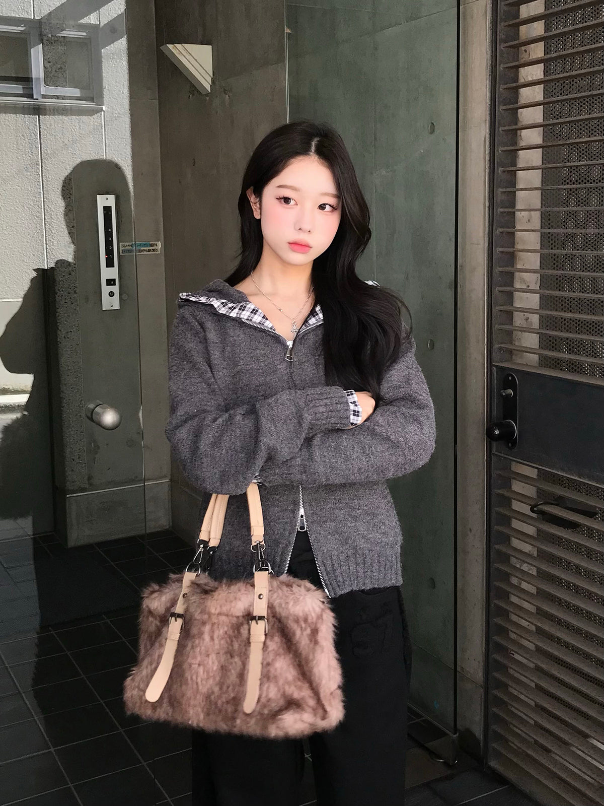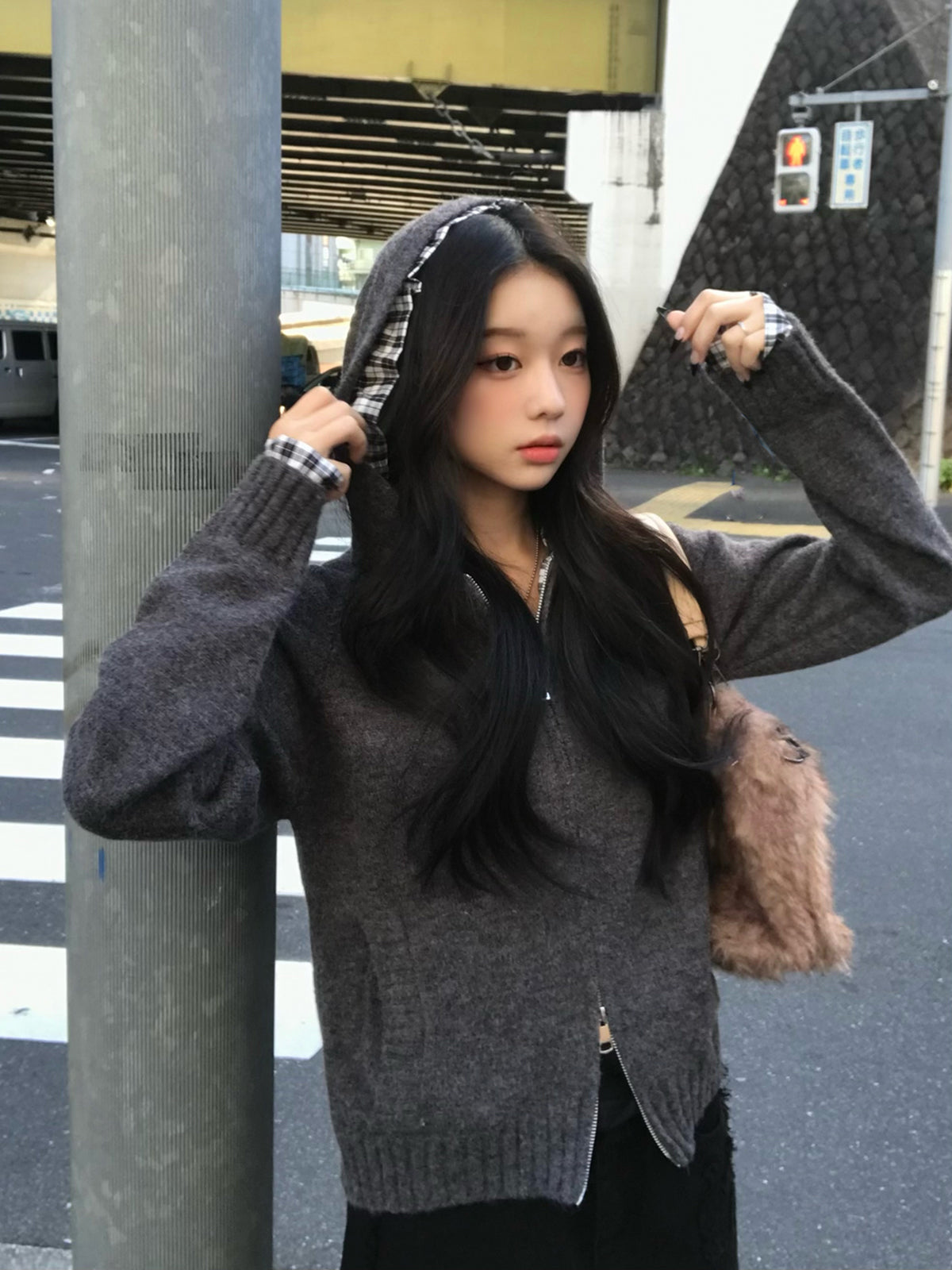 チェックフリルダブルジップニット