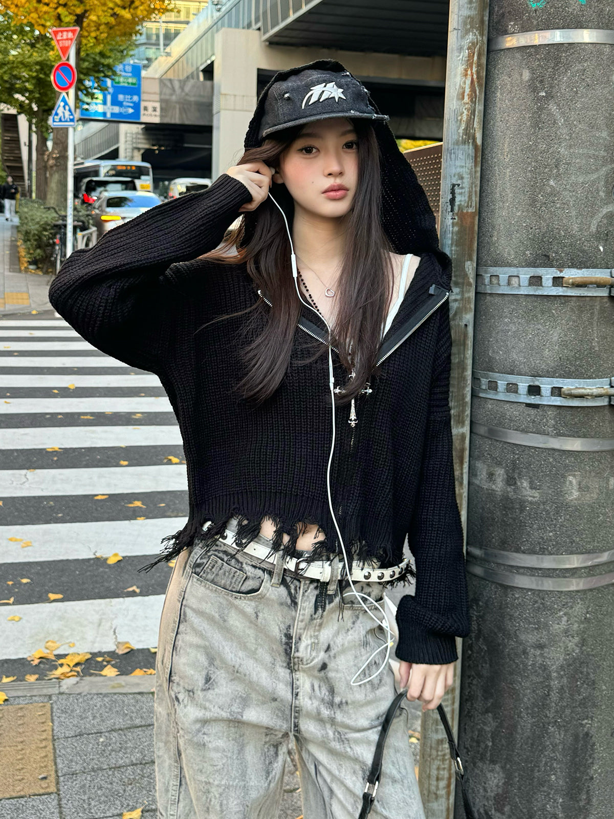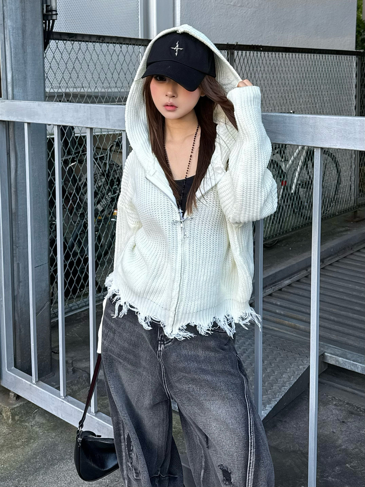 ざっくりとした編地に、フリンジを加えたダメージ加工がアクセントになるニットパーカー。
