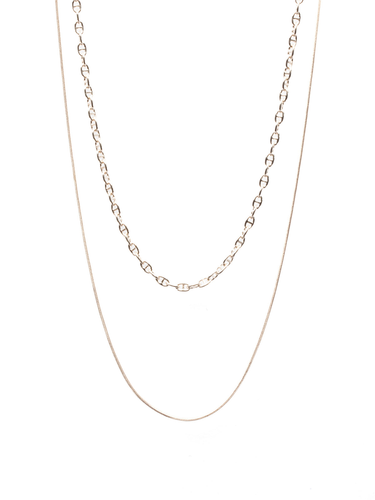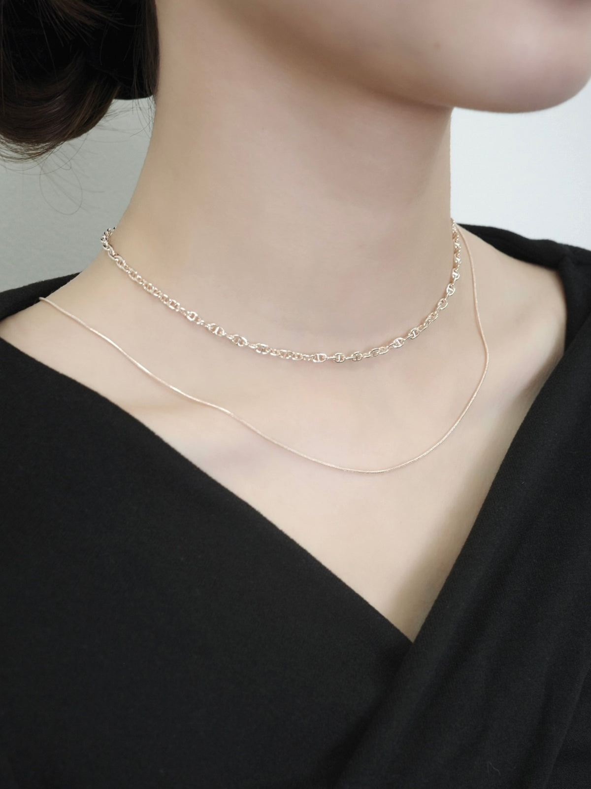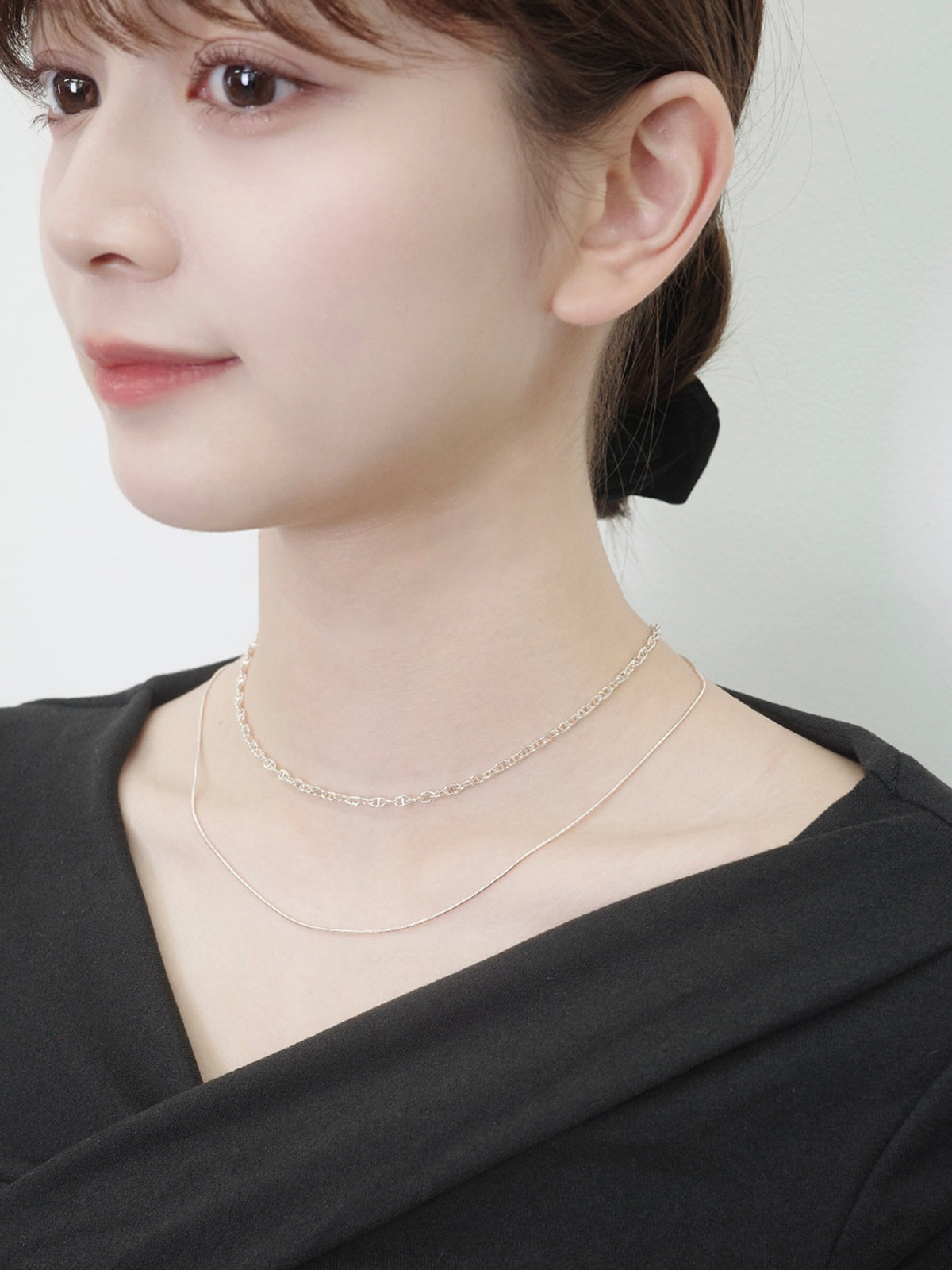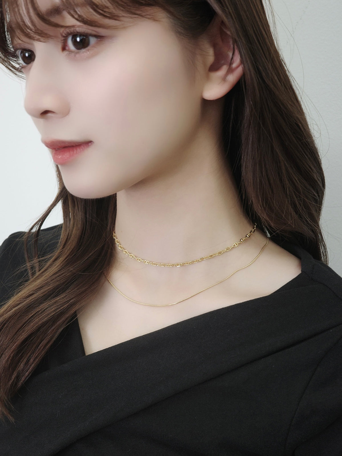 異なる表情のチェーンを重ねたレイヤードデザインが、首元に奥行きと洗練されたムードをプラスします。