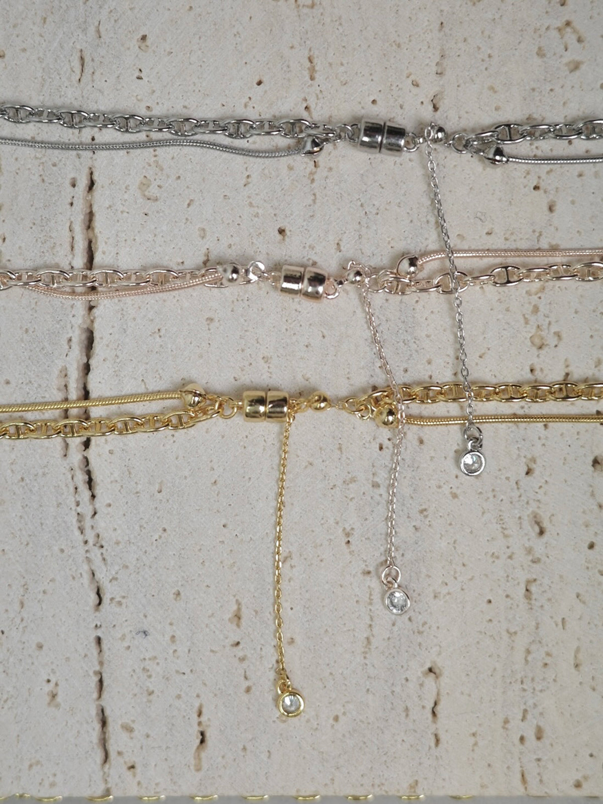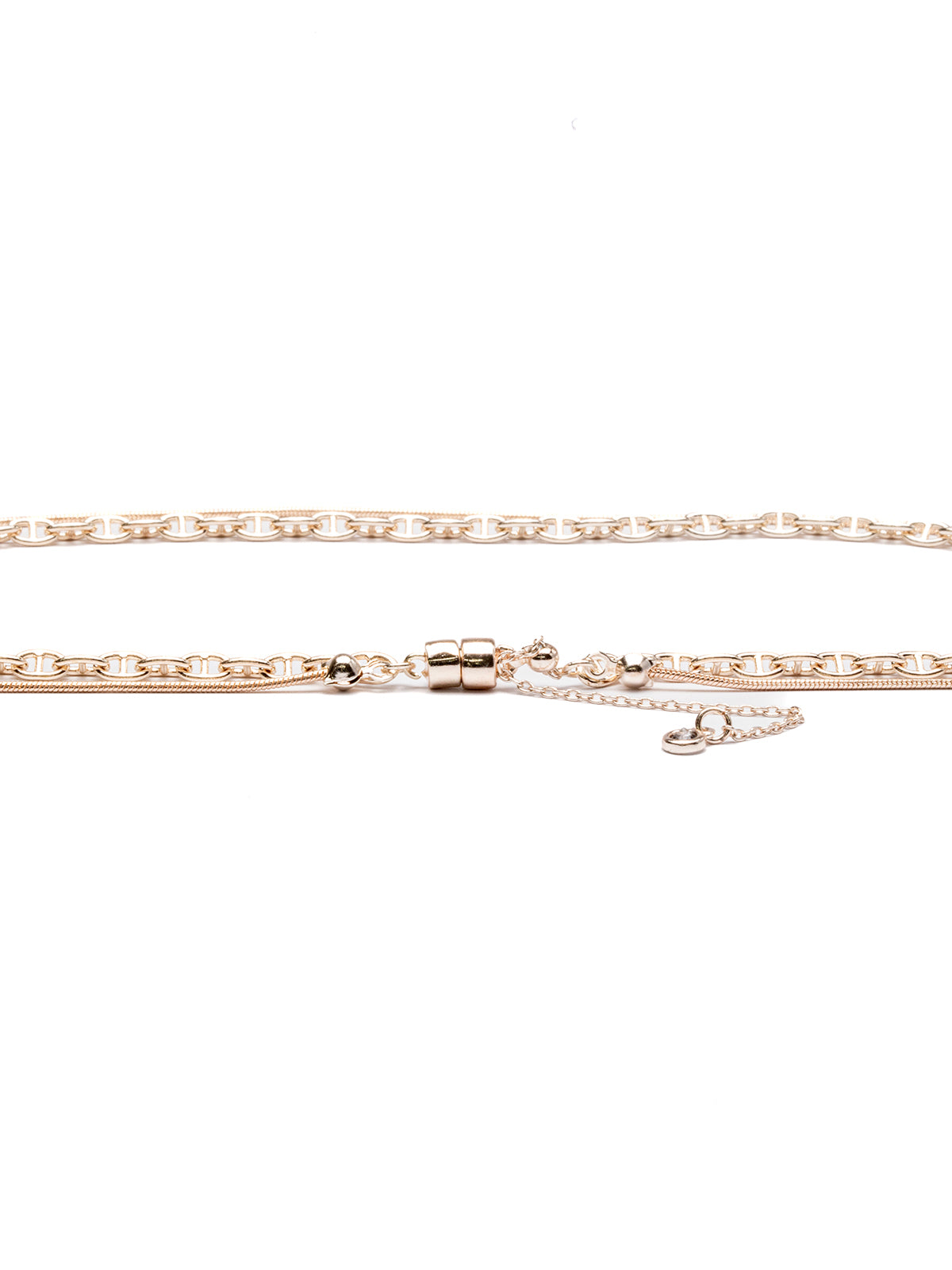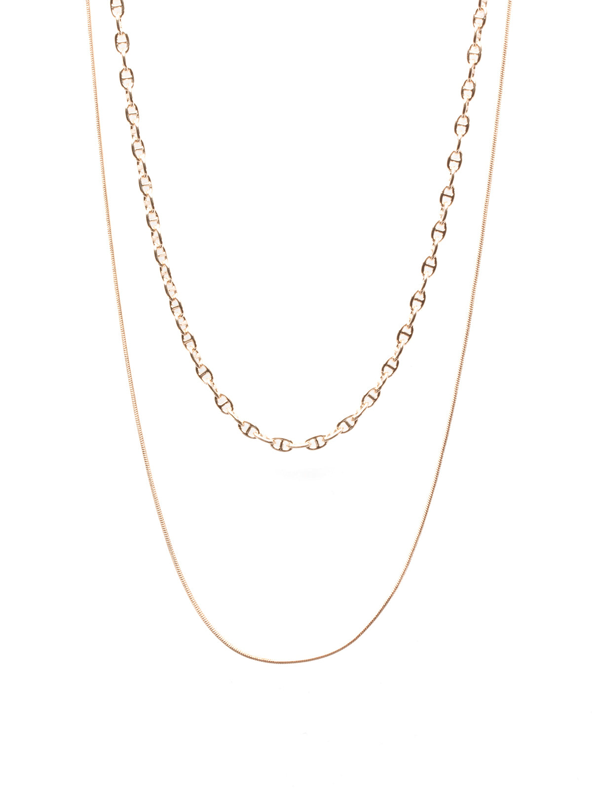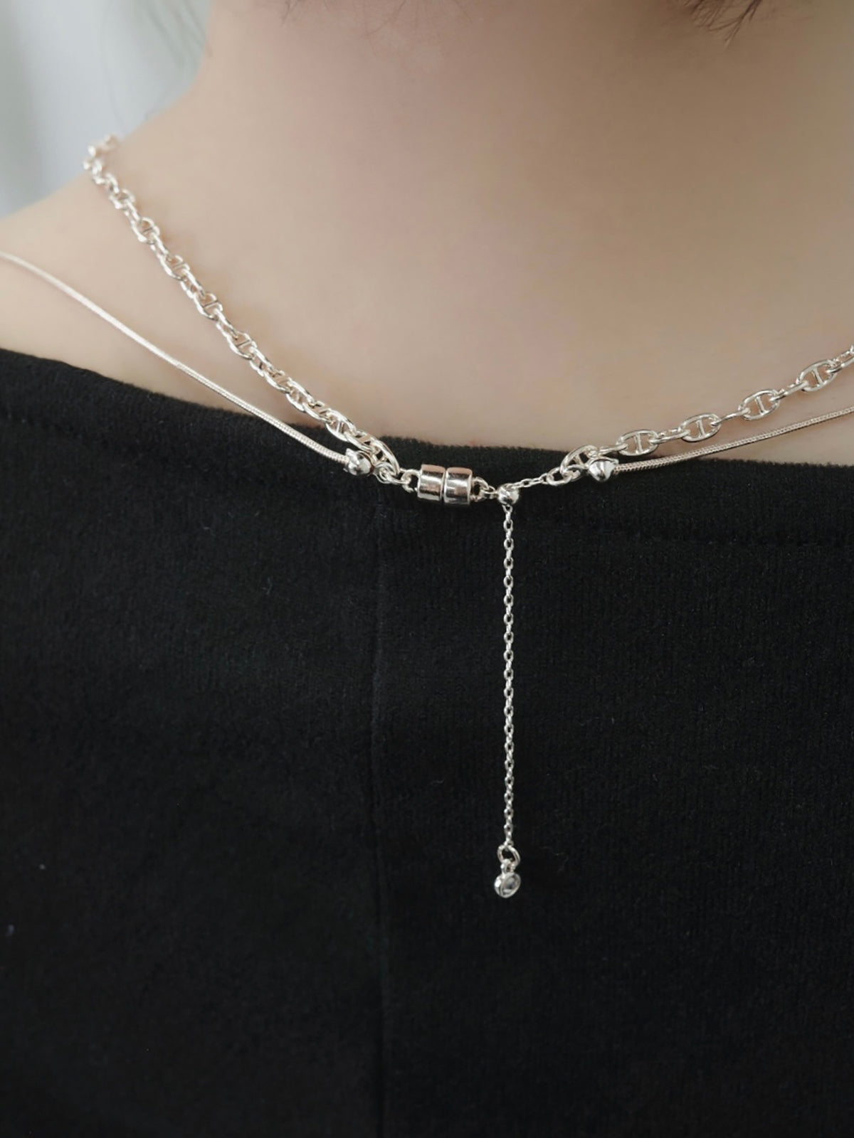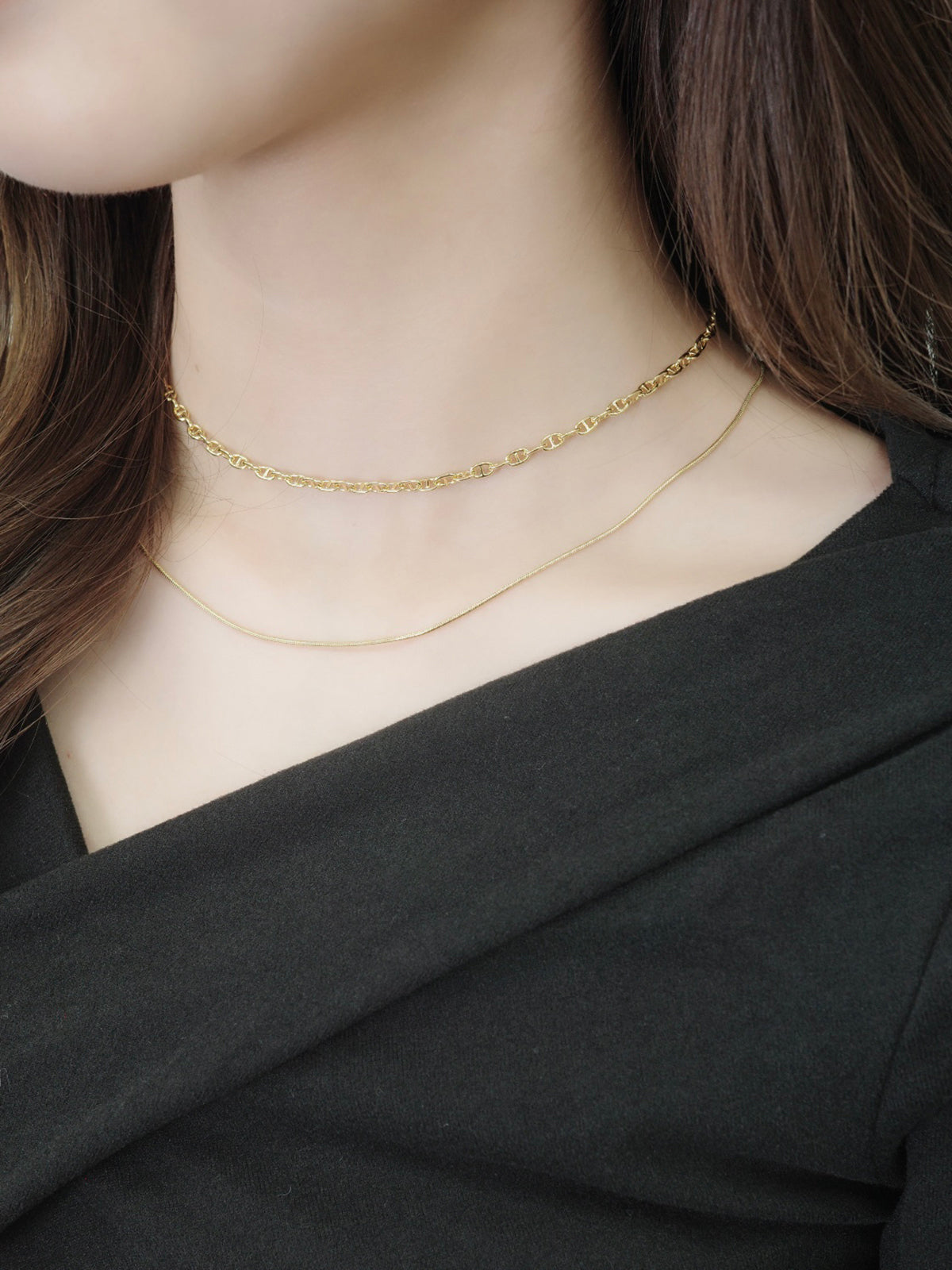 異なる表情のチェーンを重ねたレイヤードデザインが、首元に奥行きと洗練されたムードをプラスします。