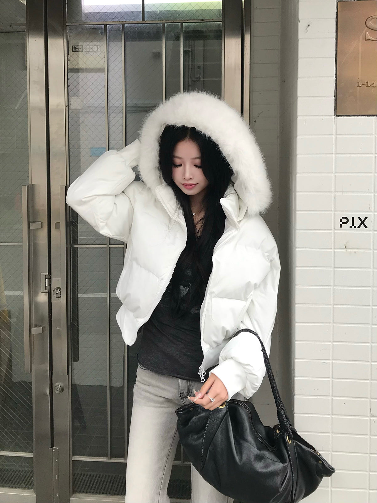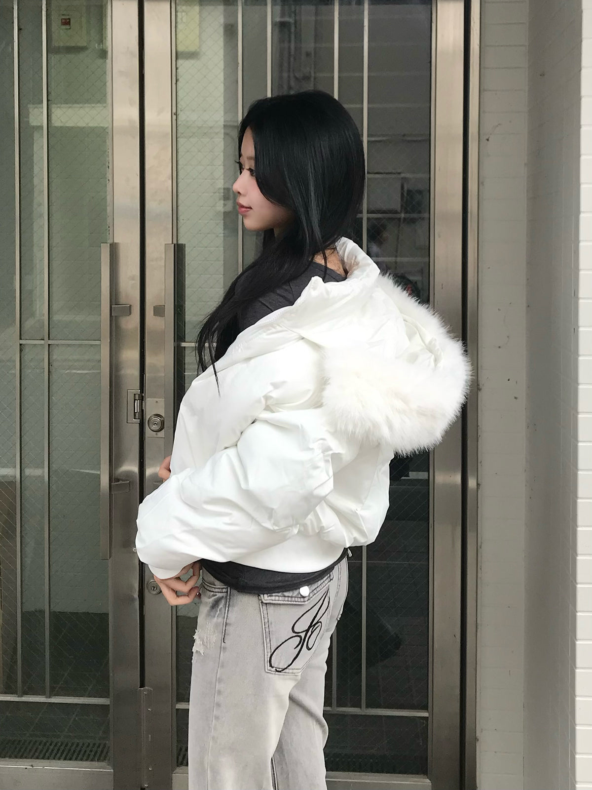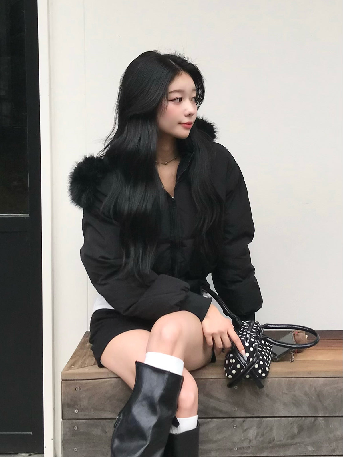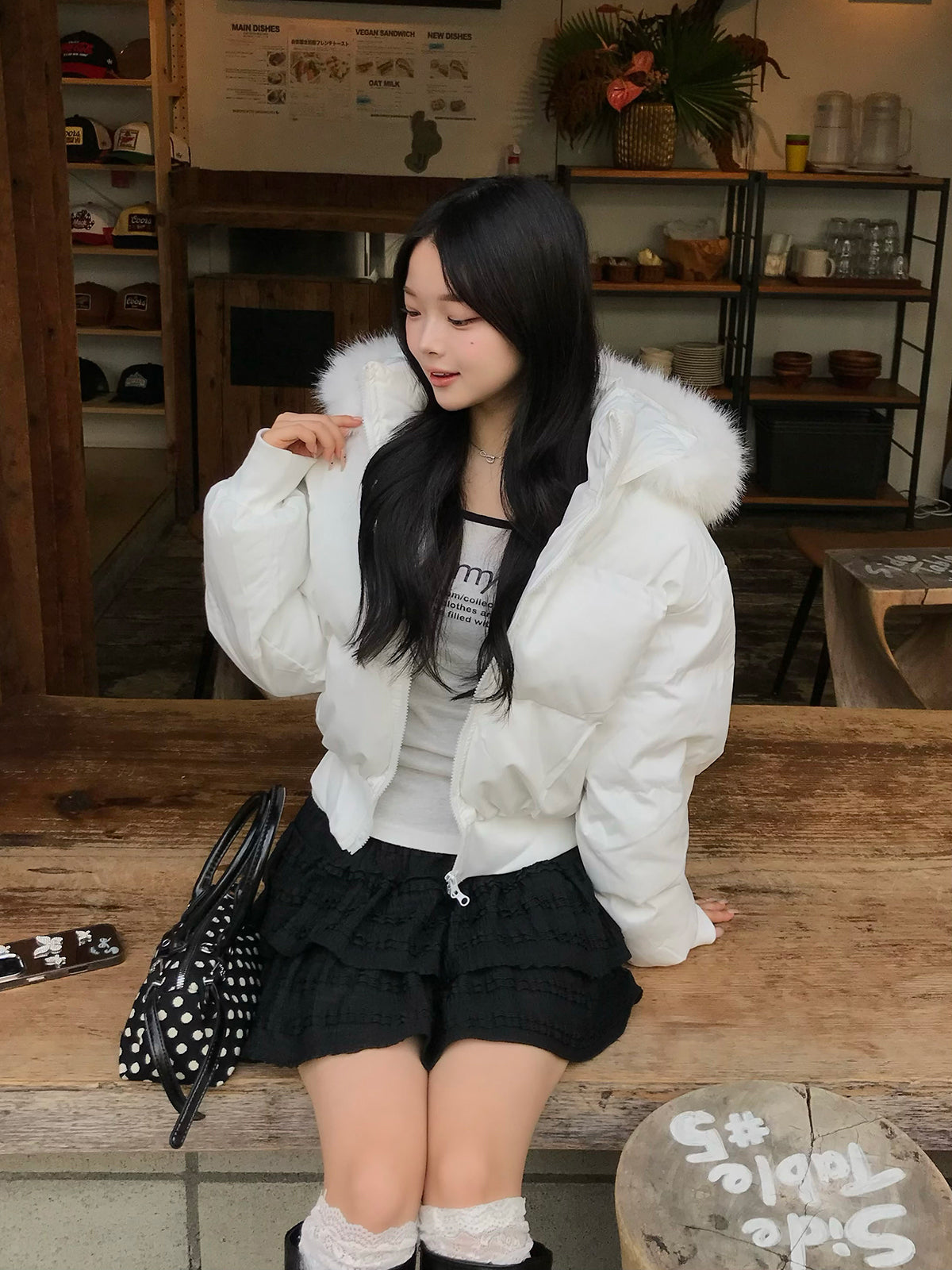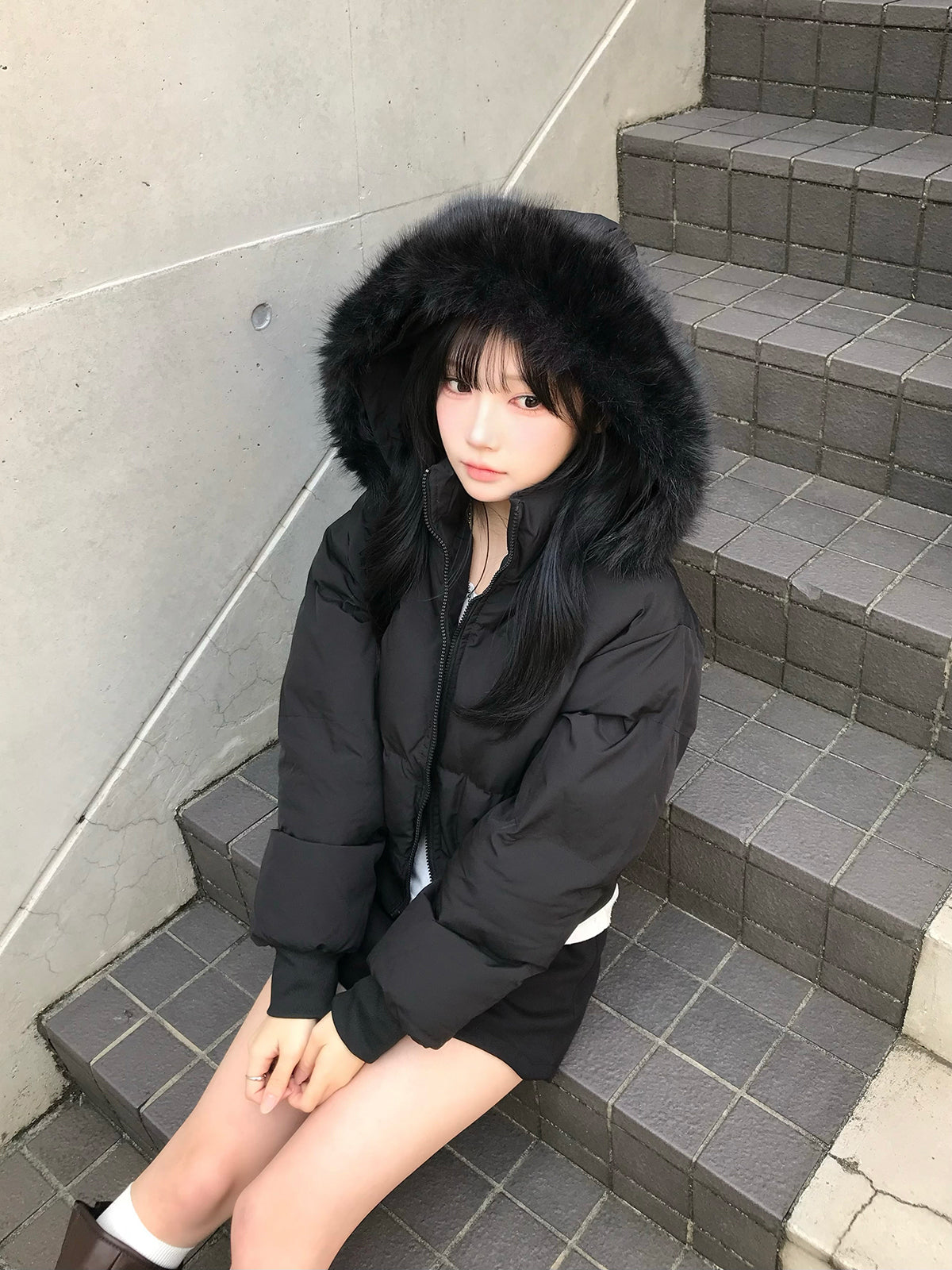 取り外し可能なファータッチのフードがボリューム感をプラスし、顔まわりを華やかに見せてくれます。