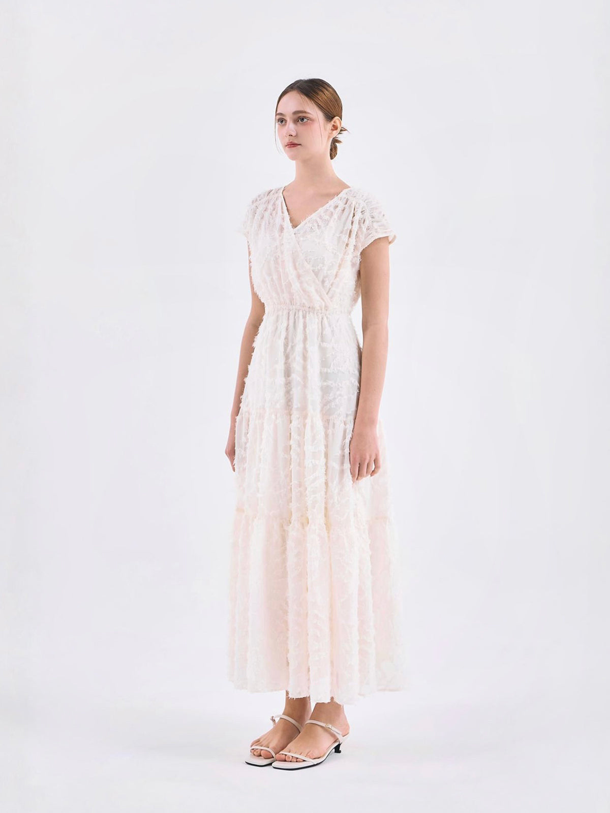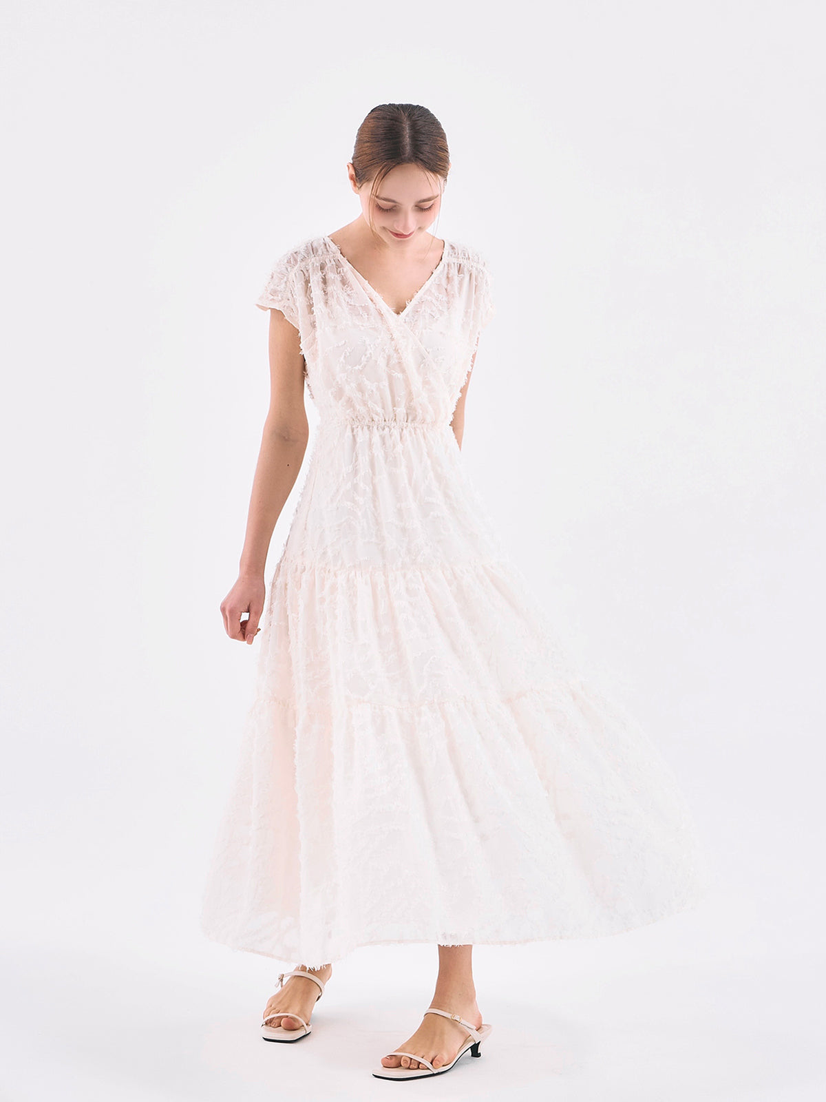 ジャガードレースの華やかな質感と、揺れるシルエットが魅力のマキシ丈ドレス。