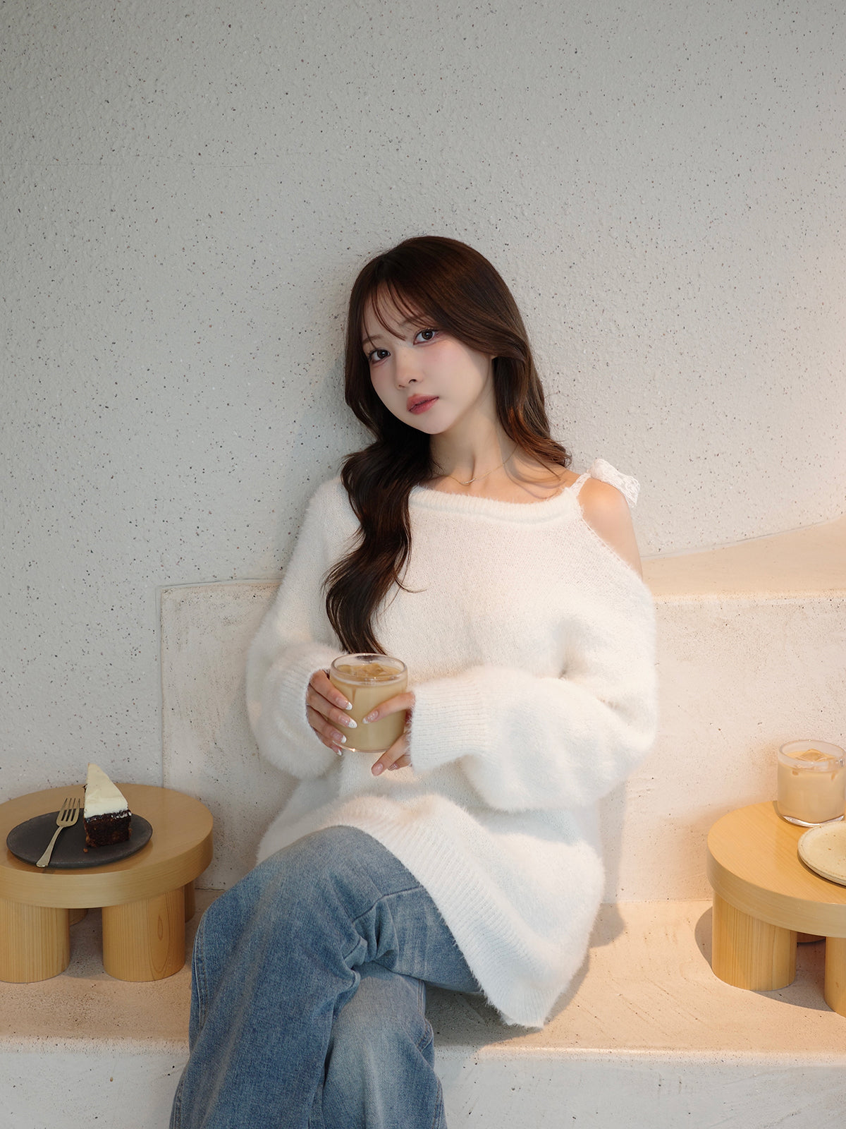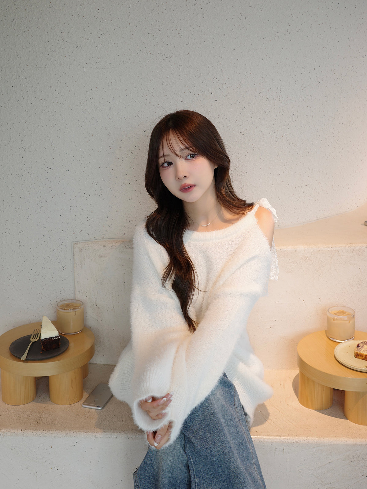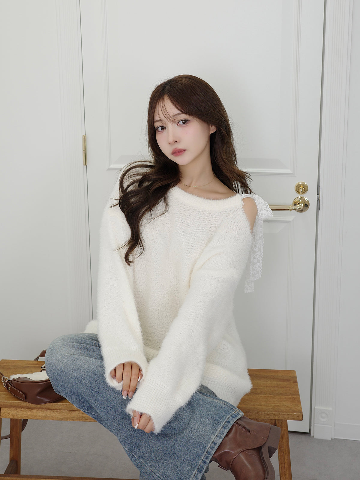 レースリボンのアクセントでほんのり甘めに仕上げたルーズニット。