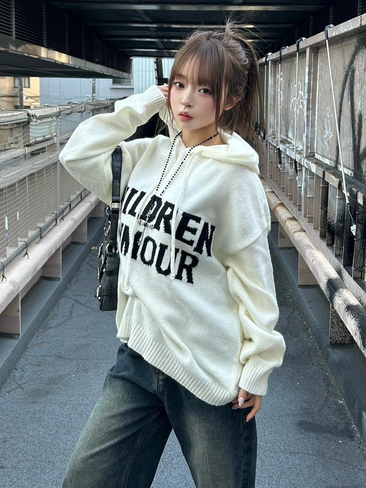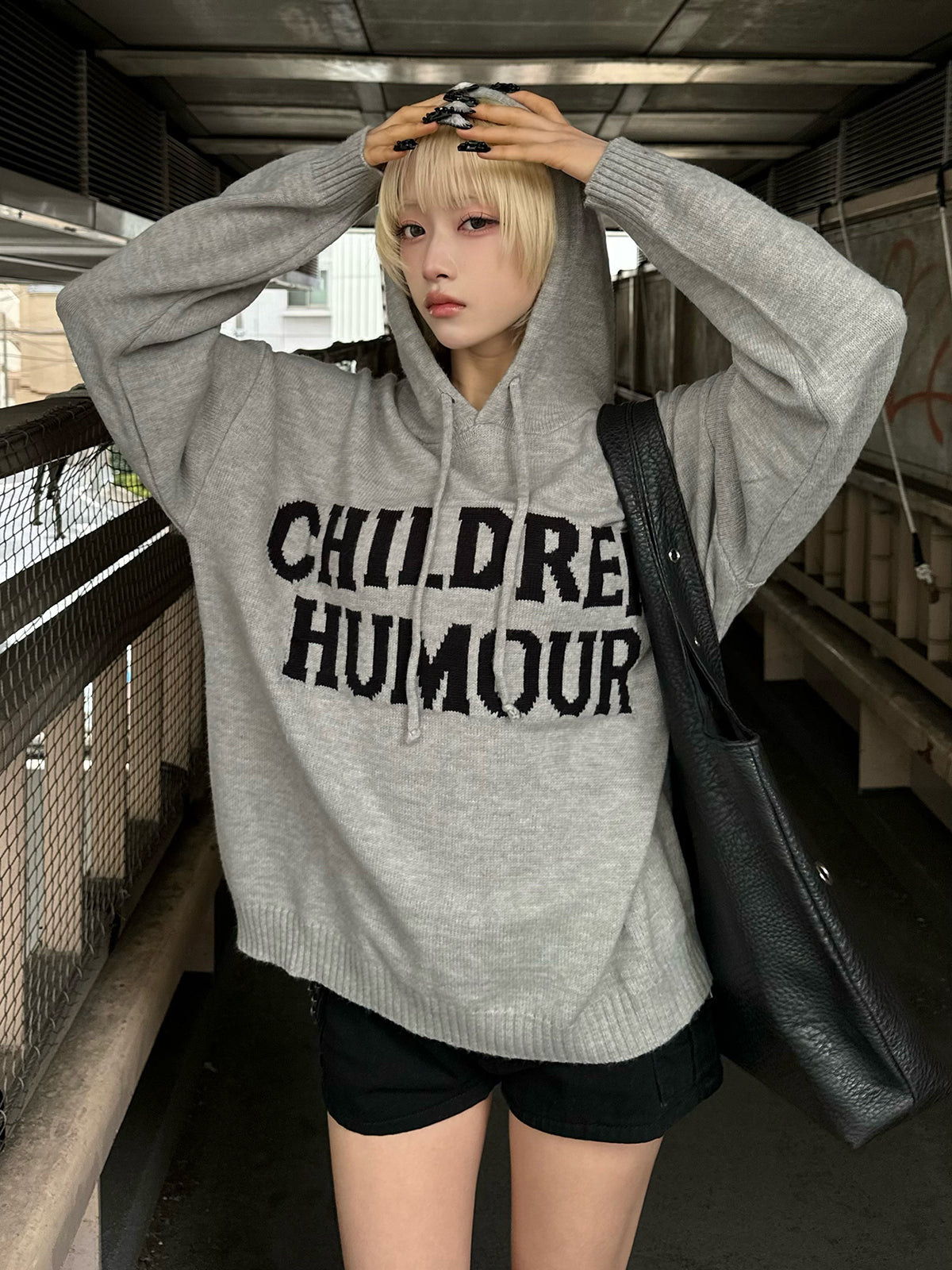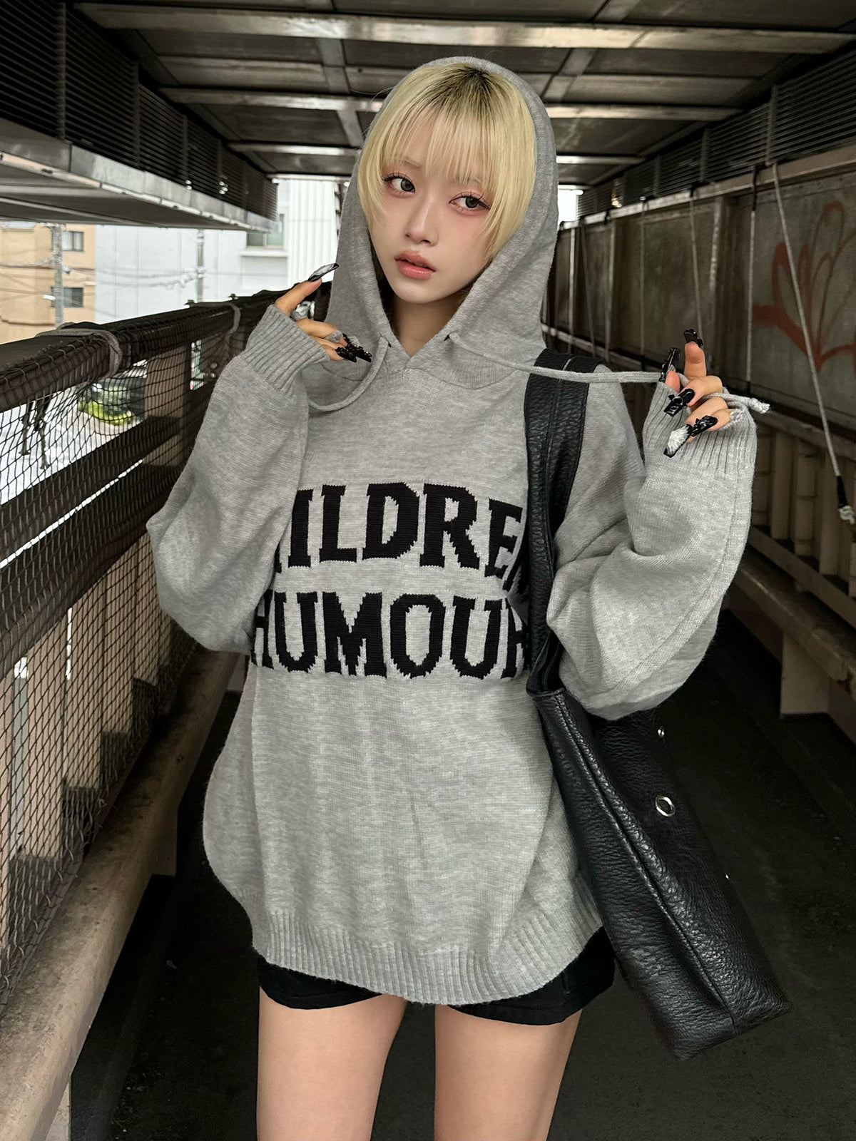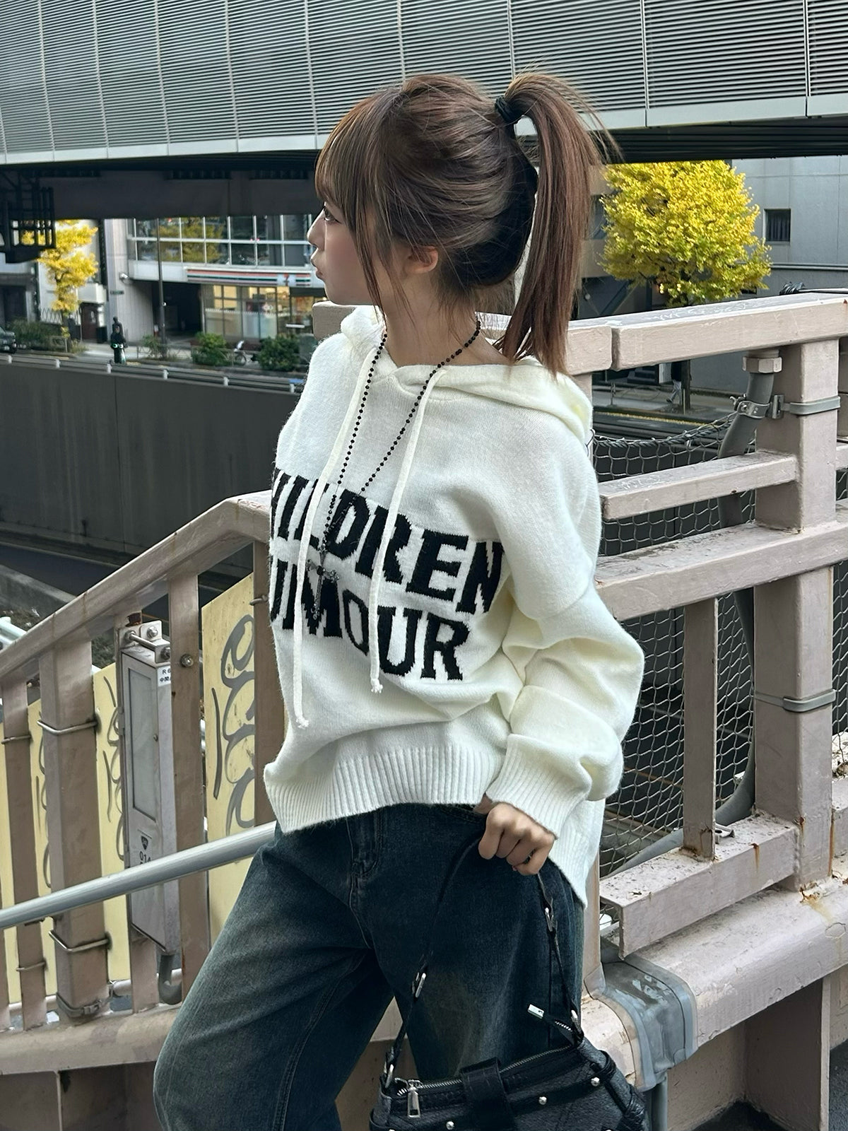 ゆったりとしたシルエットとフード付きのデザインで、ラフに着られるフーディーニット。