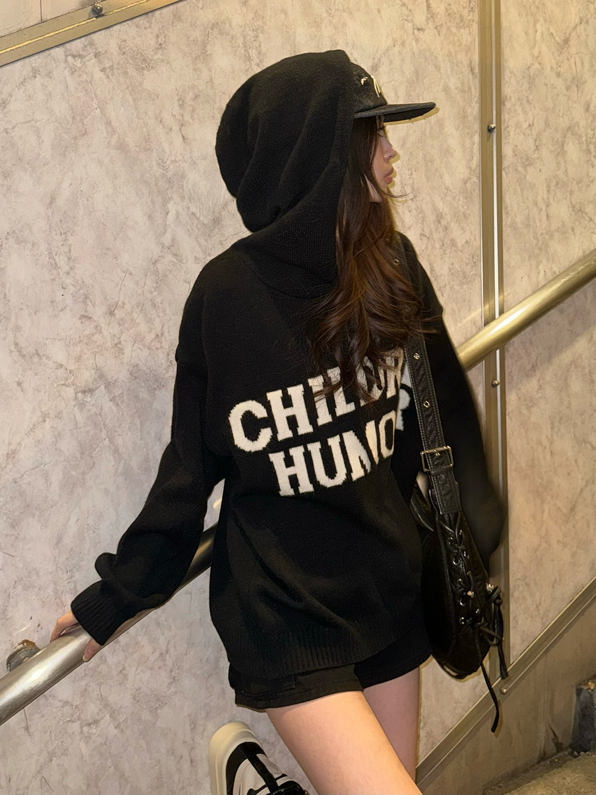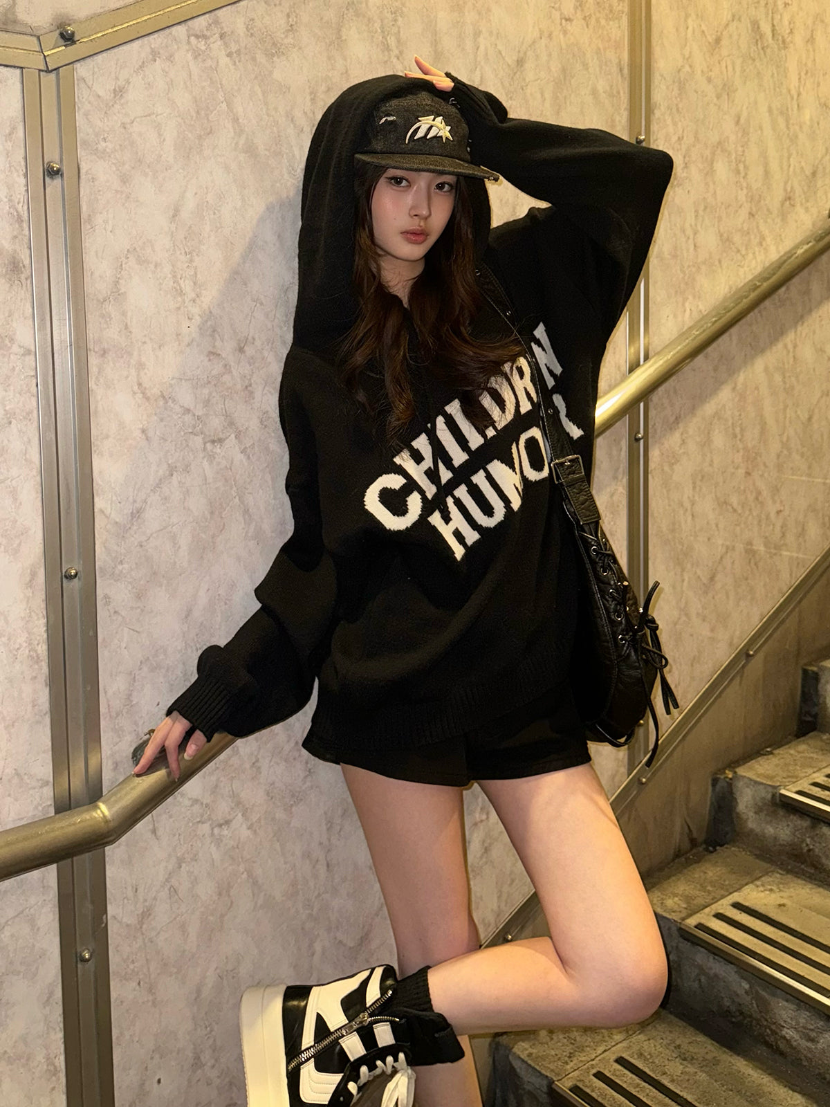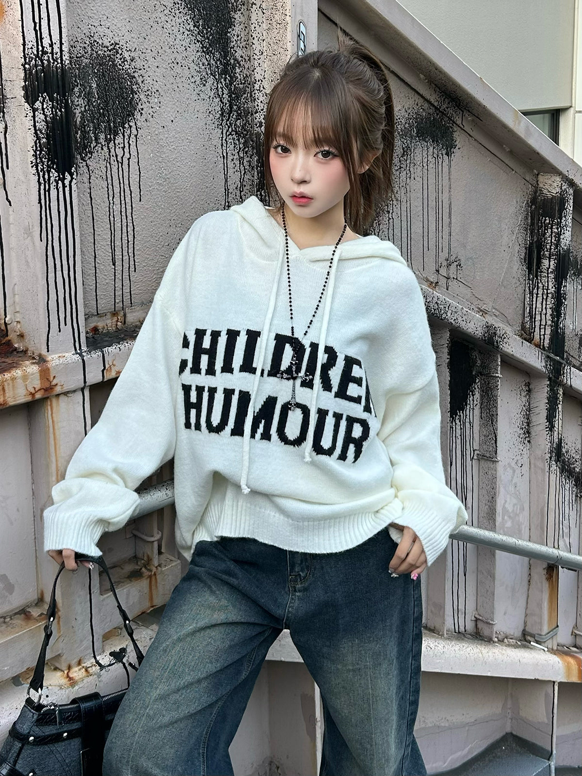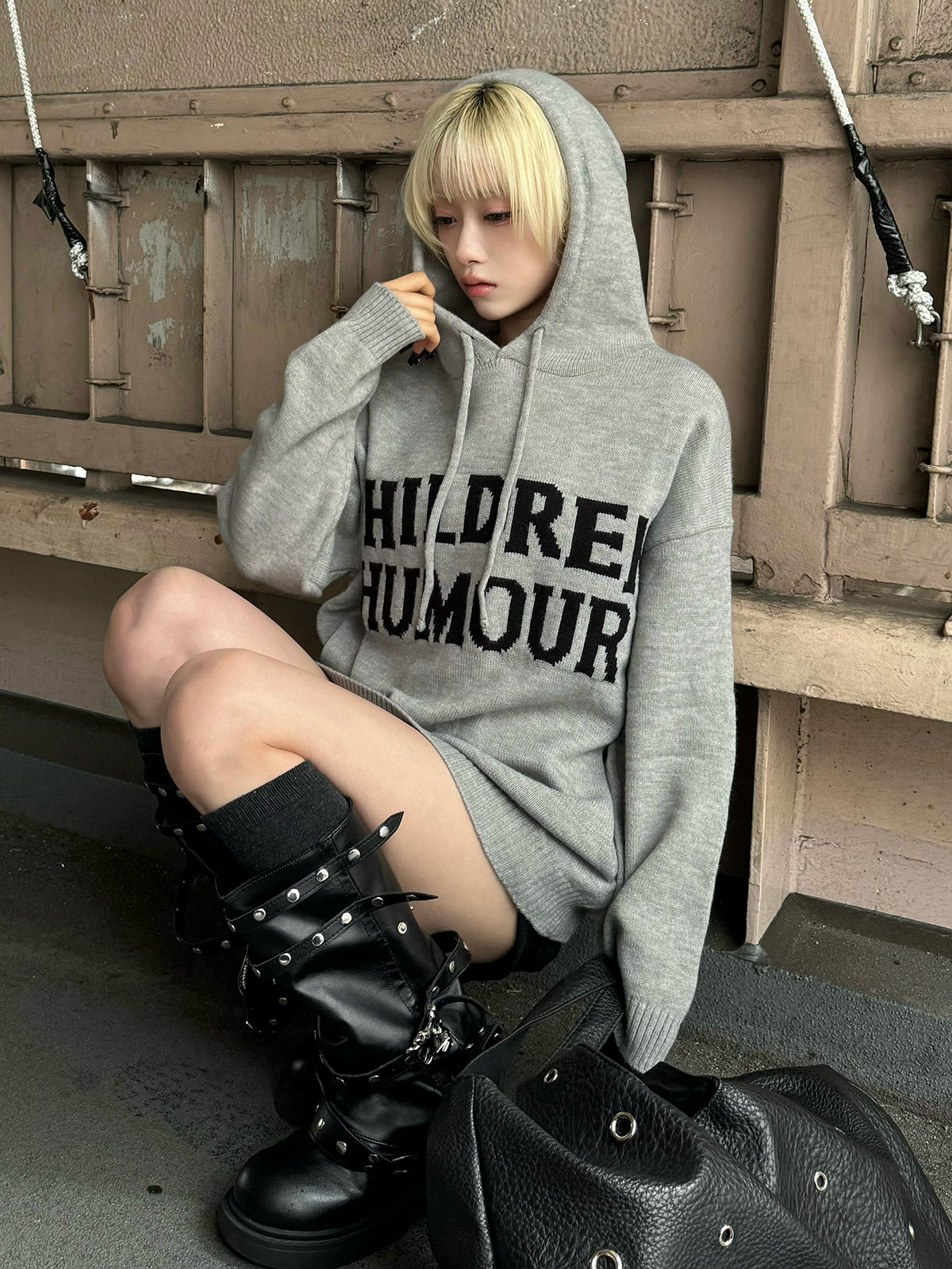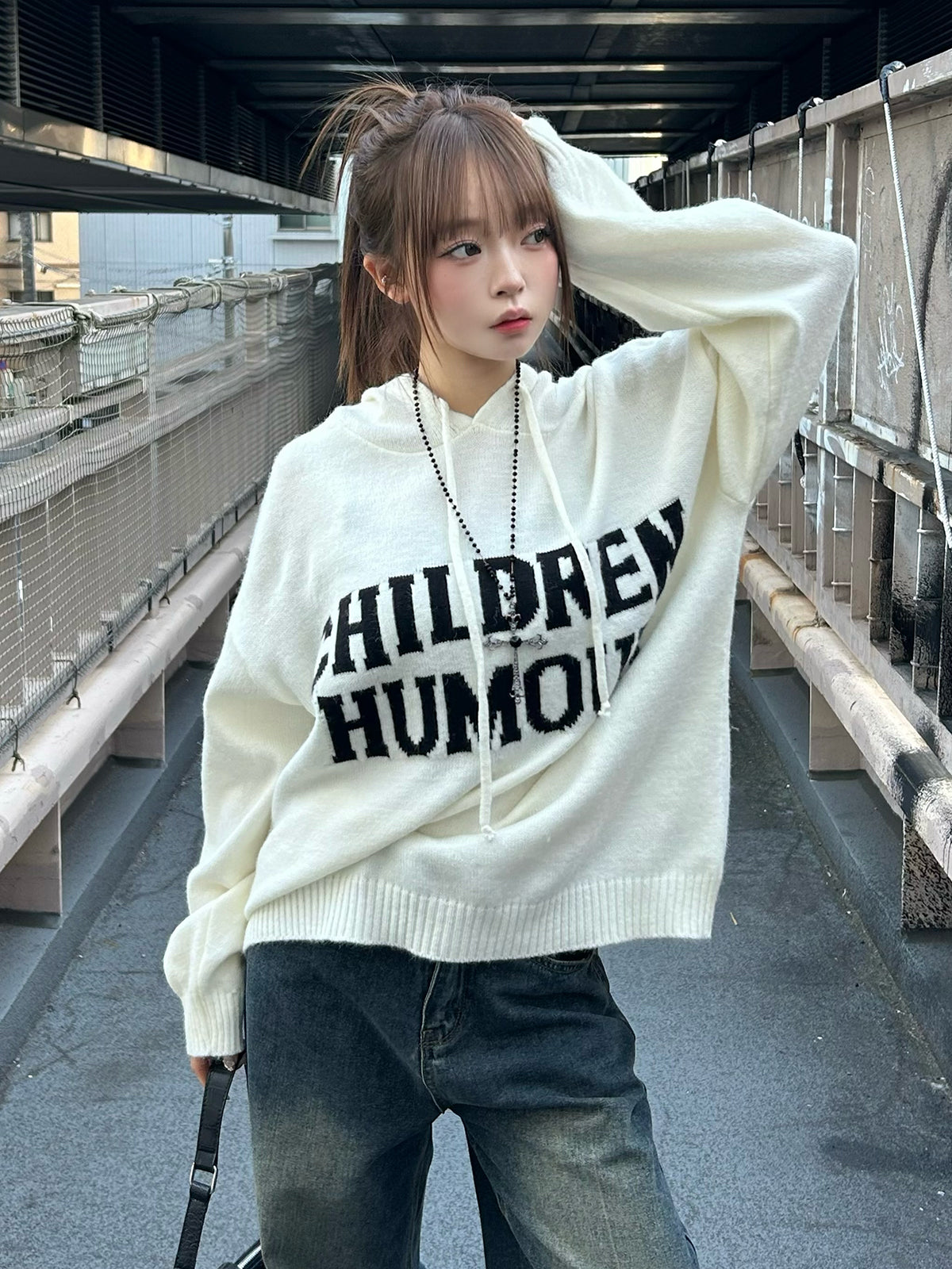 ゆったりとしたシルエットとフード付きのデザインで、ラフに着られるフーディーニット。