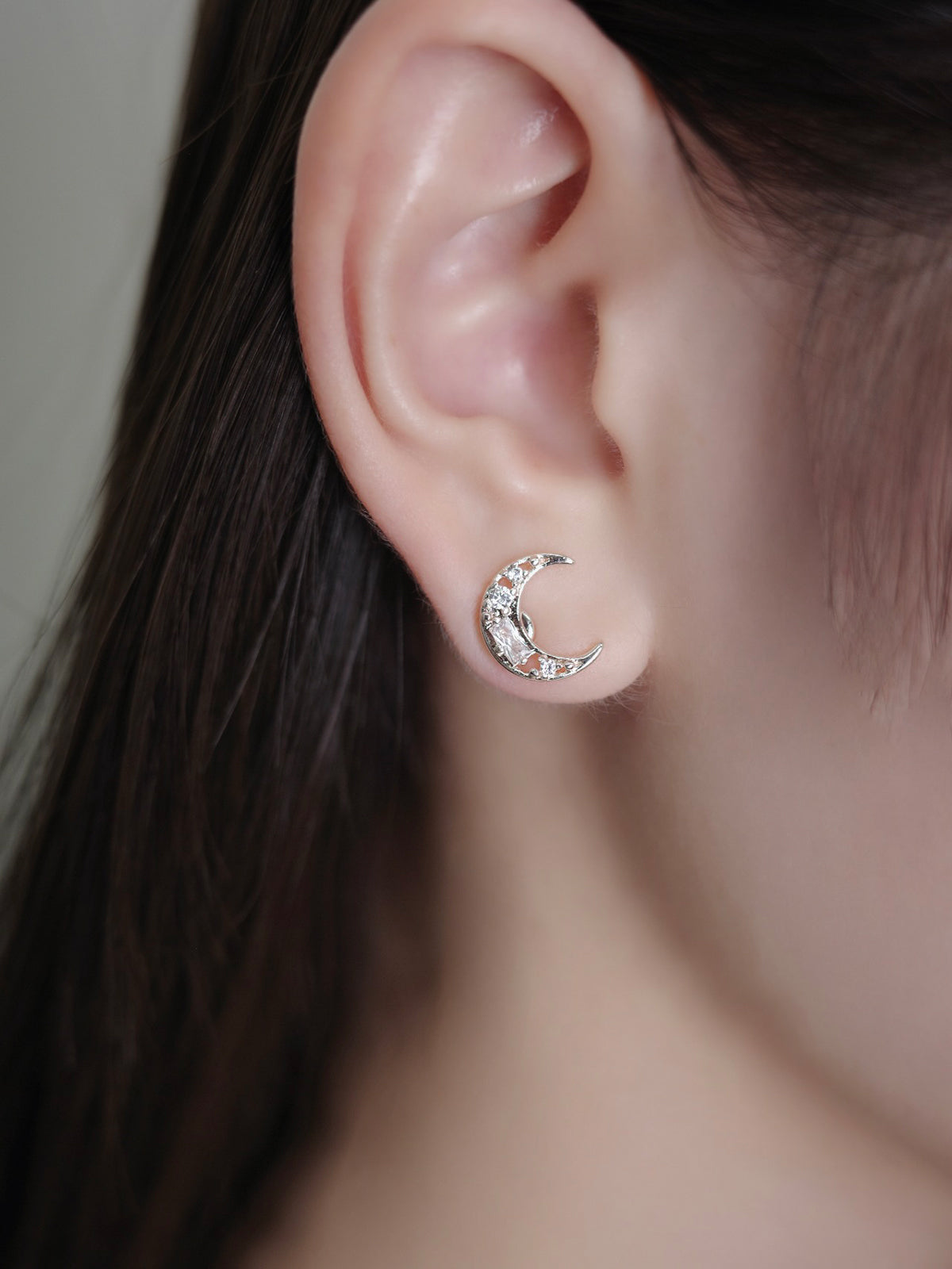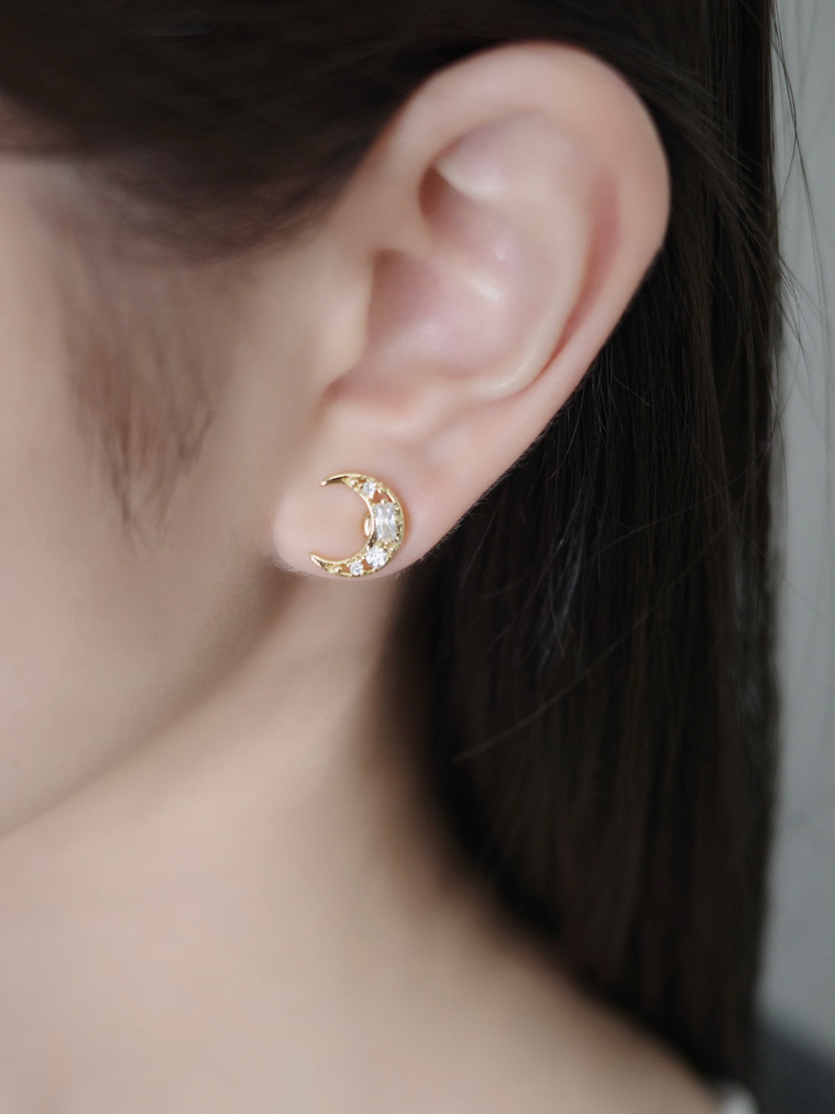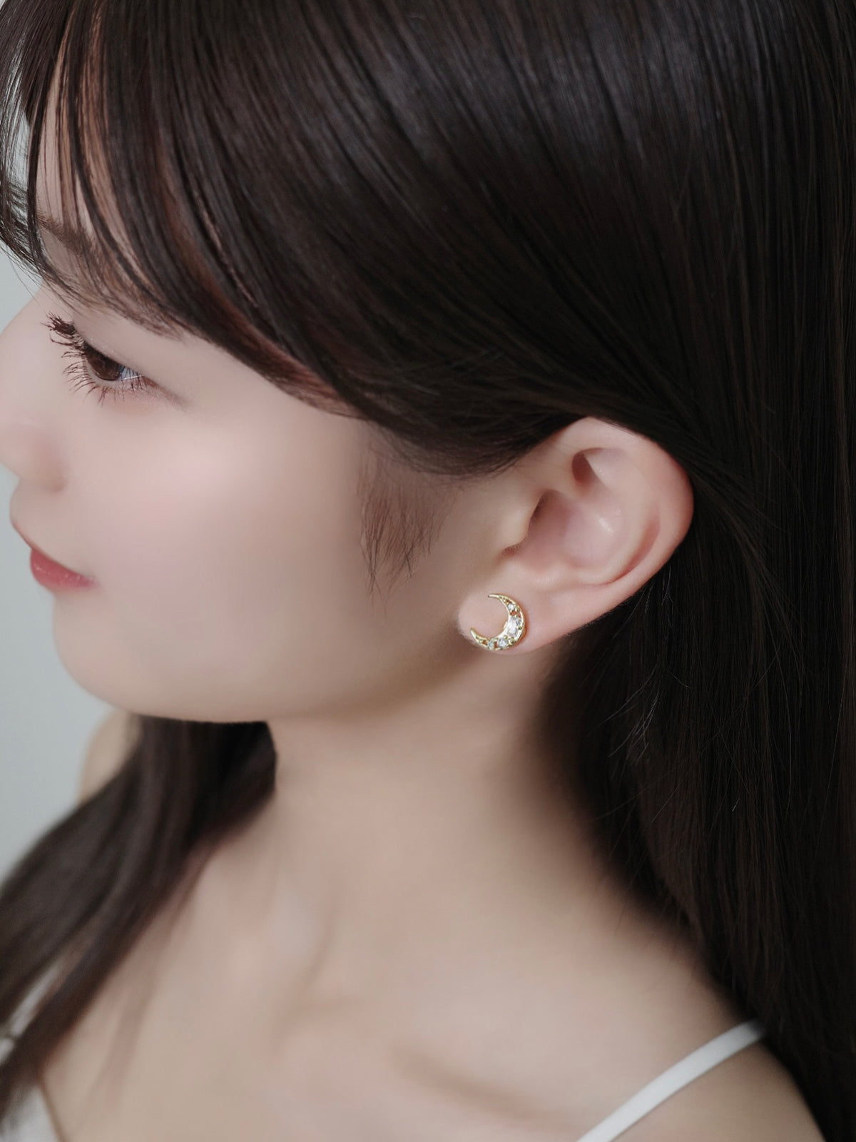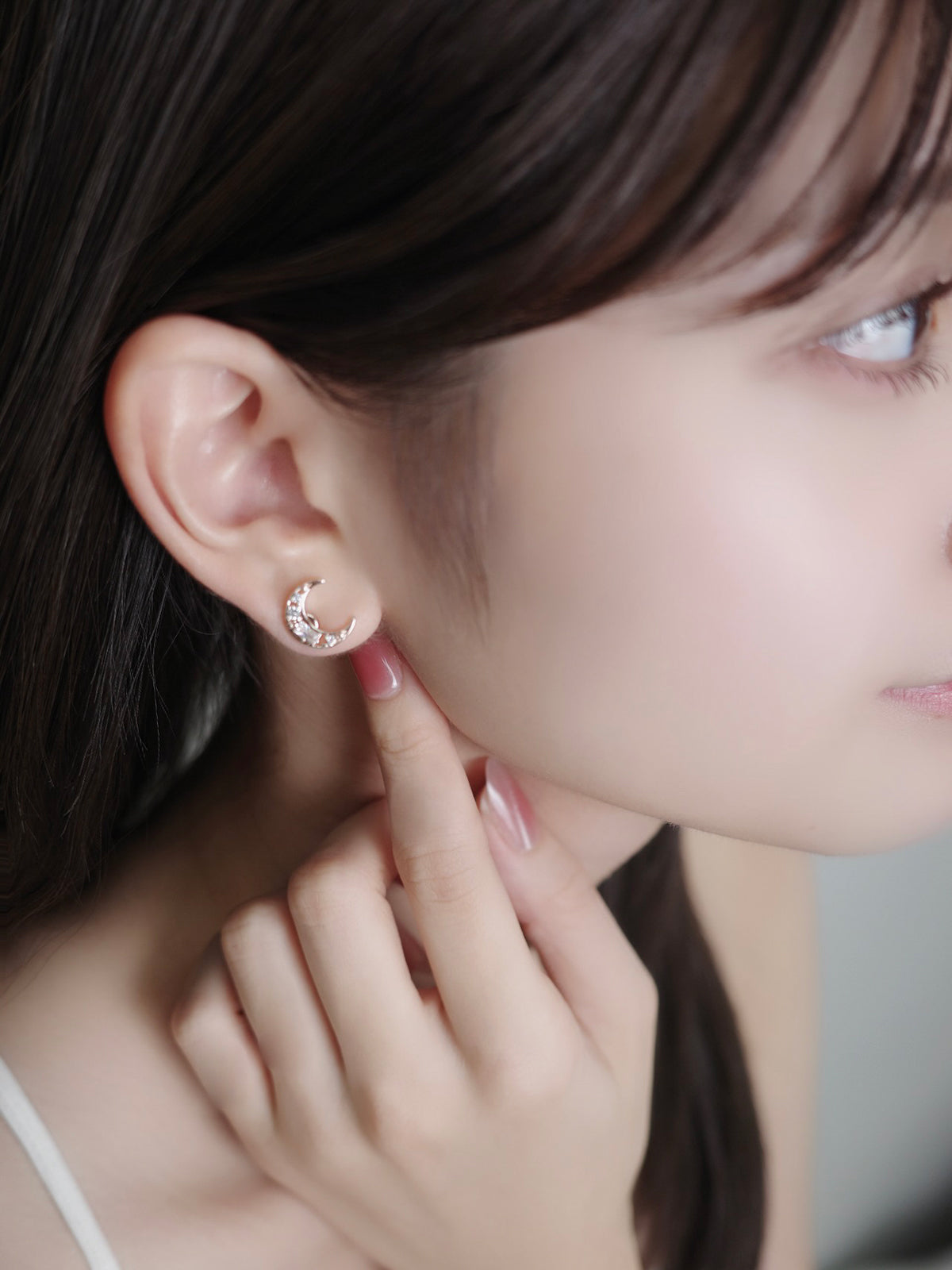 繊細なカーブを描くムーンモチーフに、丸と四角、異なるカットのキュービックジルコニアをバランスよく配置したデザイン。