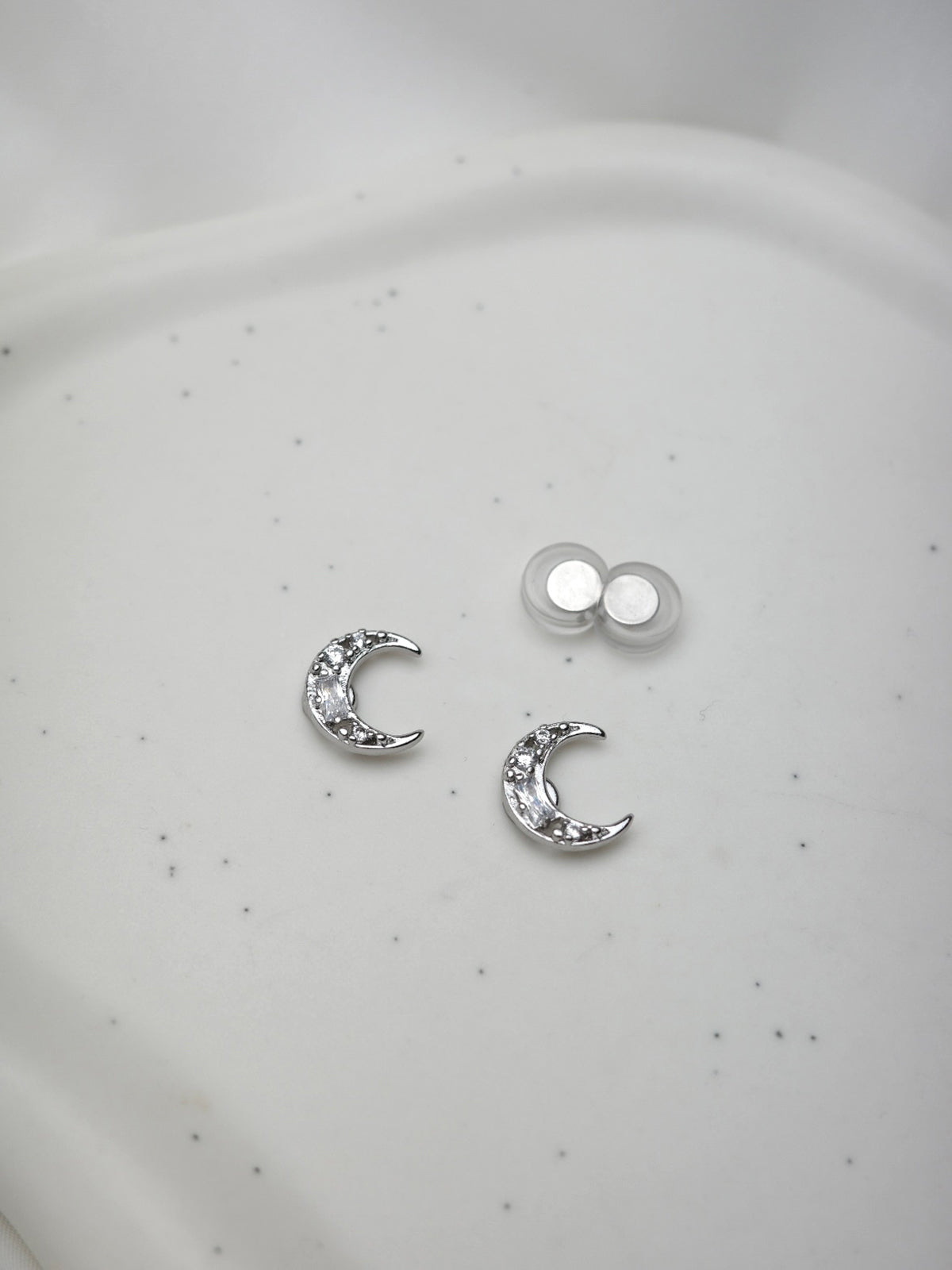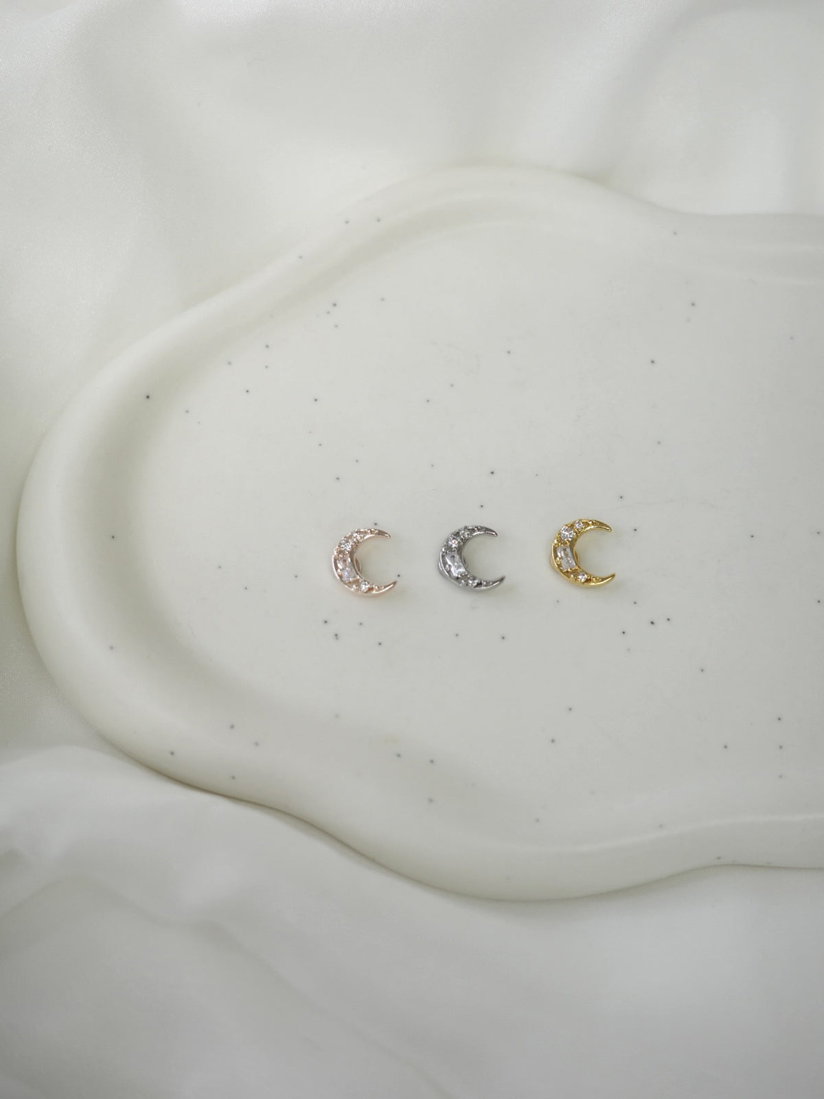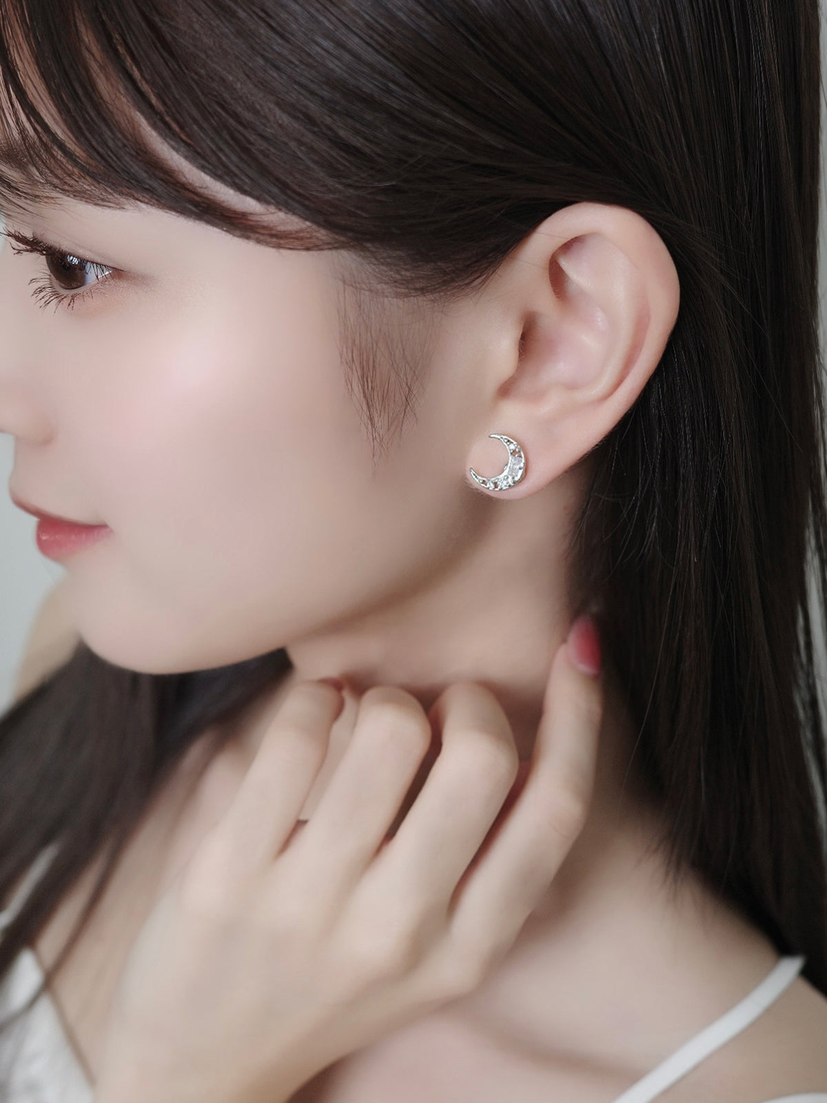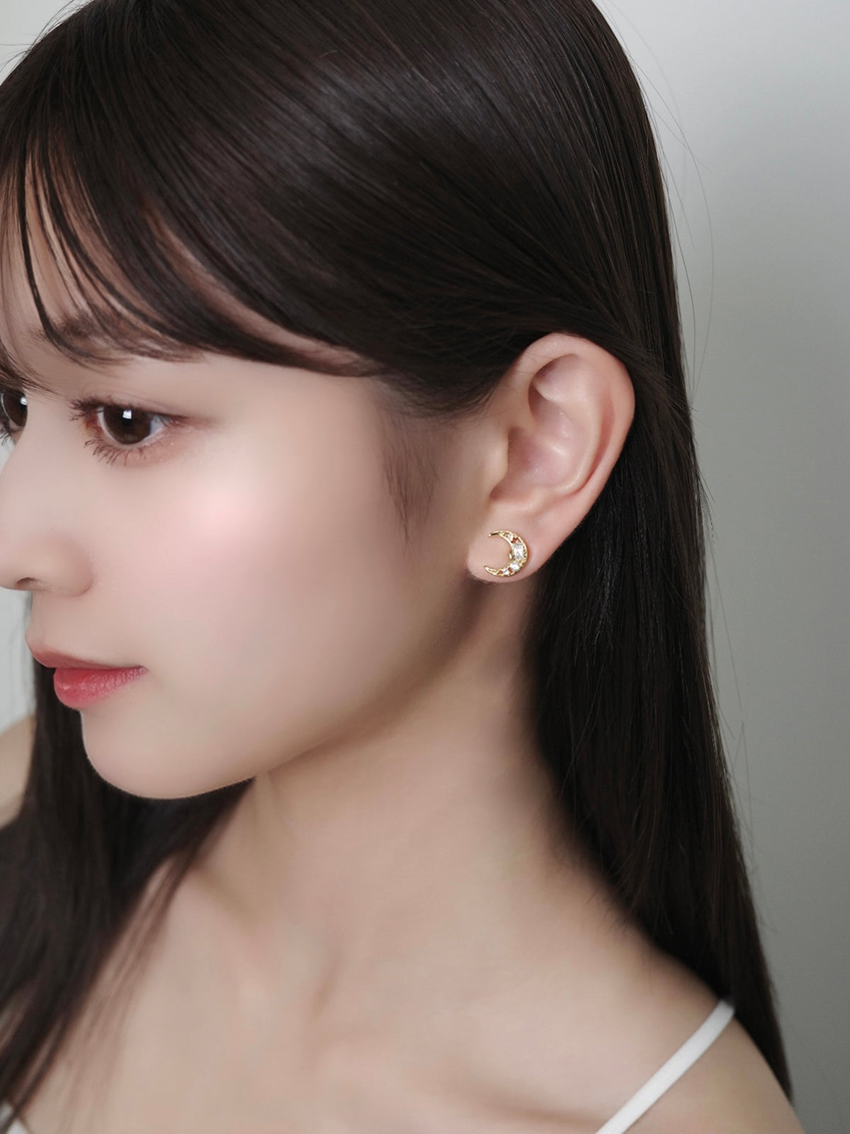繊細なカーブを描くムーンモチーフに、丸と四角、異なるカットのキュービックジルコニアをバランスよく配置したデザイン。