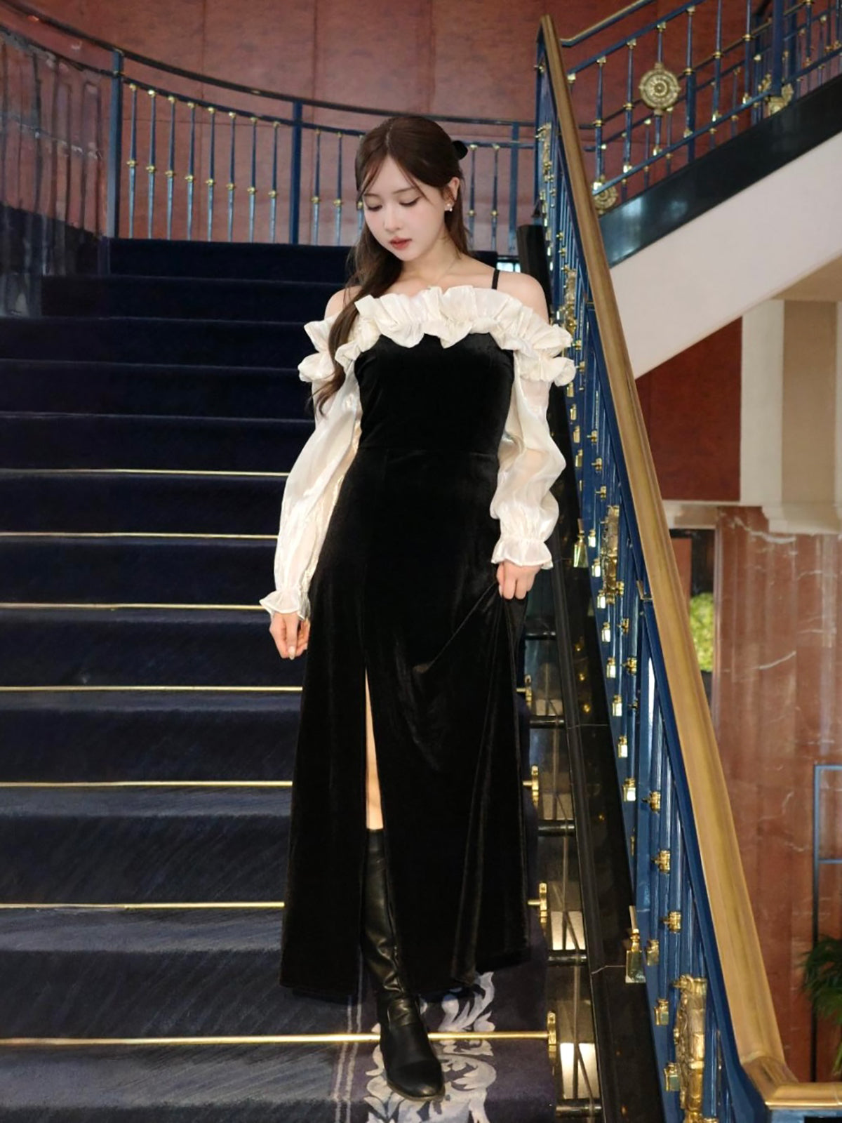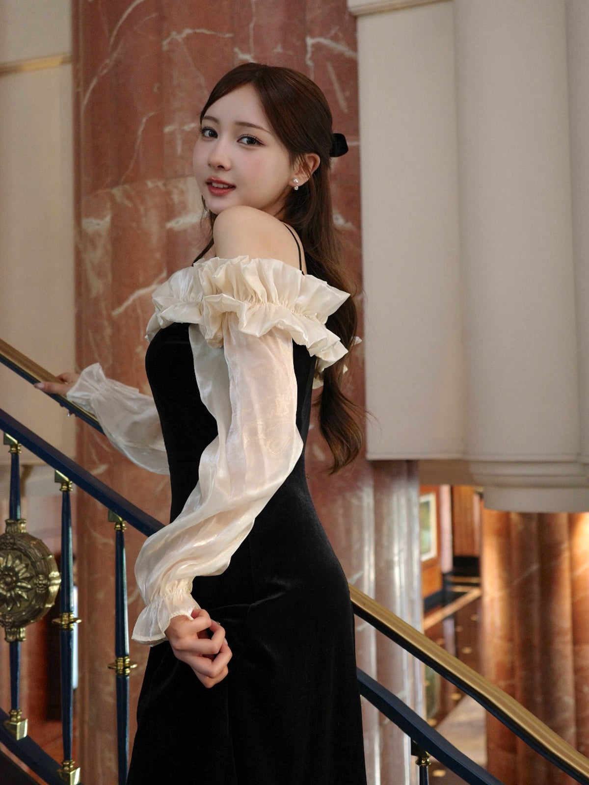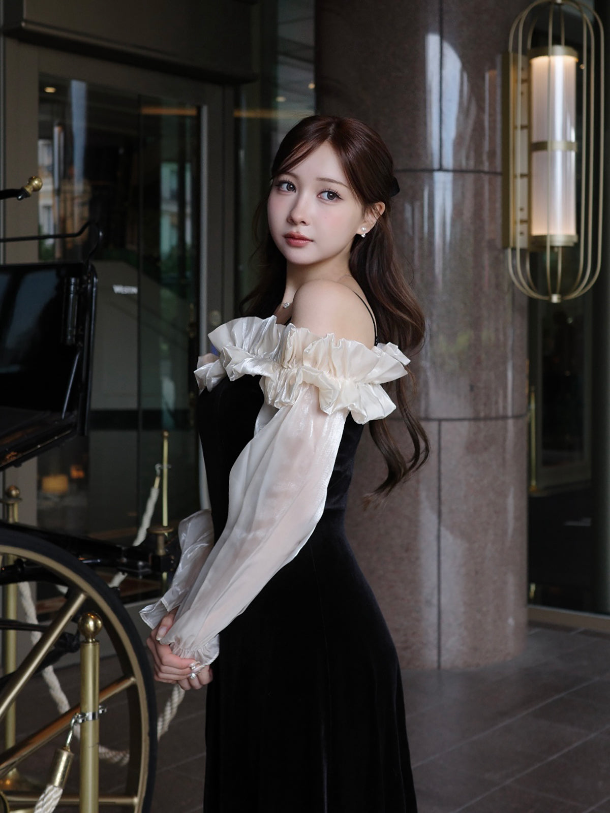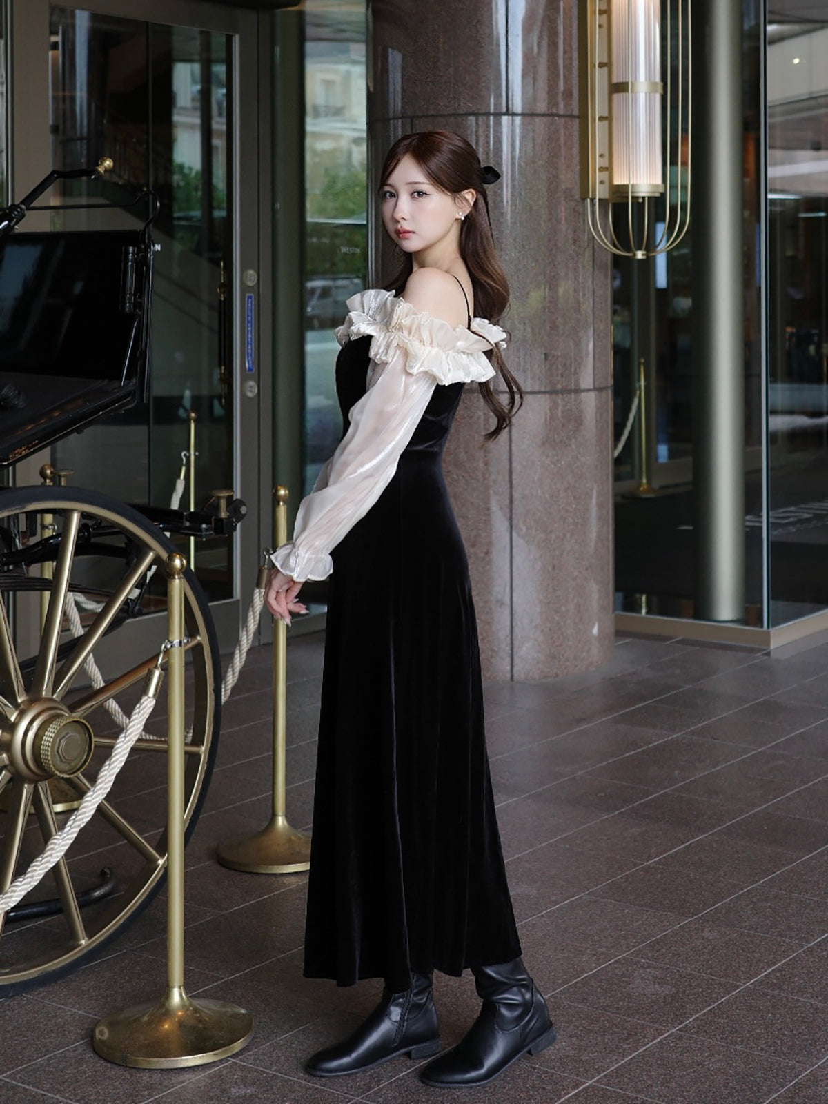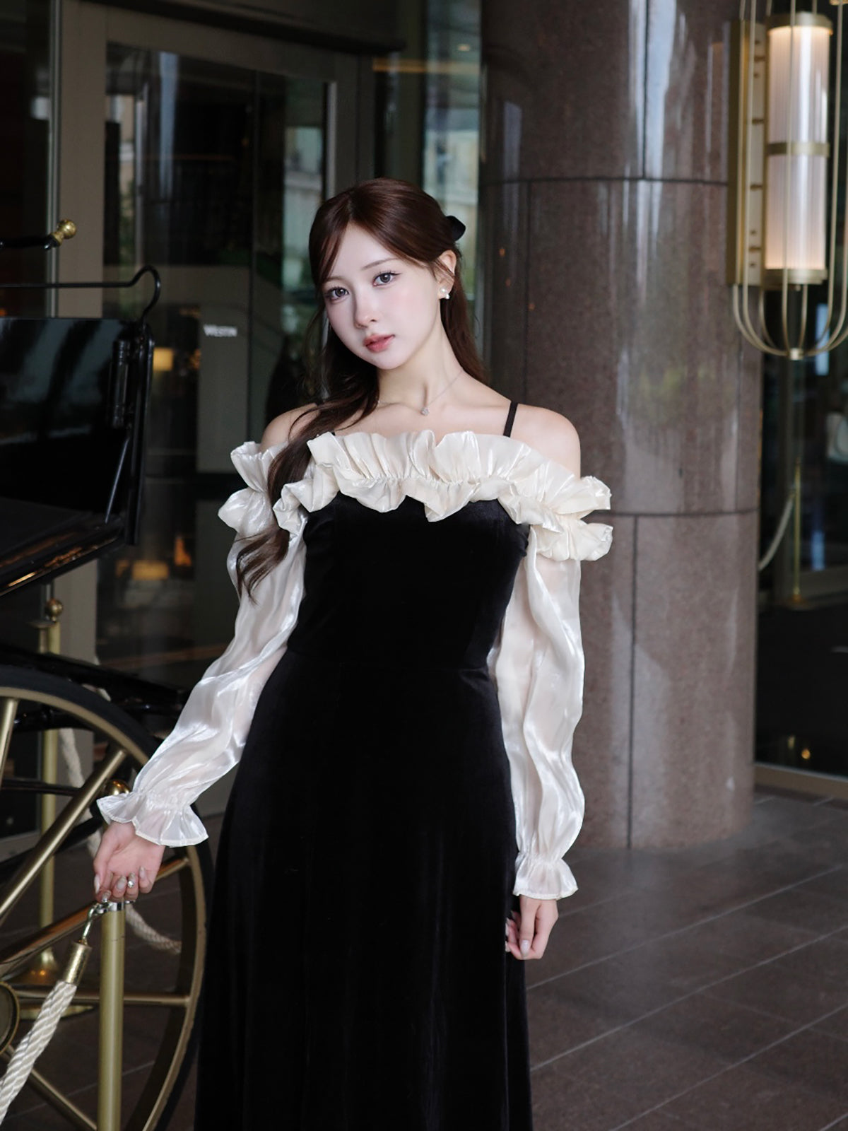 オフショルダーフリルベロアワンピース