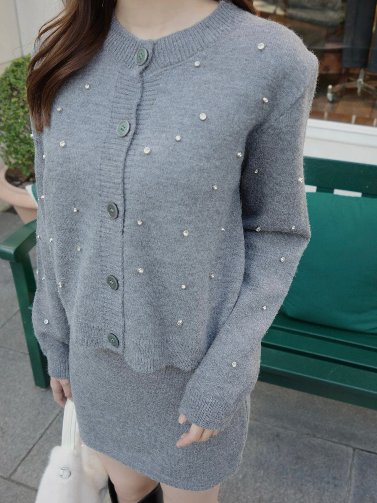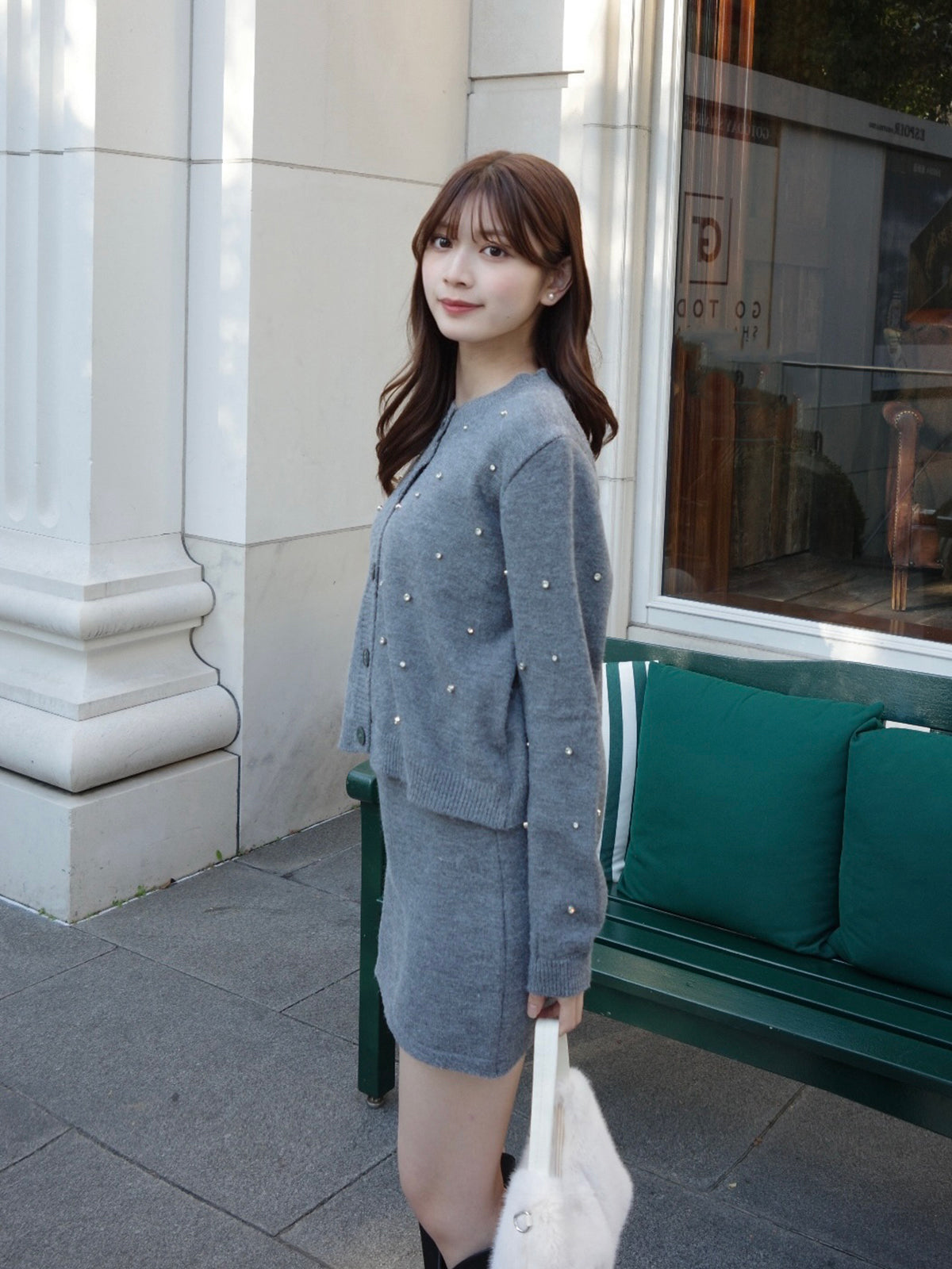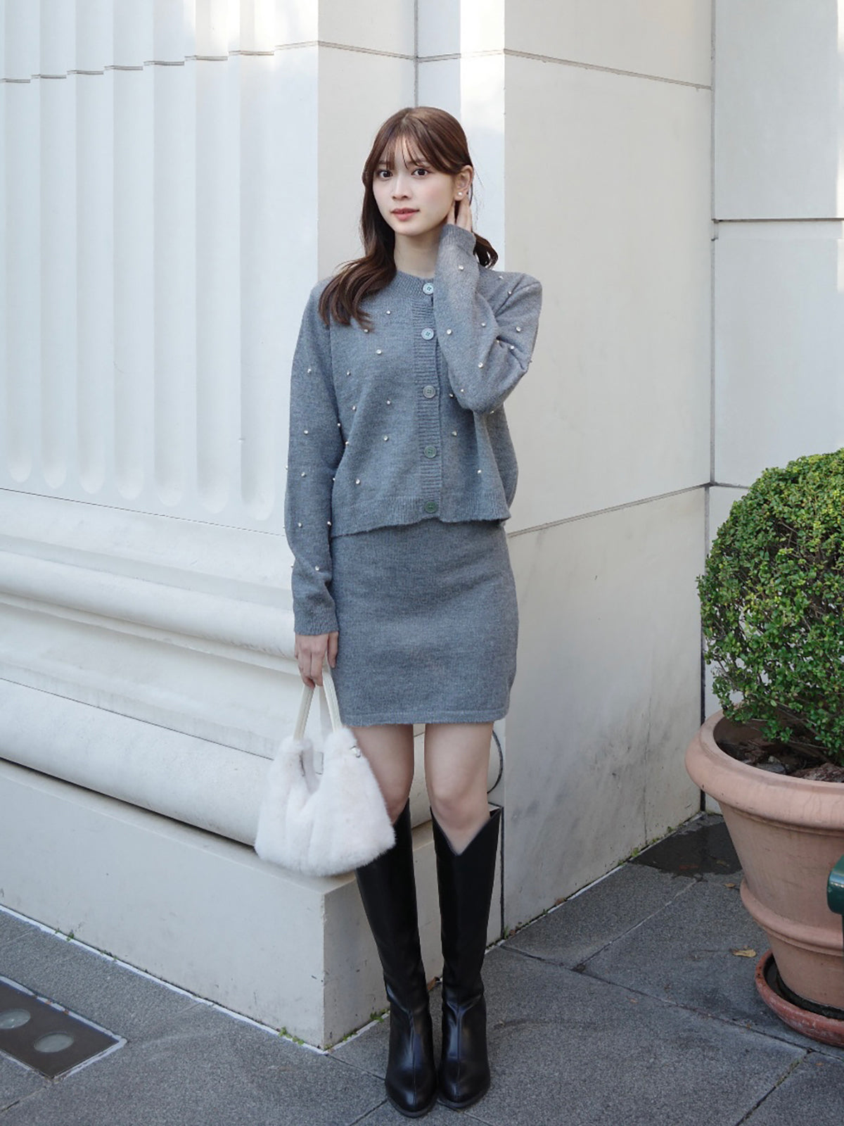 ラインストーンがきらめく、トレンド感たっぷりのカーディガンとスカートのセットアップ。