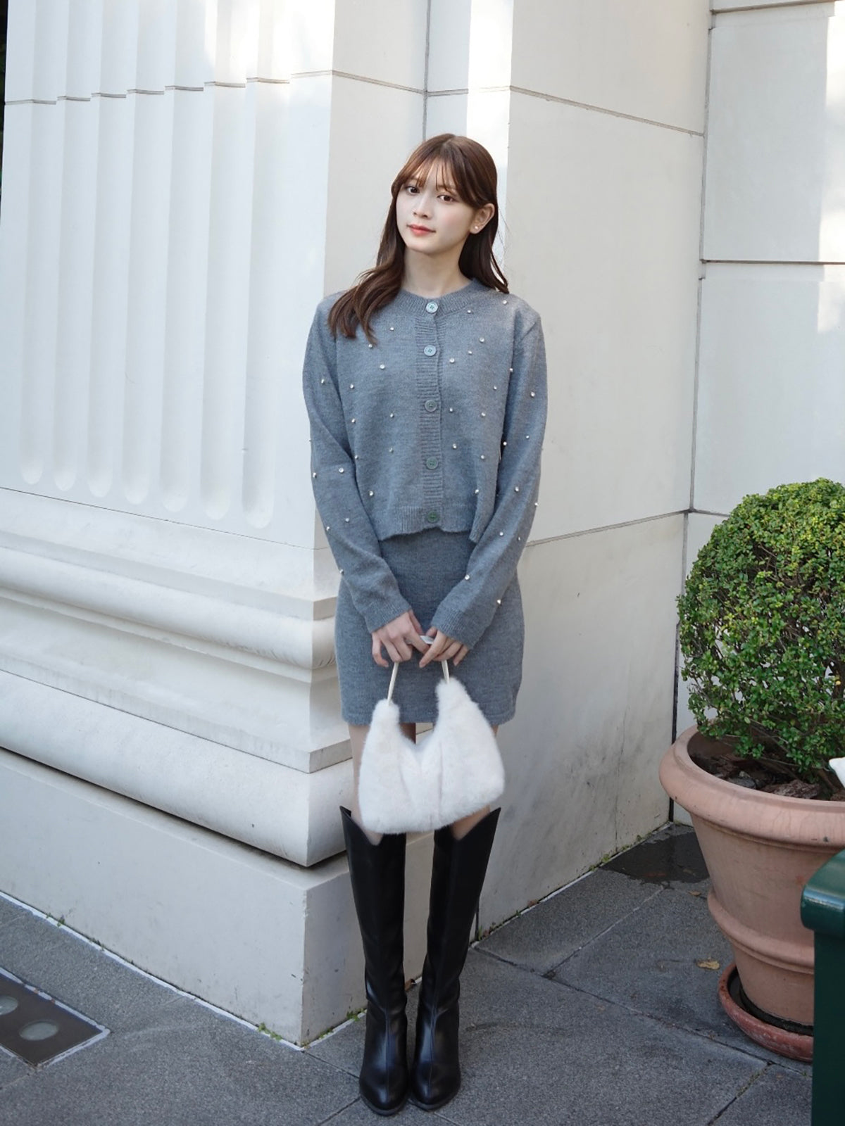 華やかなラインストーンがポイントのカーディガンは、羽織るだけで存在感抜群。