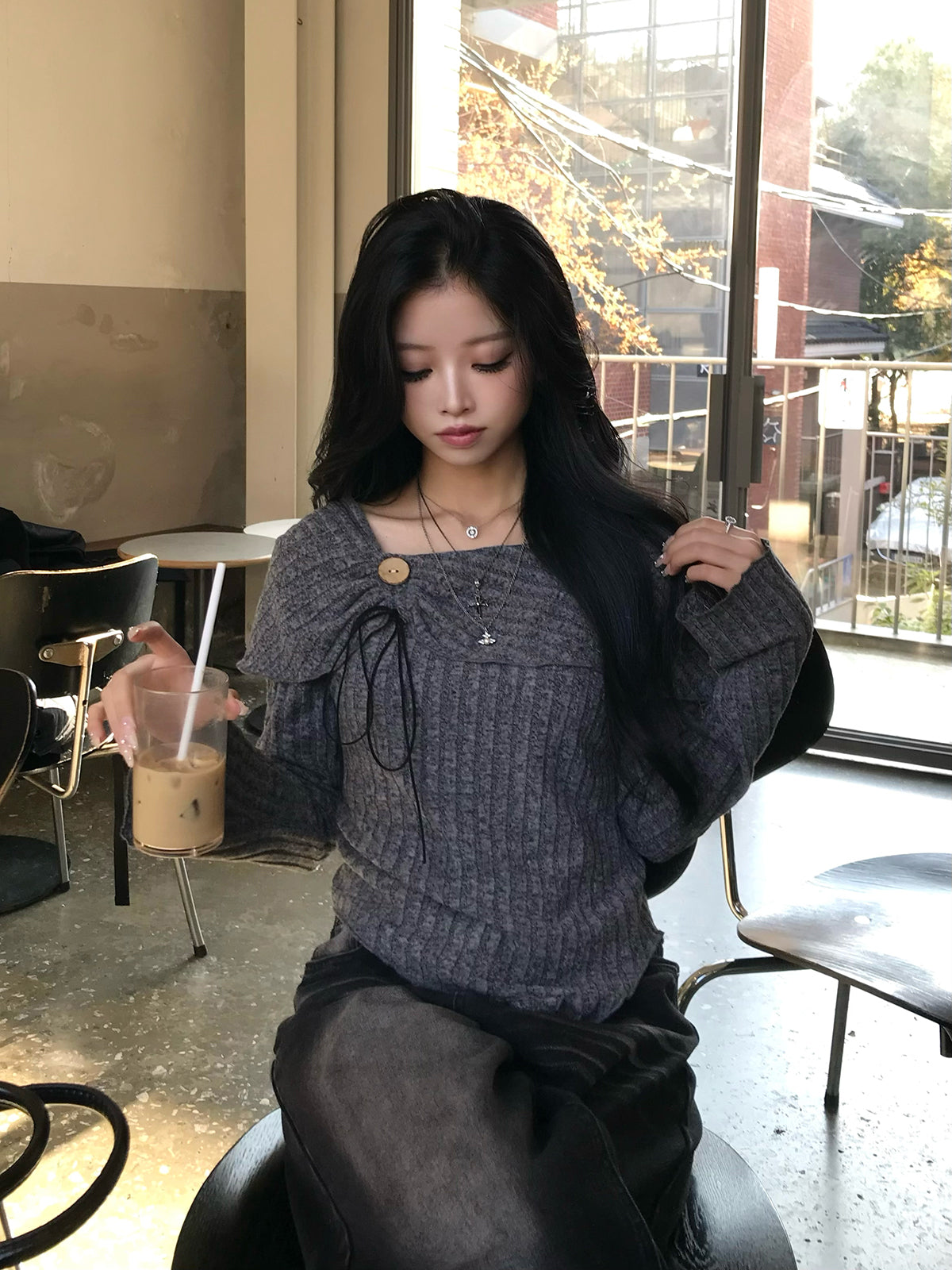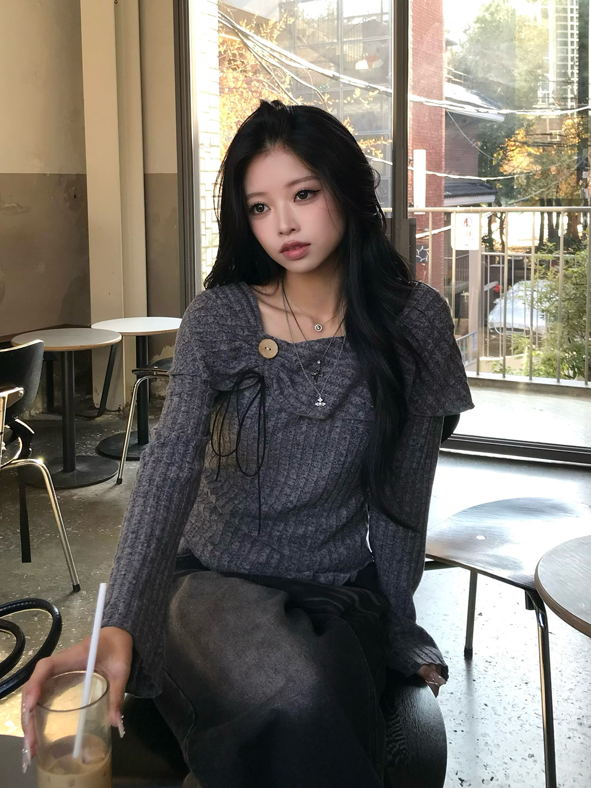 胸元に施したボタンと細リボンが、さりげなく視線を引き寄せるデザインカットソー。