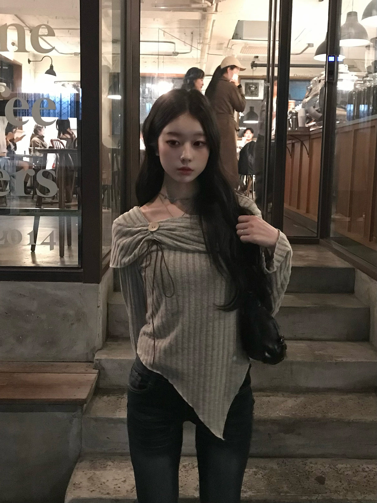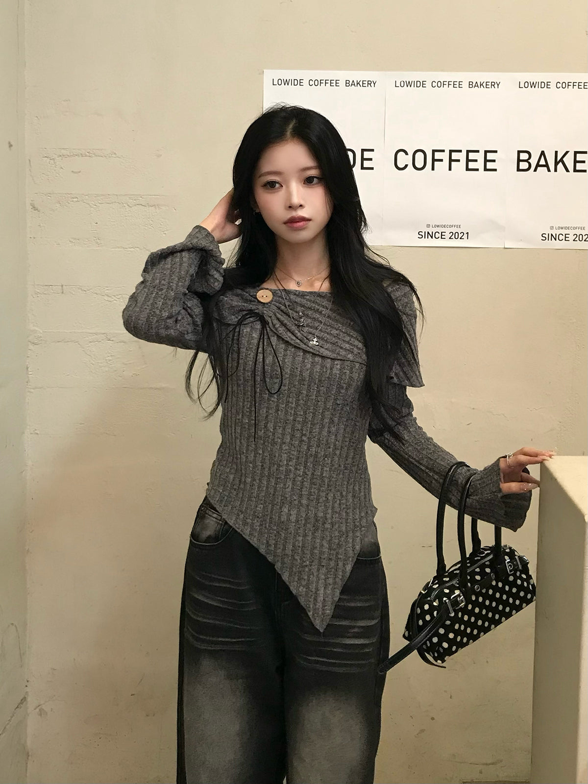 デコルテをきれいに見せるスクエアネックに、動きの出るアシンメトリー裾を組み合わせ、立体的なラインを演出。