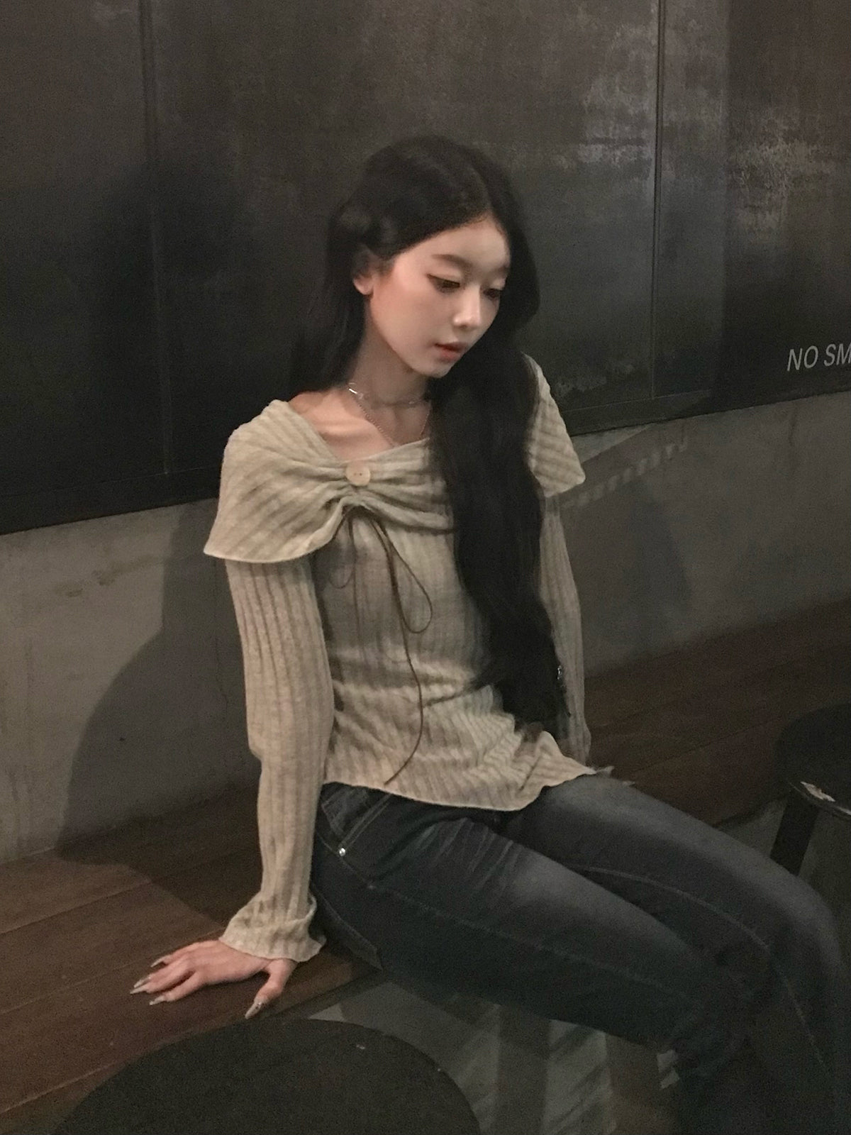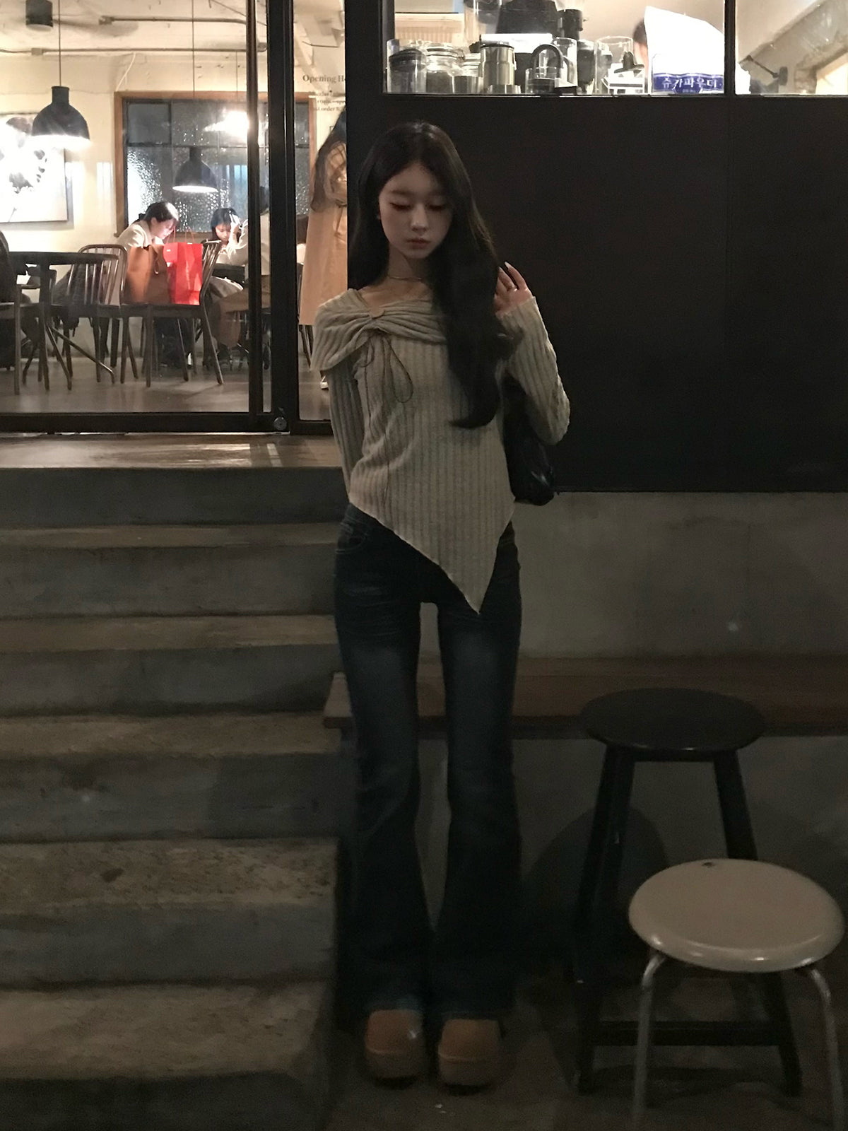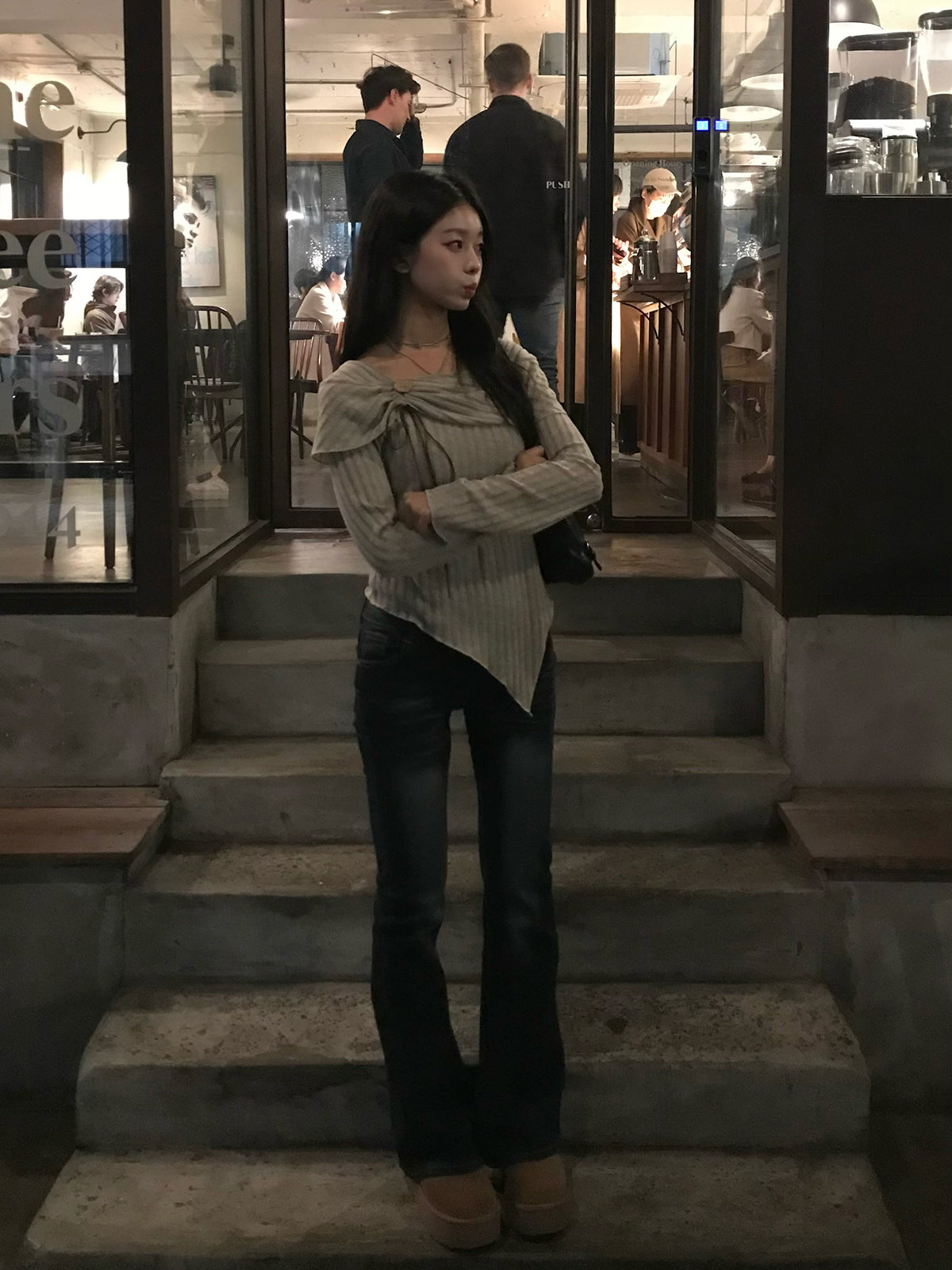 起毛感のある素材とのミックス編みが縦のラインを強調し、すっきりと着こなせる1枚です。