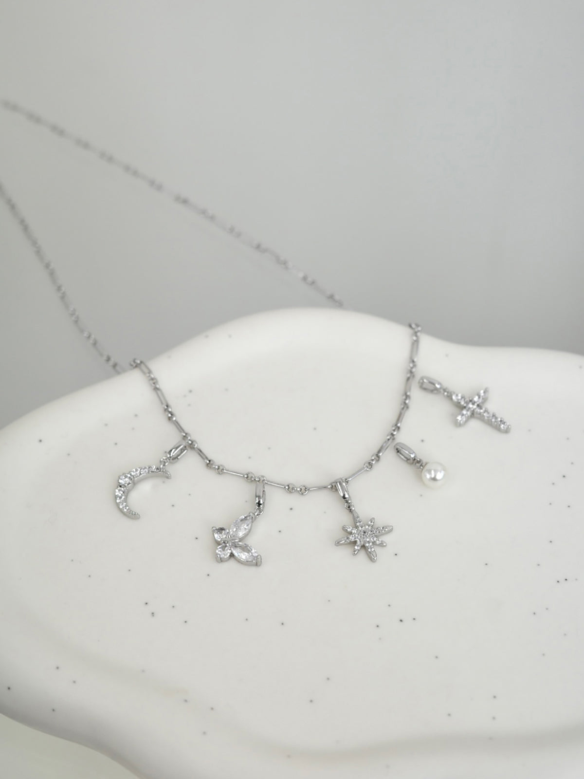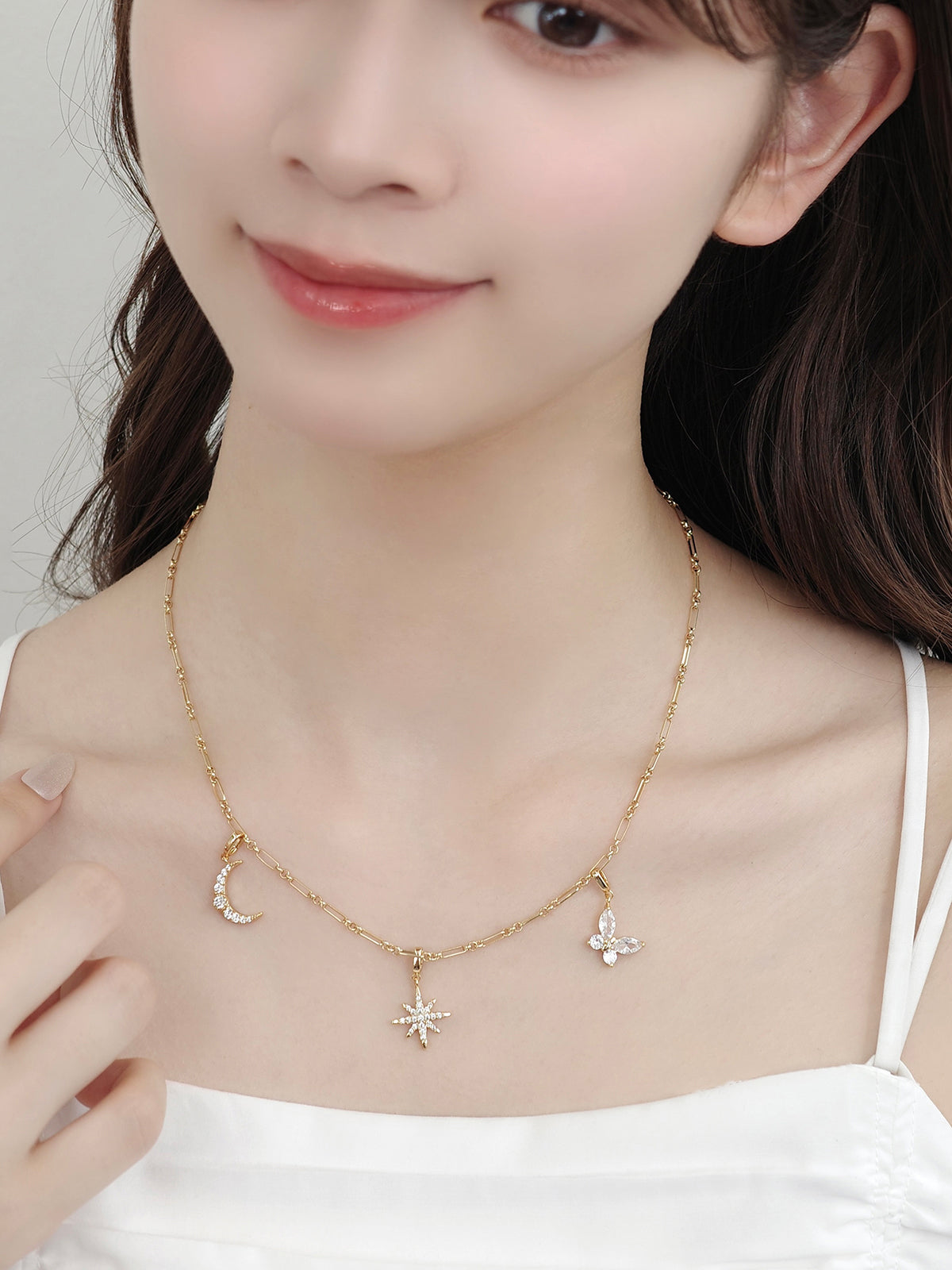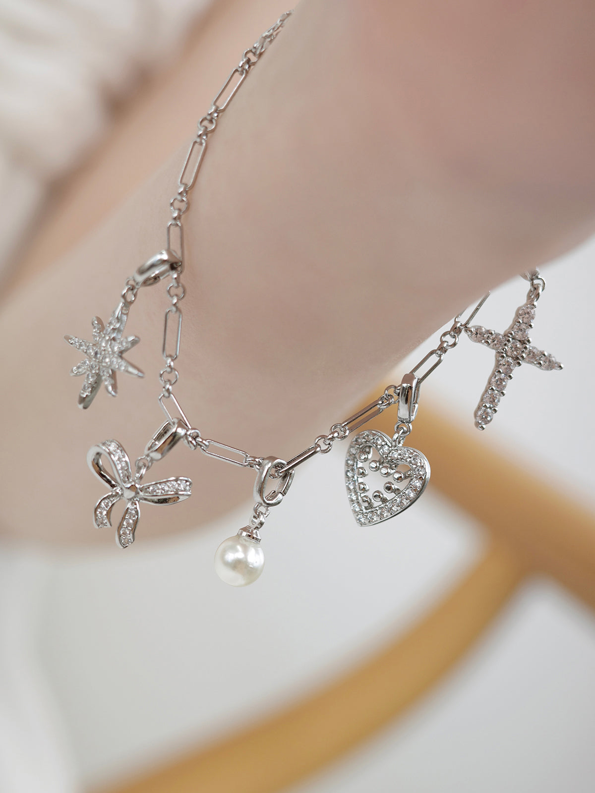 繊細な形状にキュービックジルコニアをあしらい、輝きと華やかさを引き立てるチャーム。