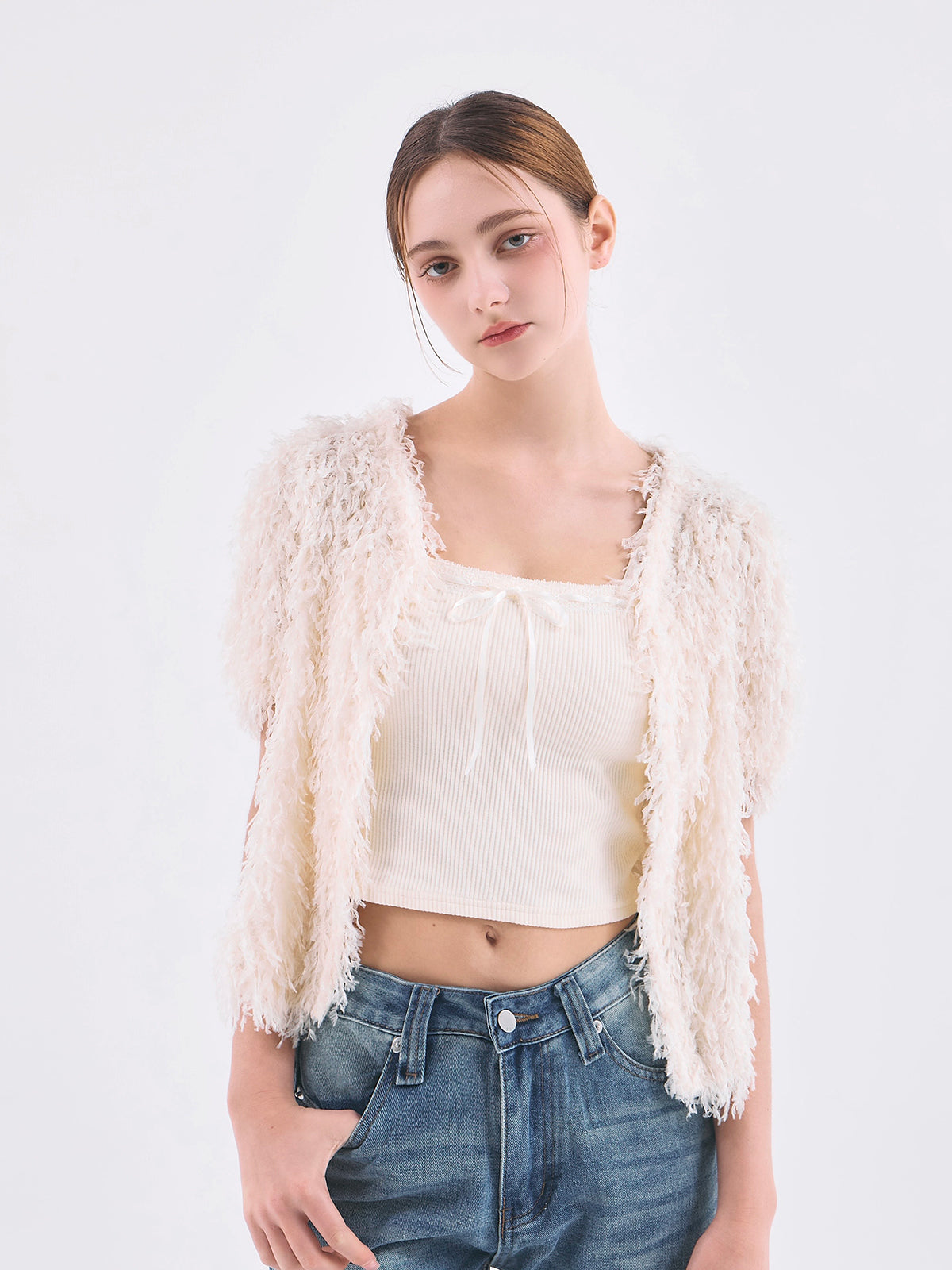 ふんわりとしたフリンジデザインが華やかな、ニットカーディガンとキャミソールのセットアイテム。