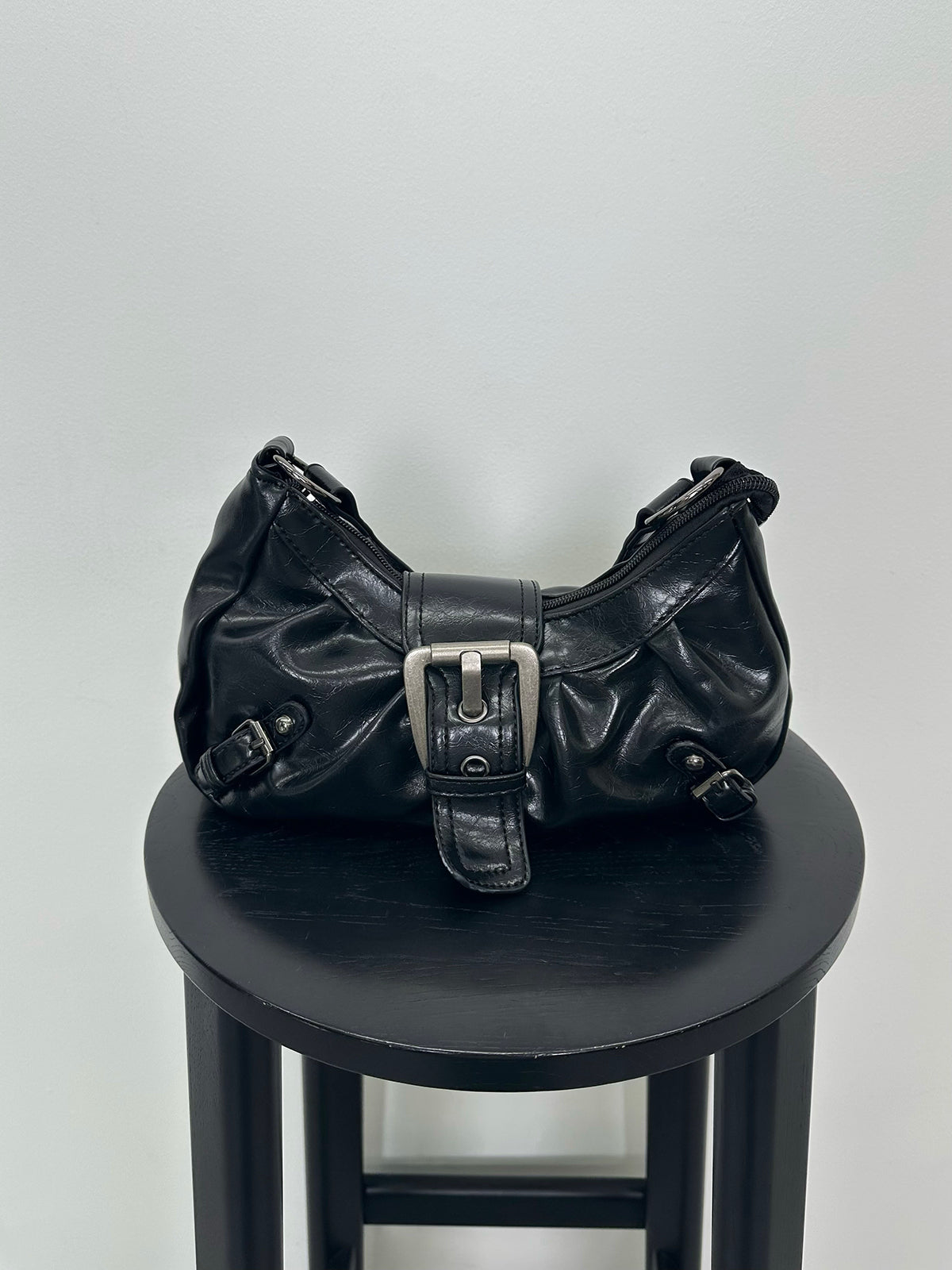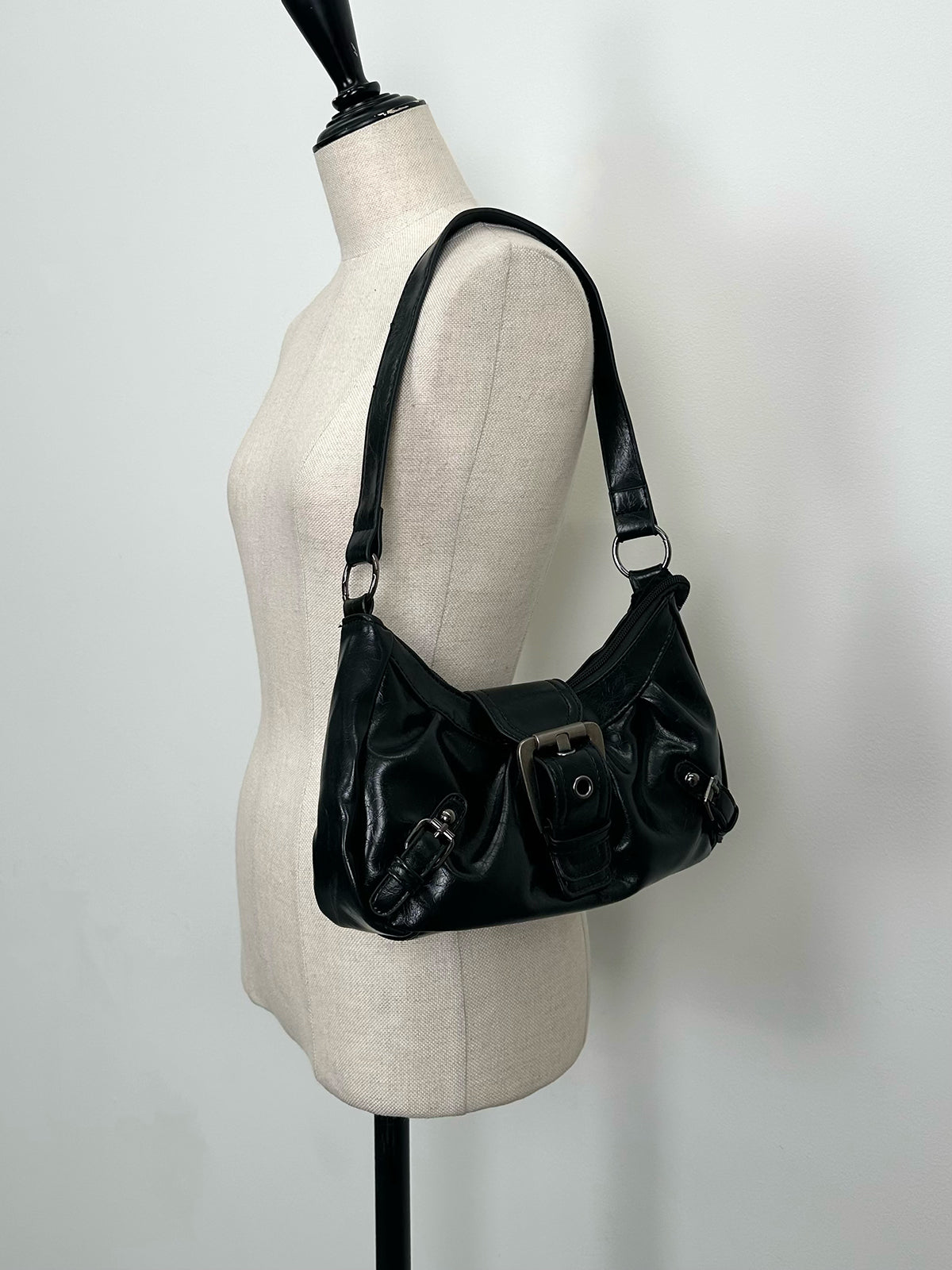 程よいツヤ感のレザータッチ素材に、大きめのメタルバックルをあしらったワンショルバッグ。