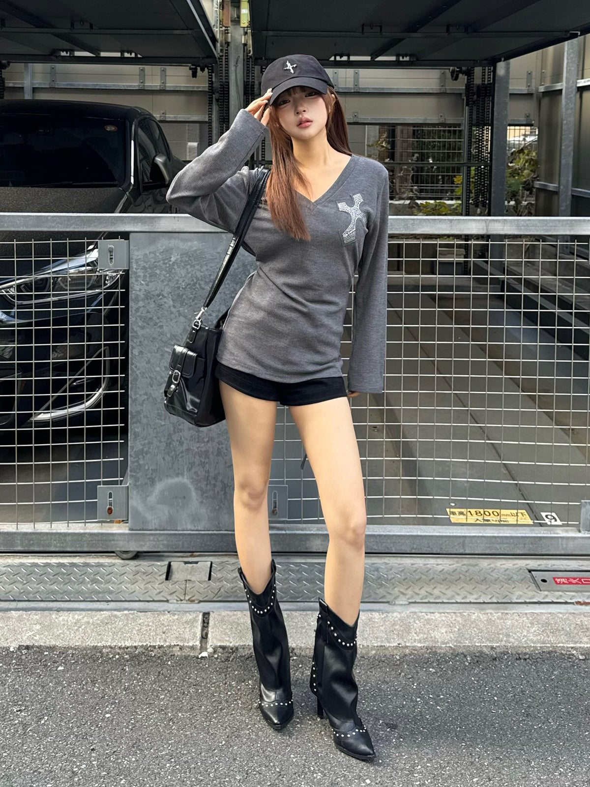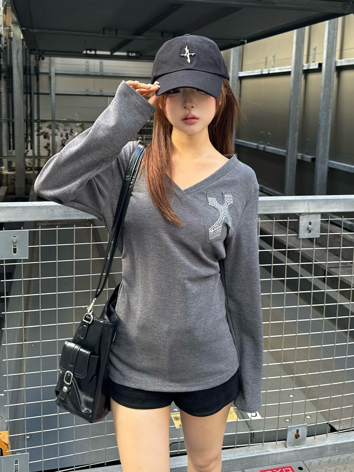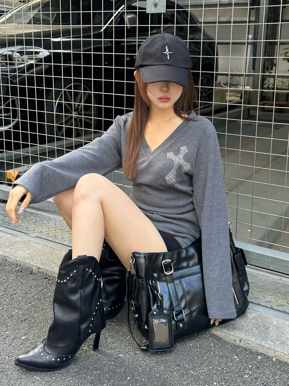 フロントとバックに施したラインストーンのクロスデザインが印象的なVネックカットソー。