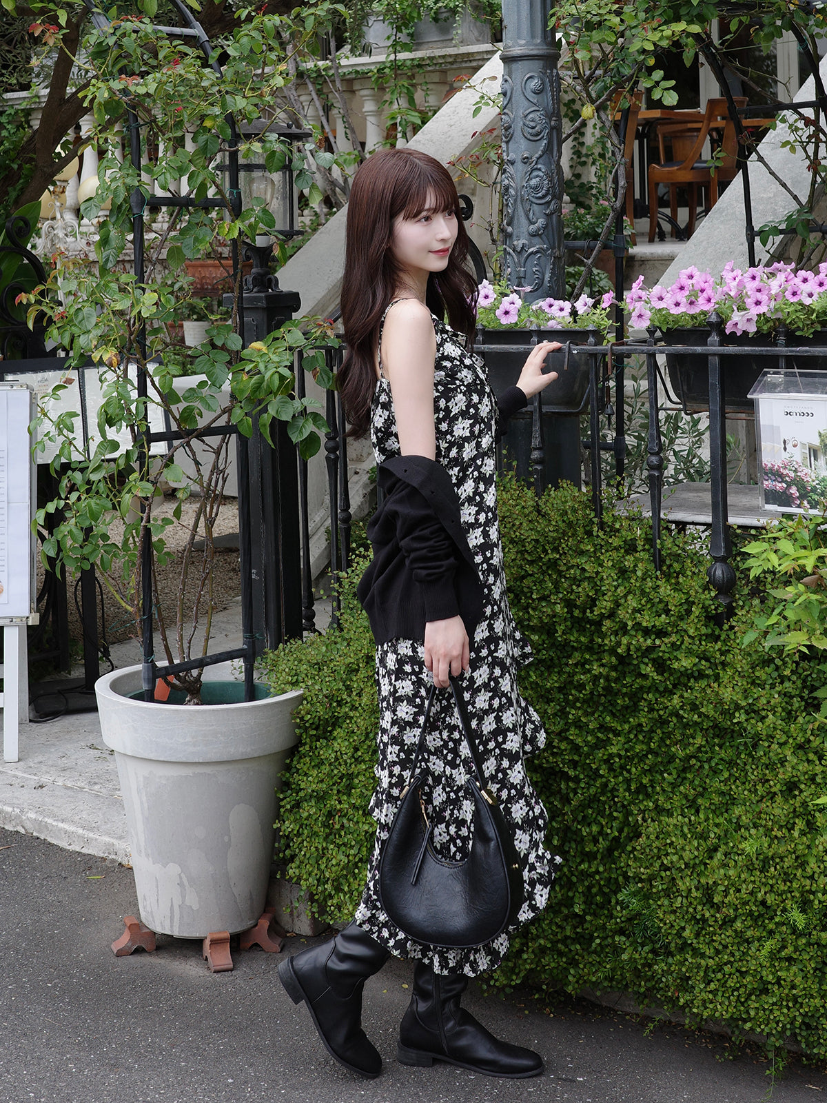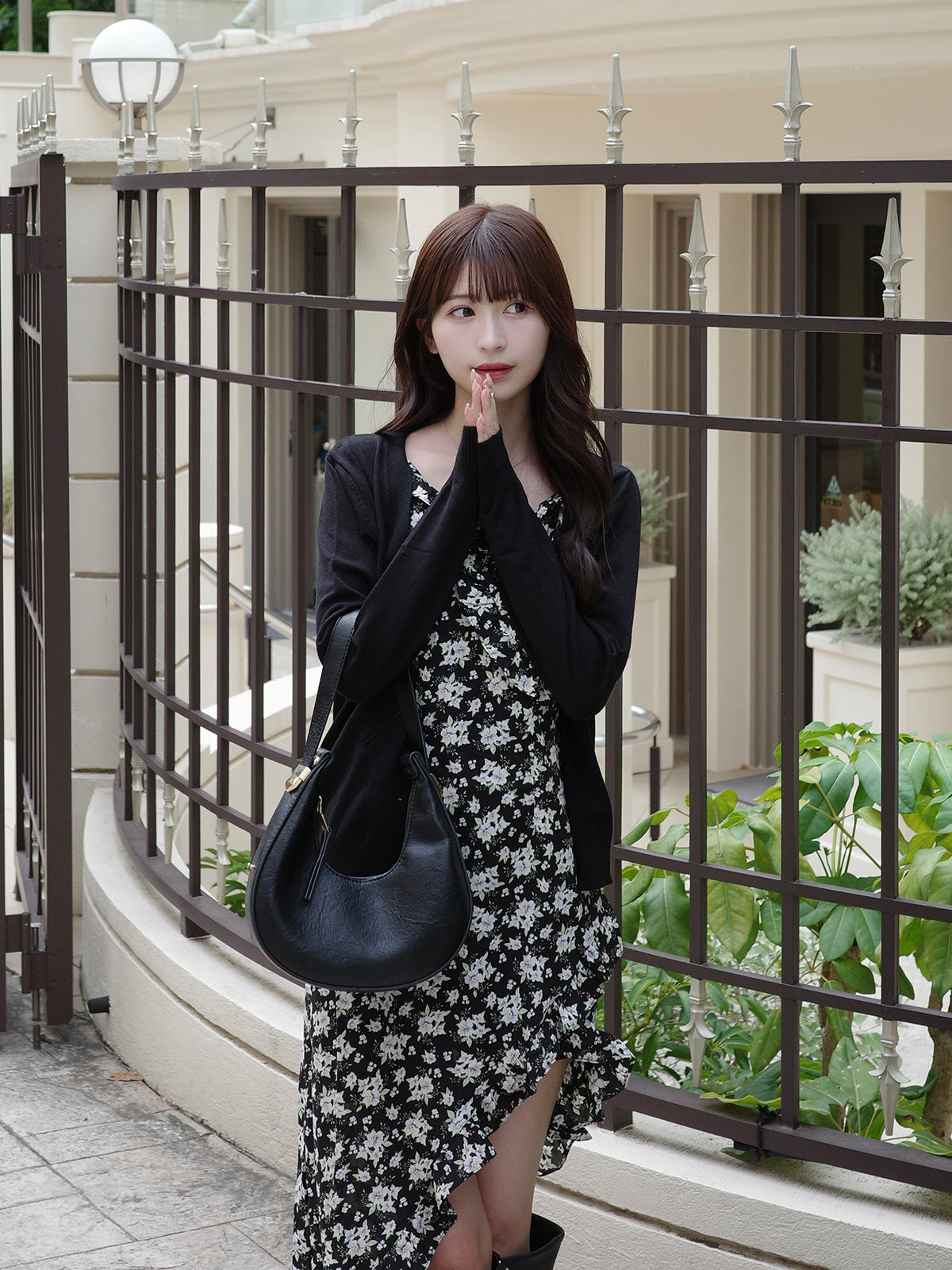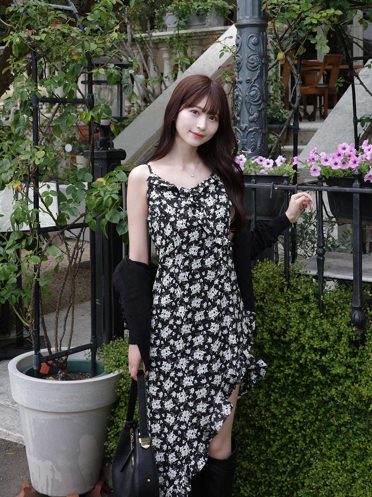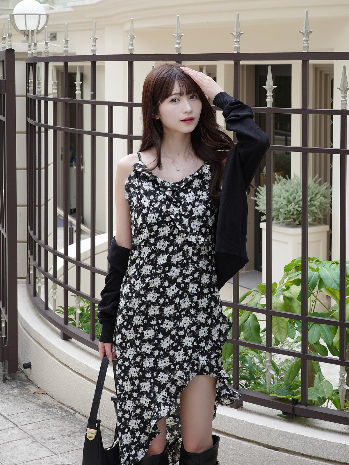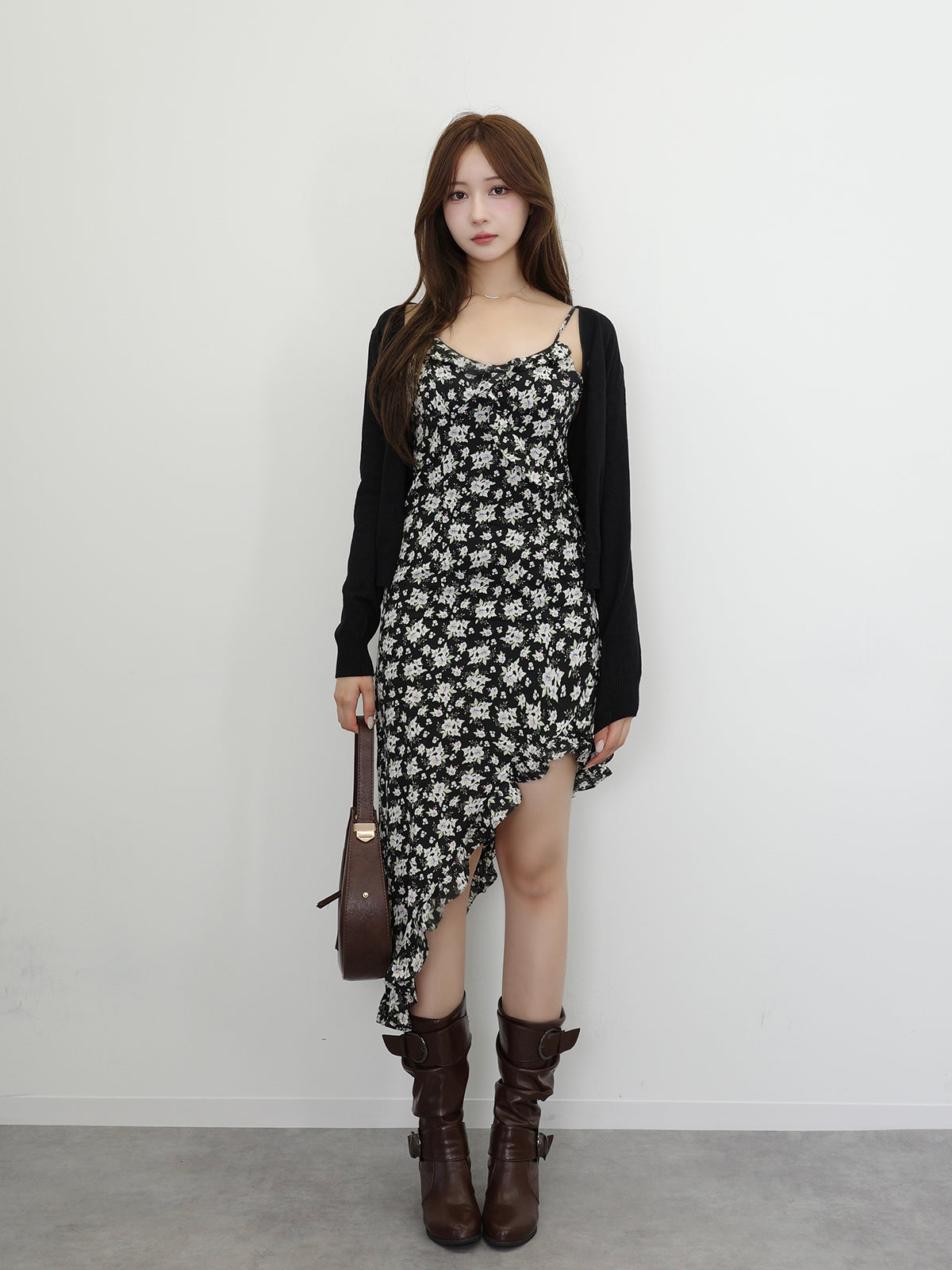 アシンメトリーなフリルヘムが視線を惹きつける花柄キャミワンピと、シンプルなニットカーディガンのセット。