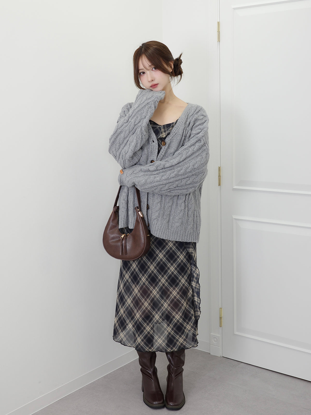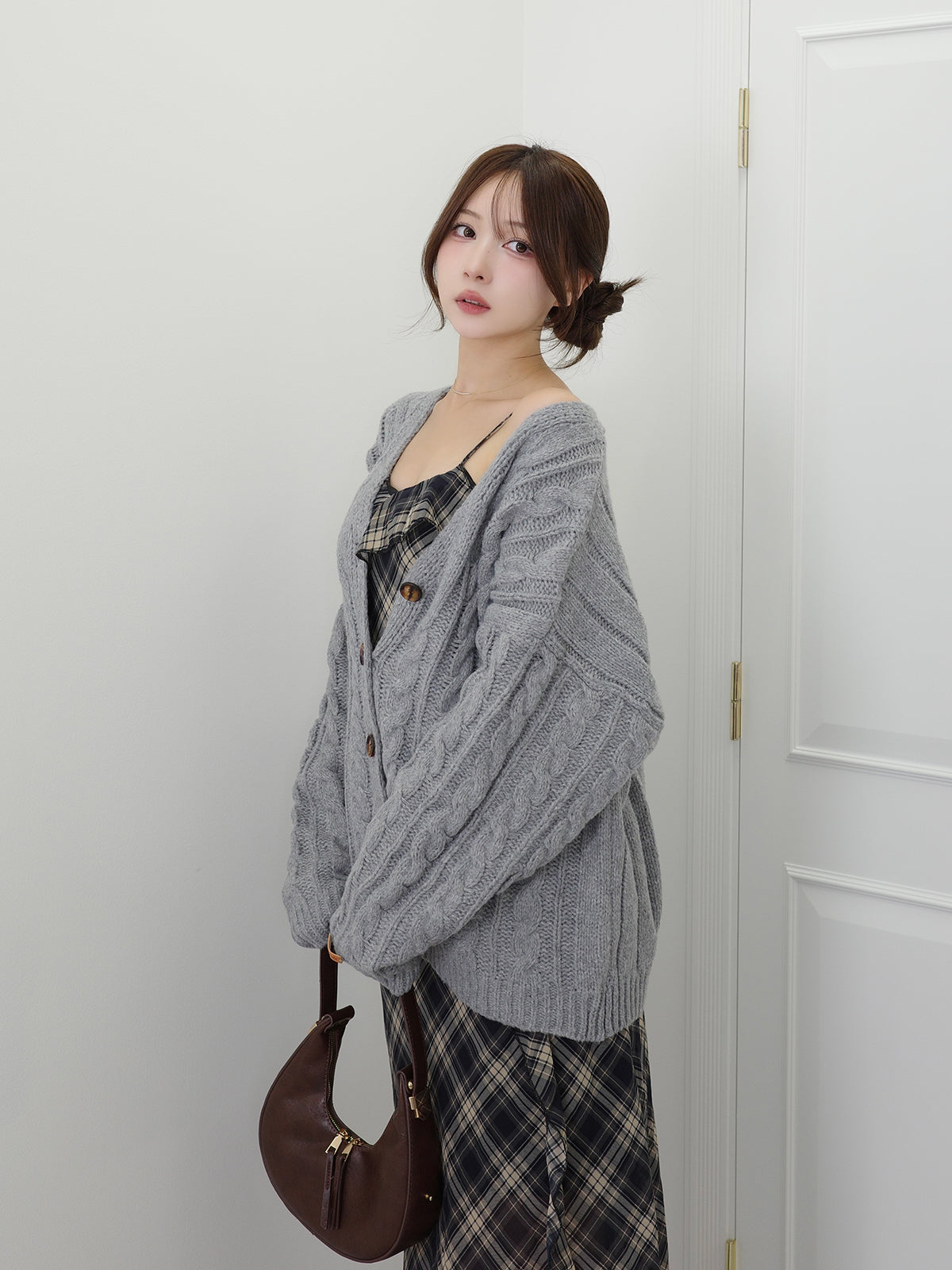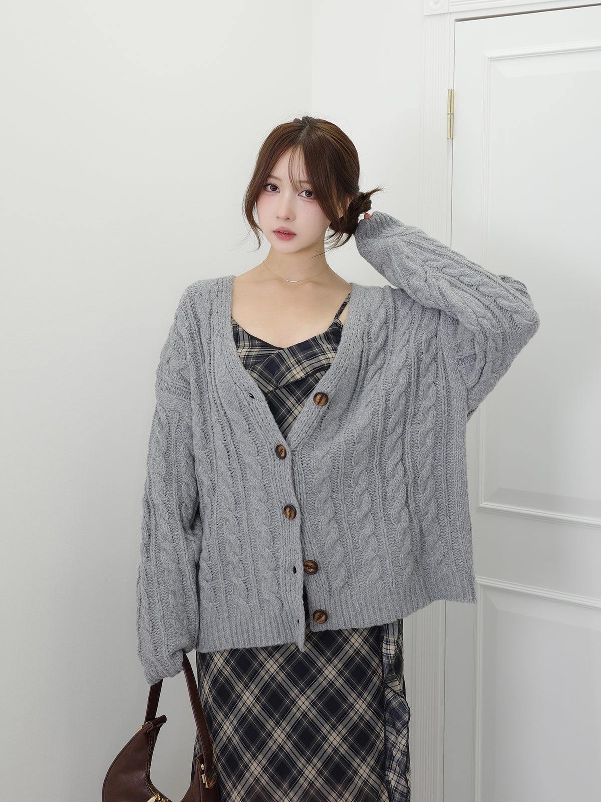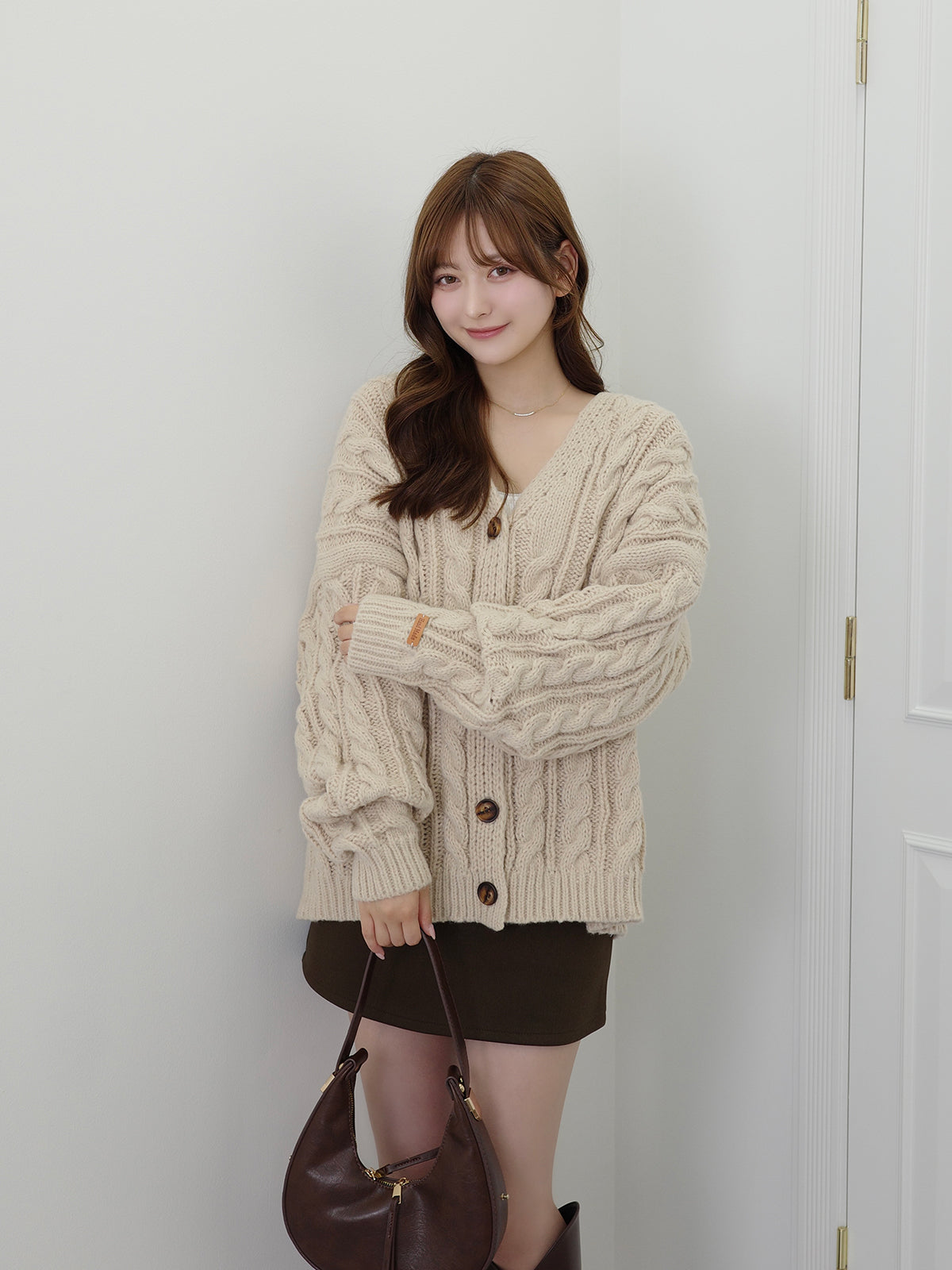 手編みのような温かみのあるケーブル柄が魅力のニットカーディガン。