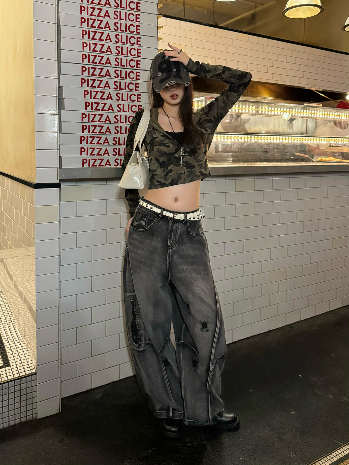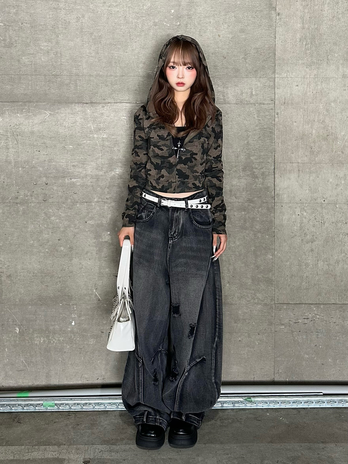 程よいダメージ加工がこなれた印象を演出し、裾に施された逆さのポケットステッチがさりげないアクセントに。