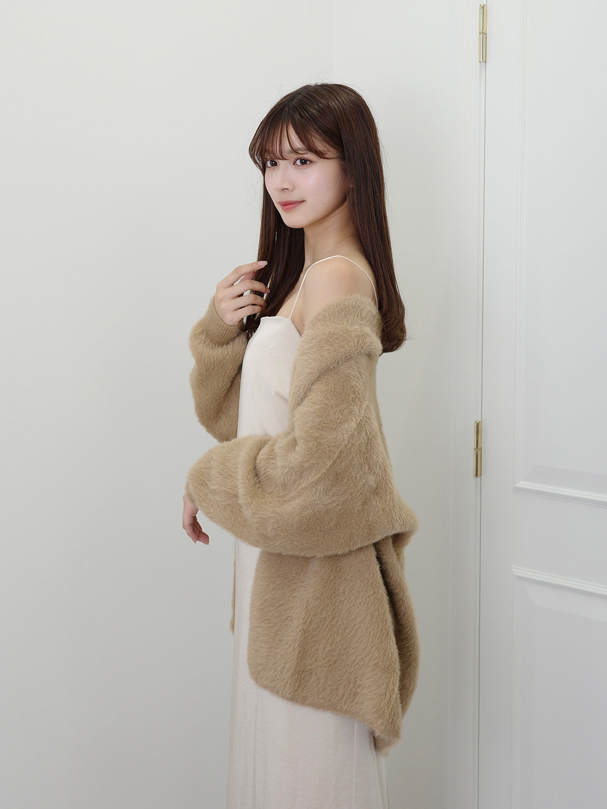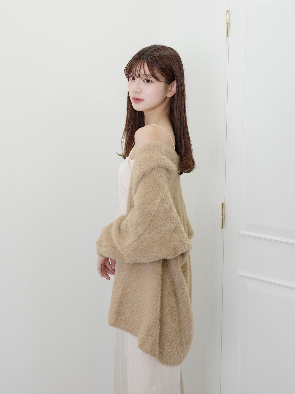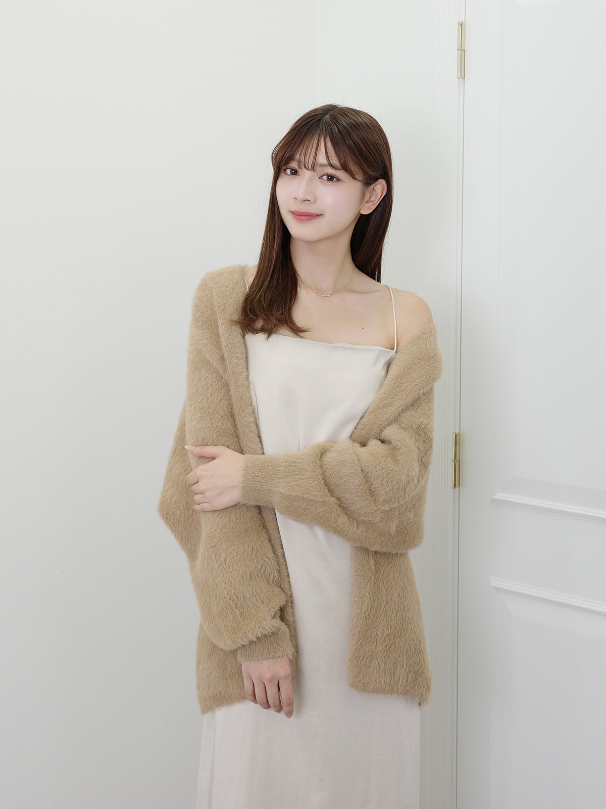 ふわふわのシャギーニットが女の子らしさ満点のカーディガン。