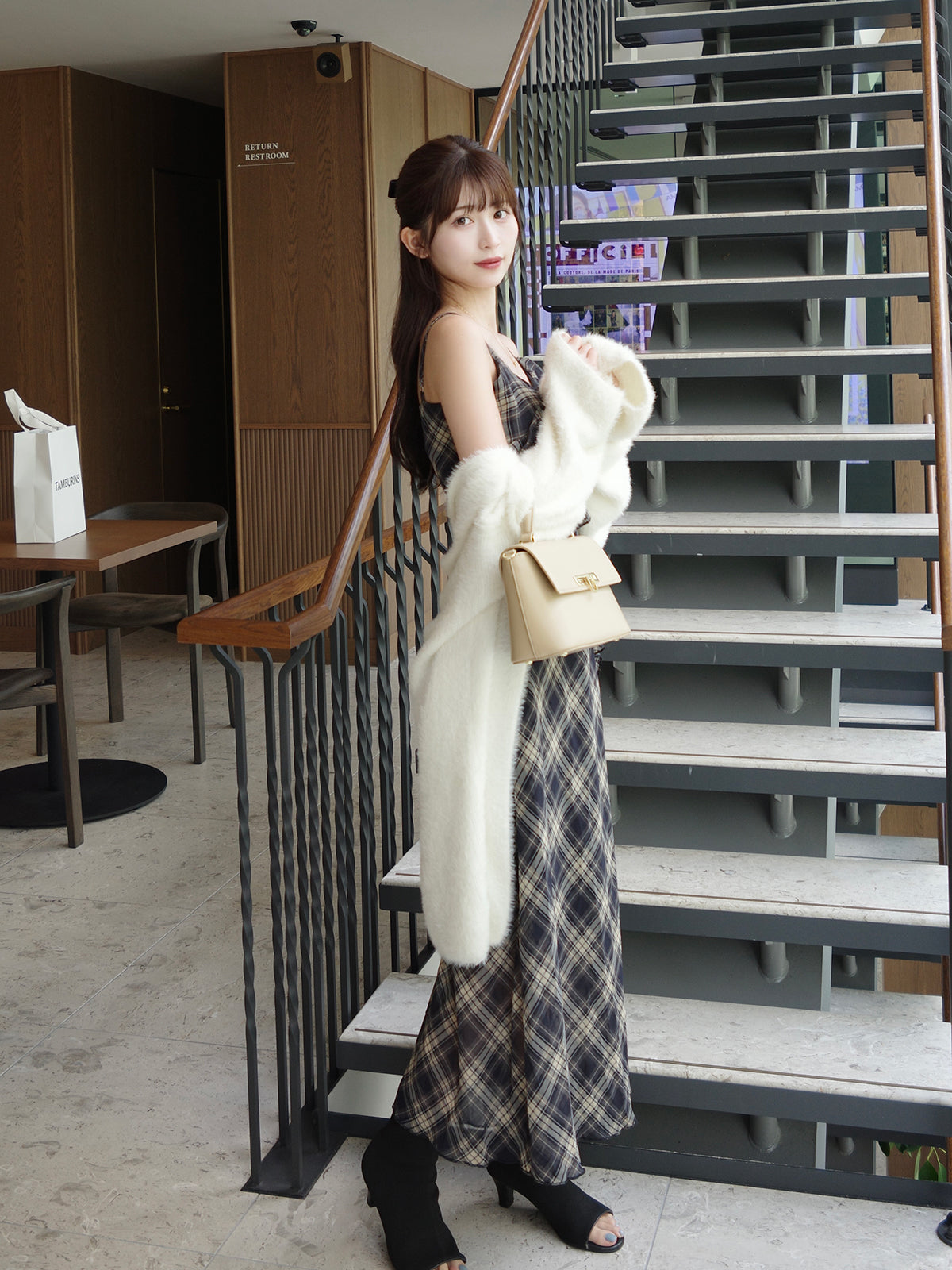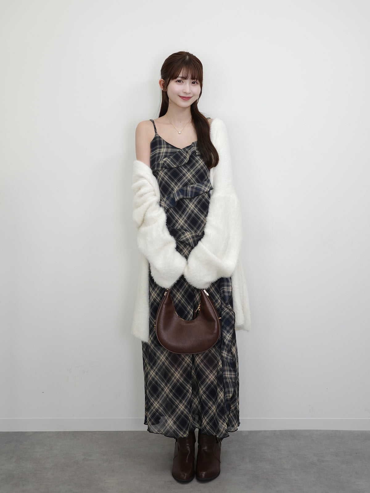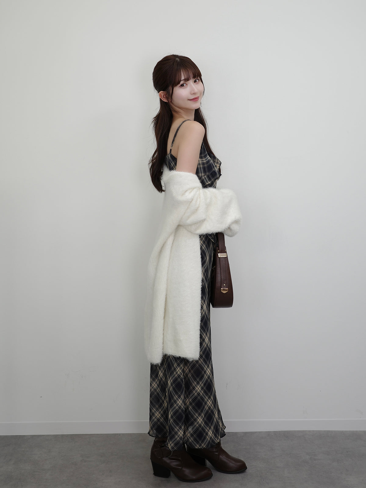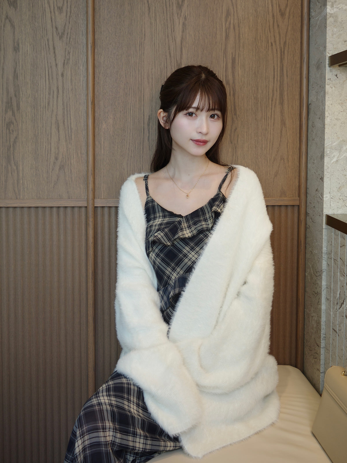 ふわふわのシャギーニットが女の子らしさ満点のカーディガン。