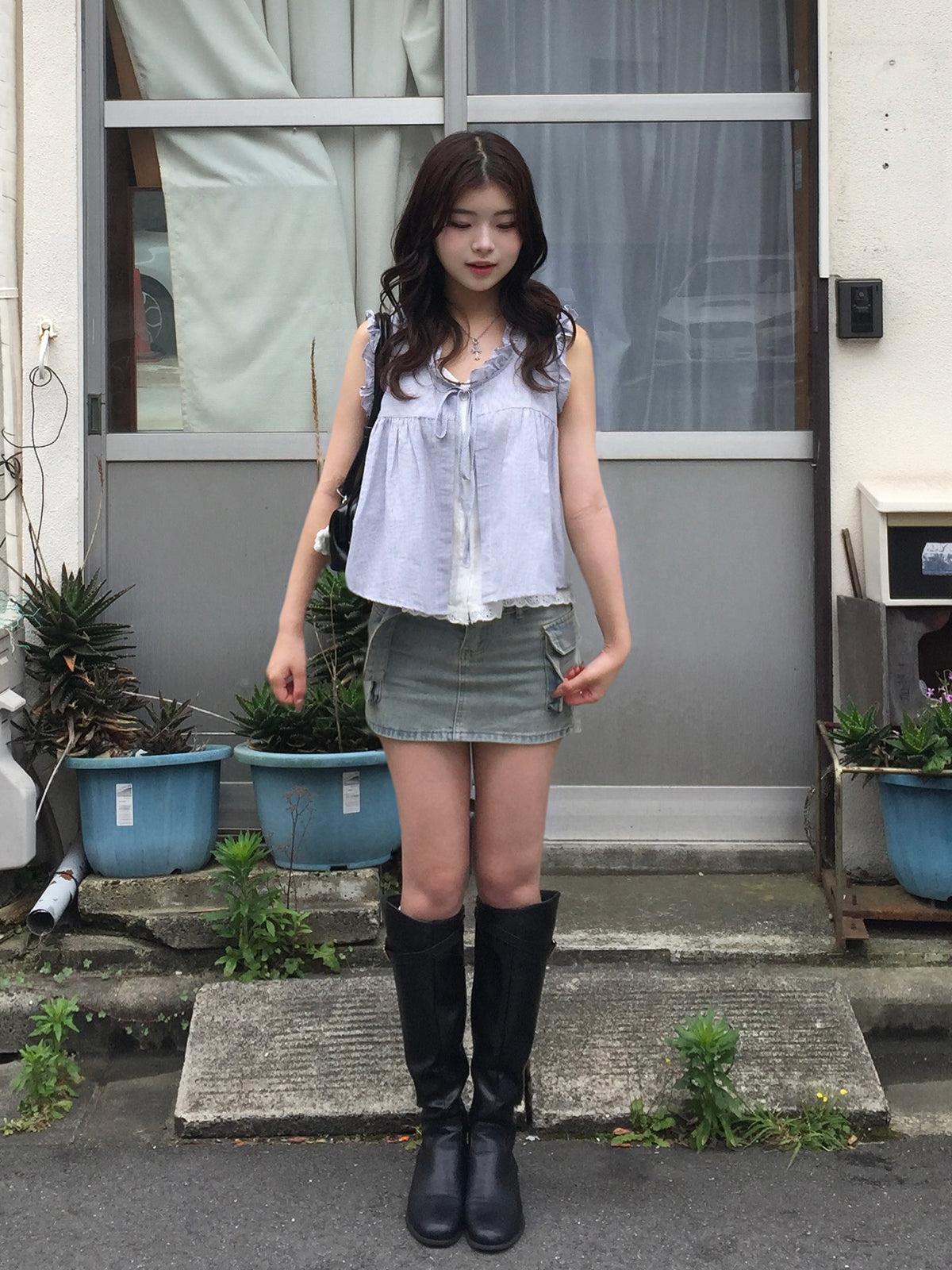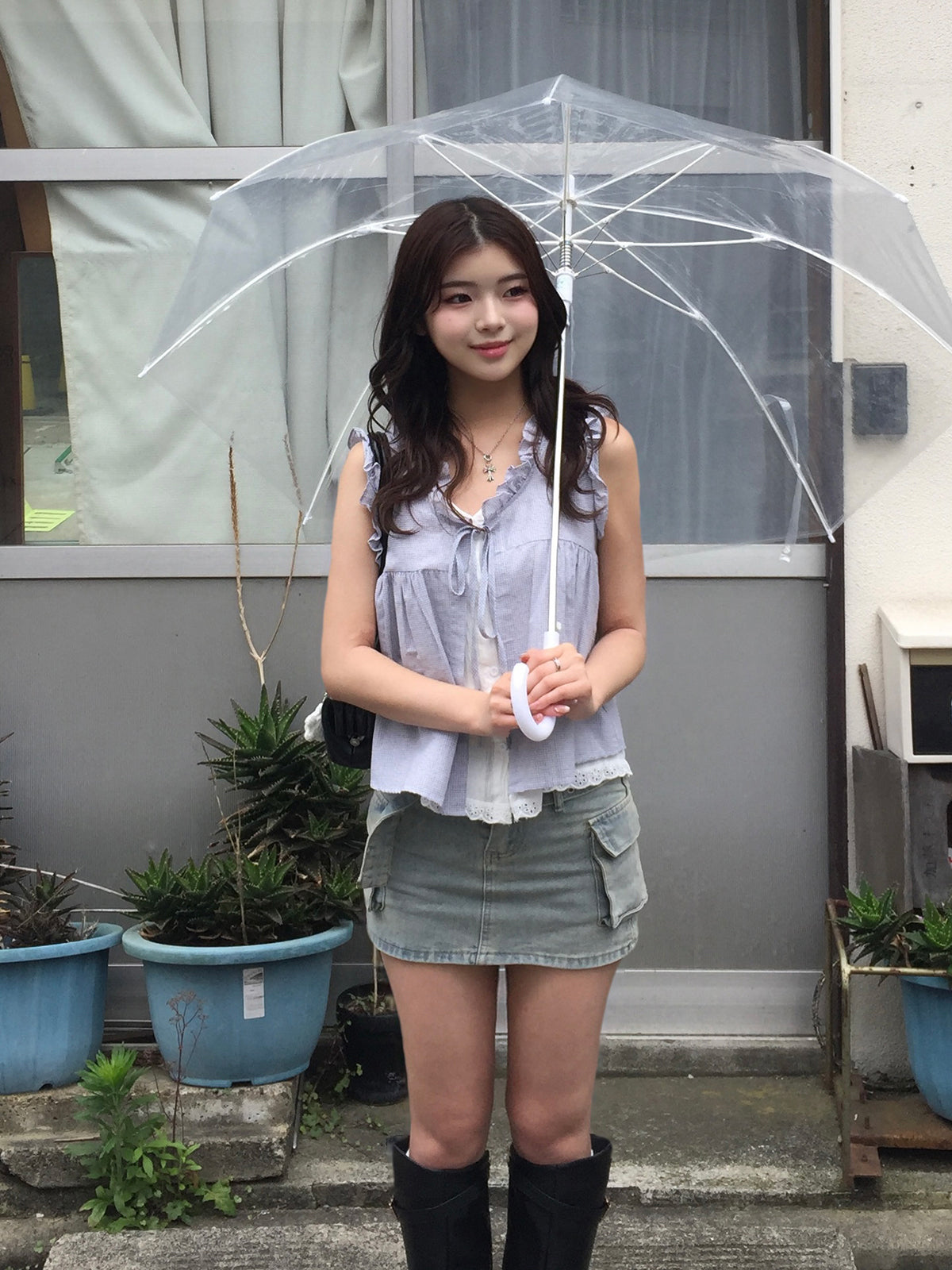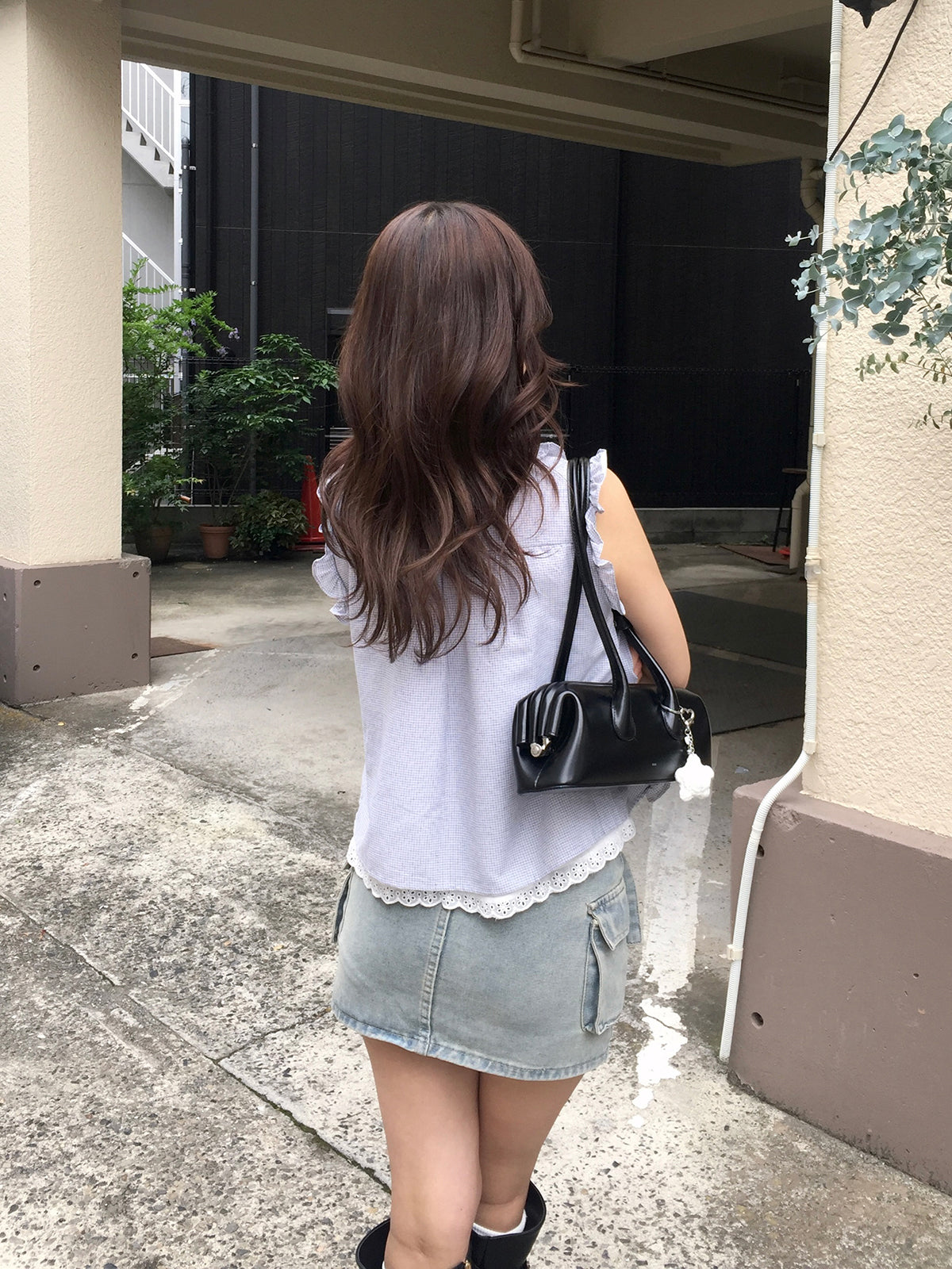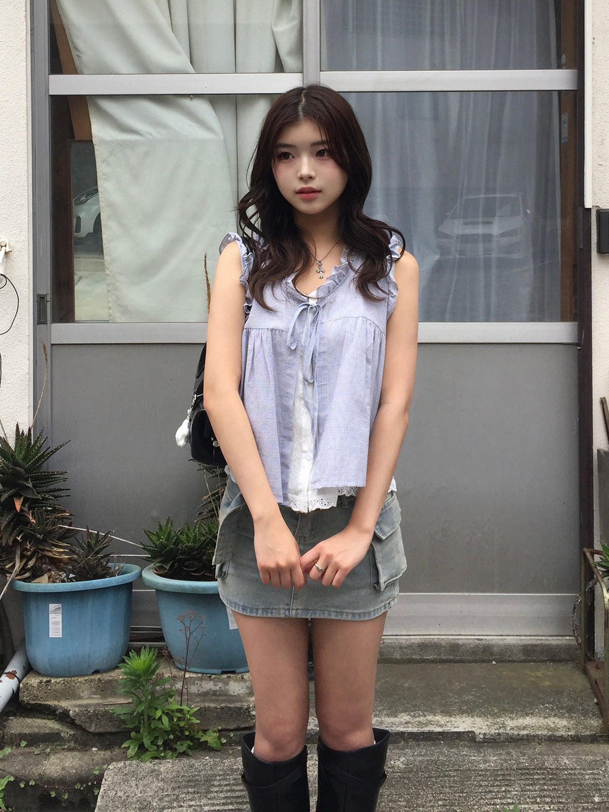 フロントリボンとフリルが目を引くグラフチェック柄のベストと、胸元に繊細なレースをあしらったブラウスをドッキング。