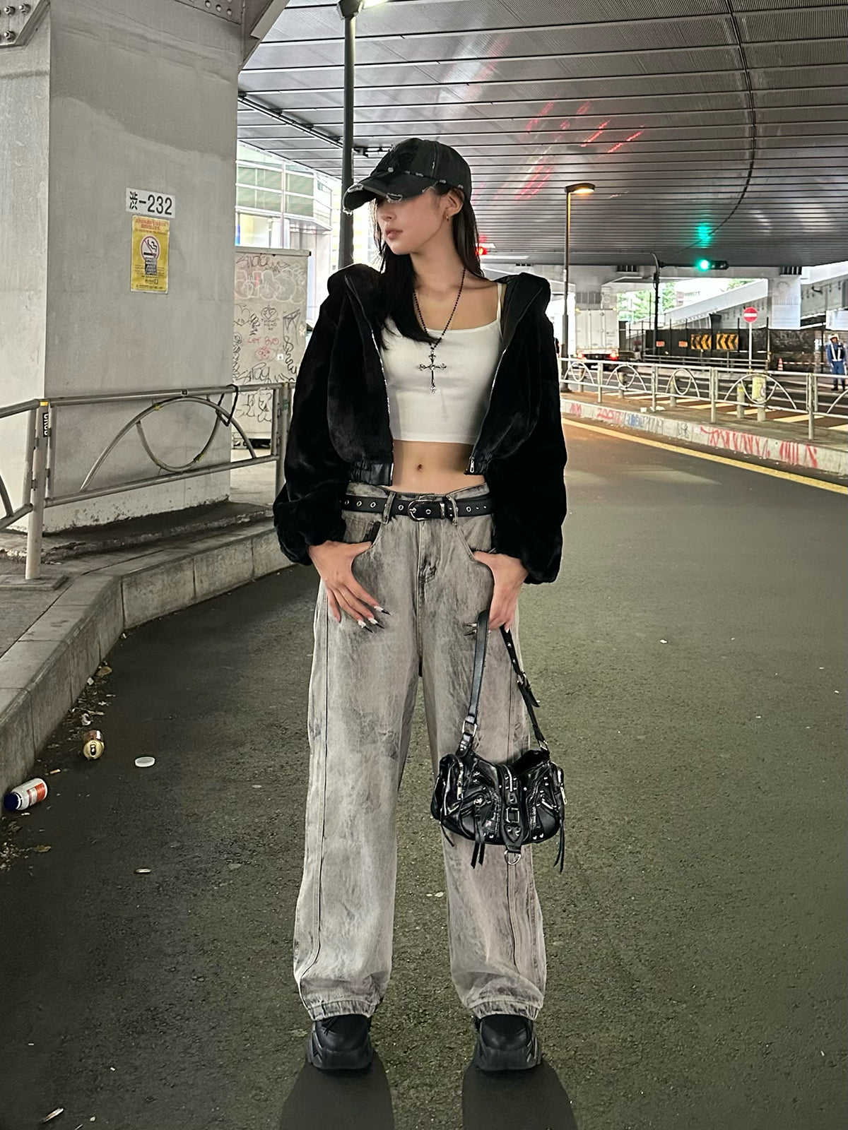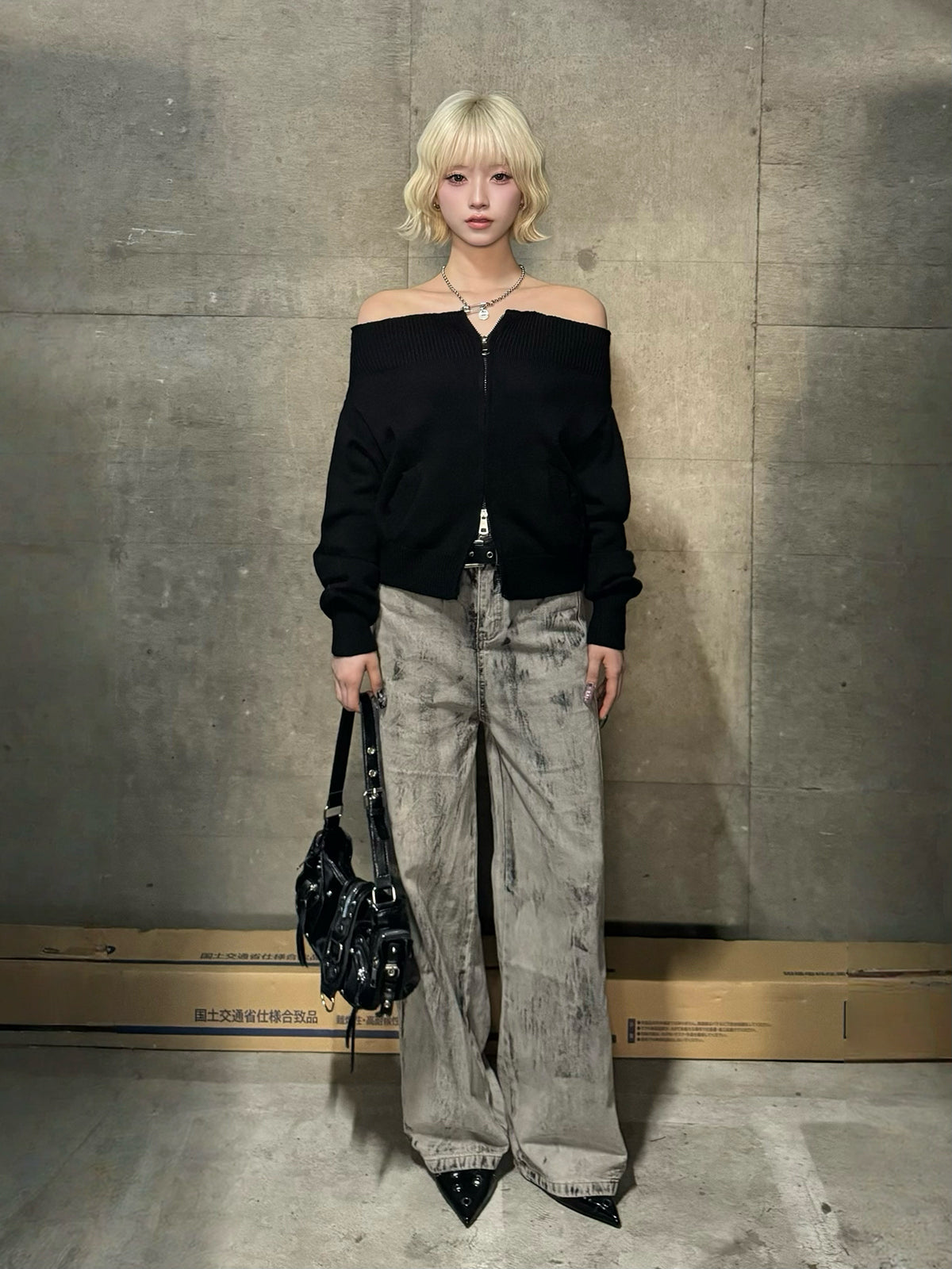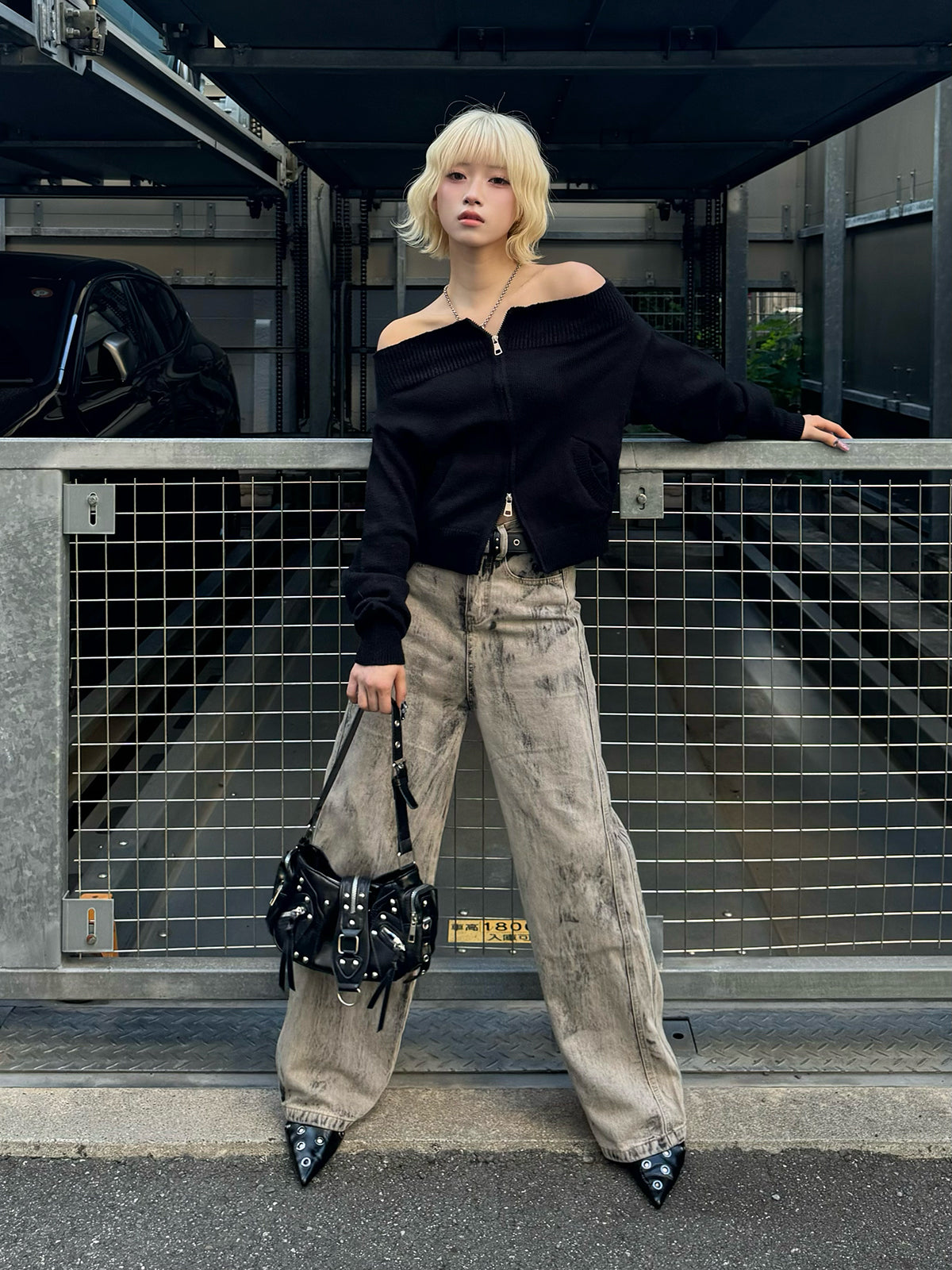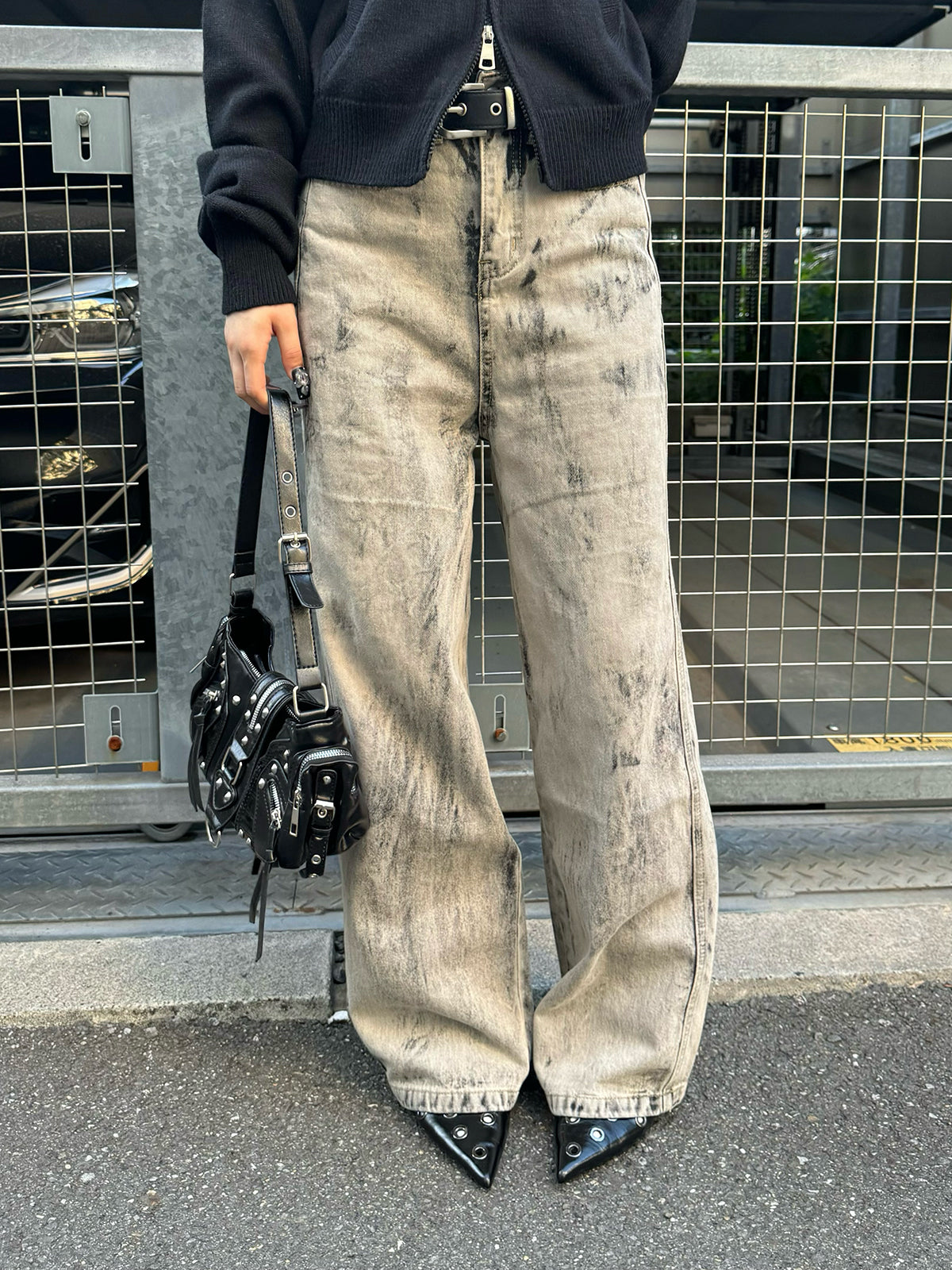 独特なグレーの色ムラ加工が目を引く、存在感たっぷりのデニムパンツ。