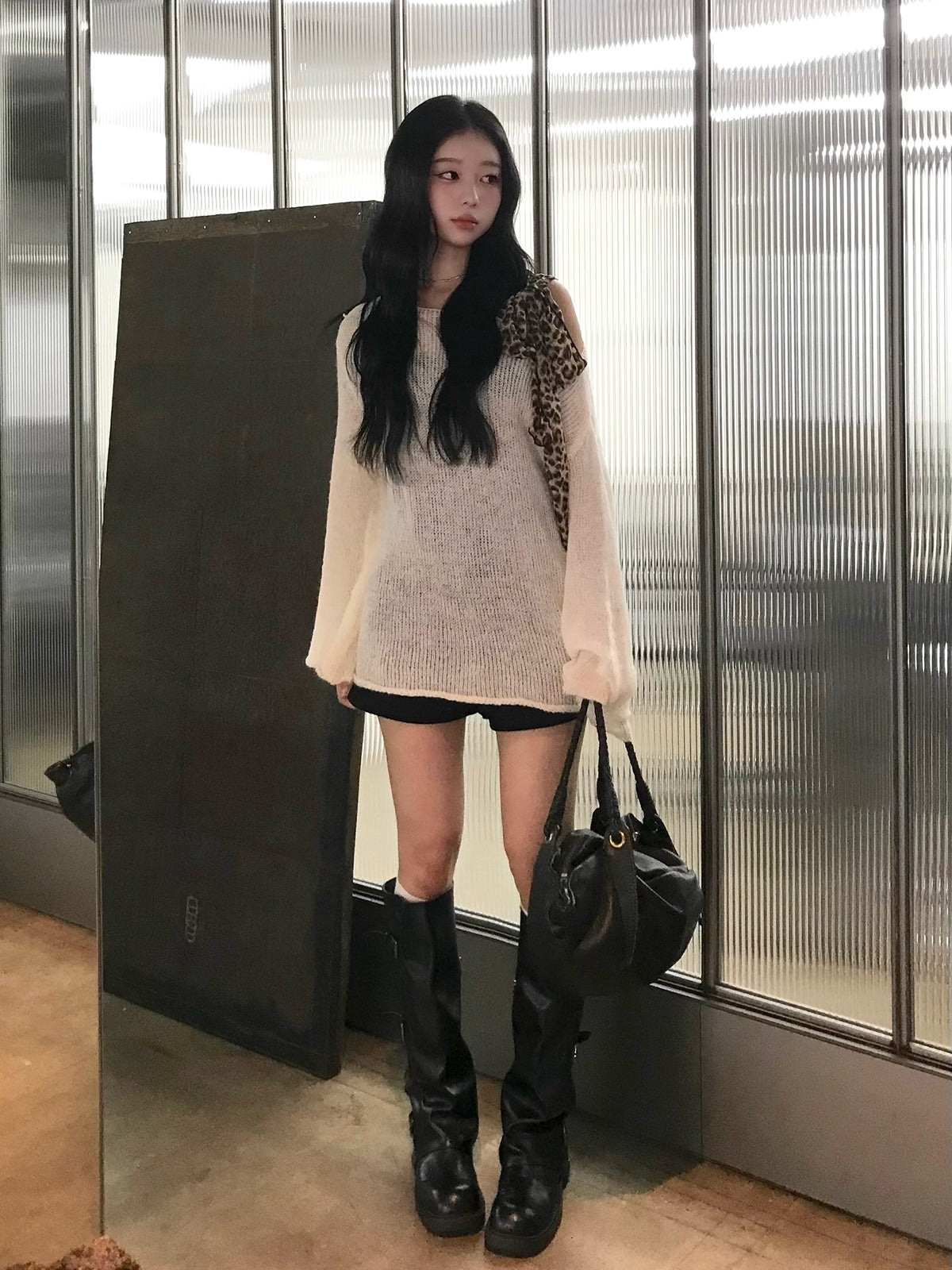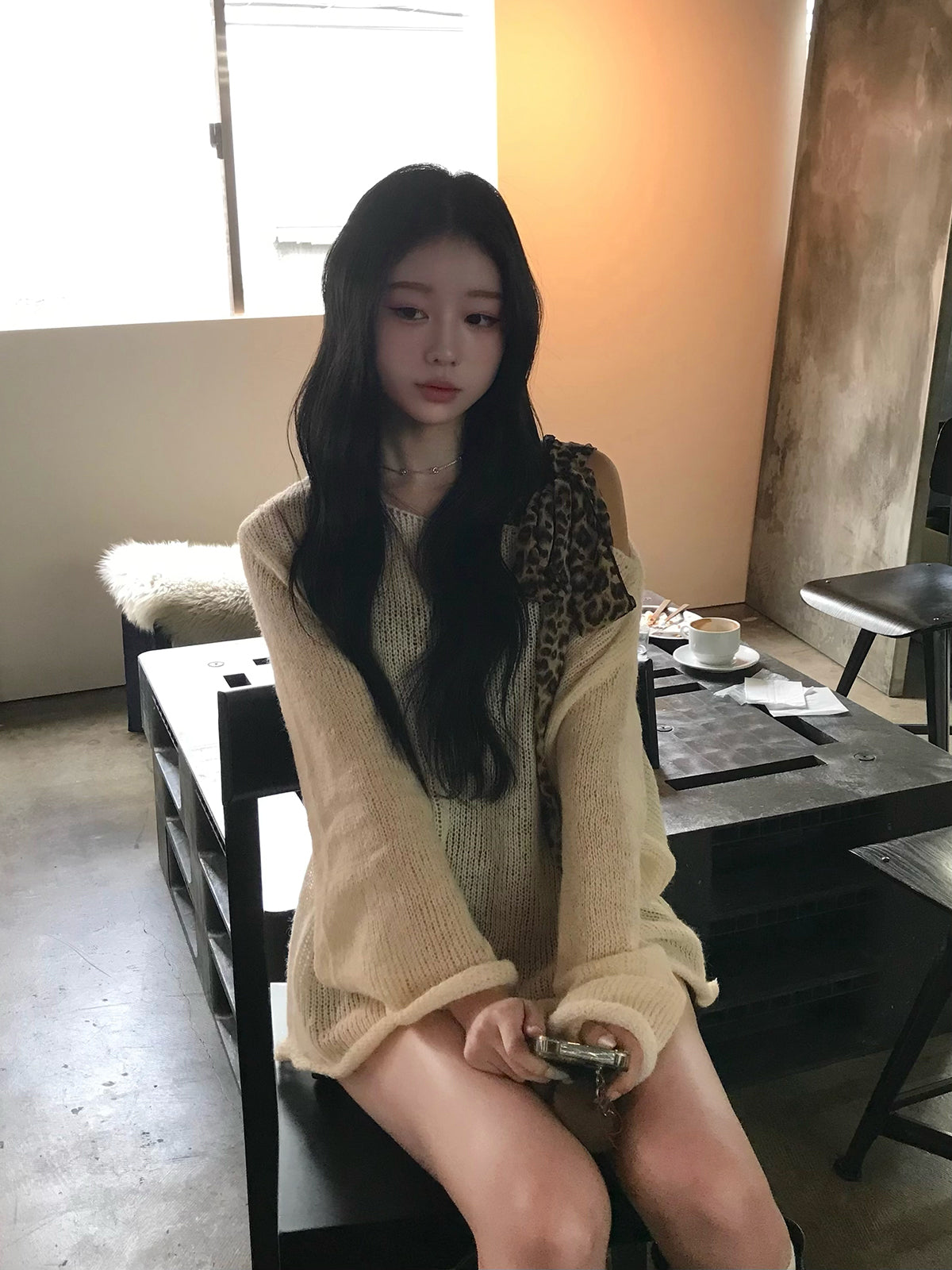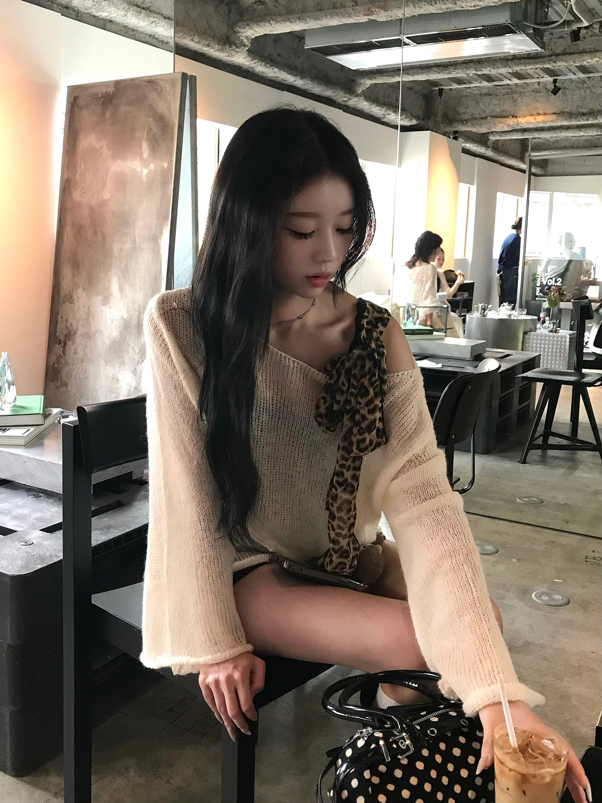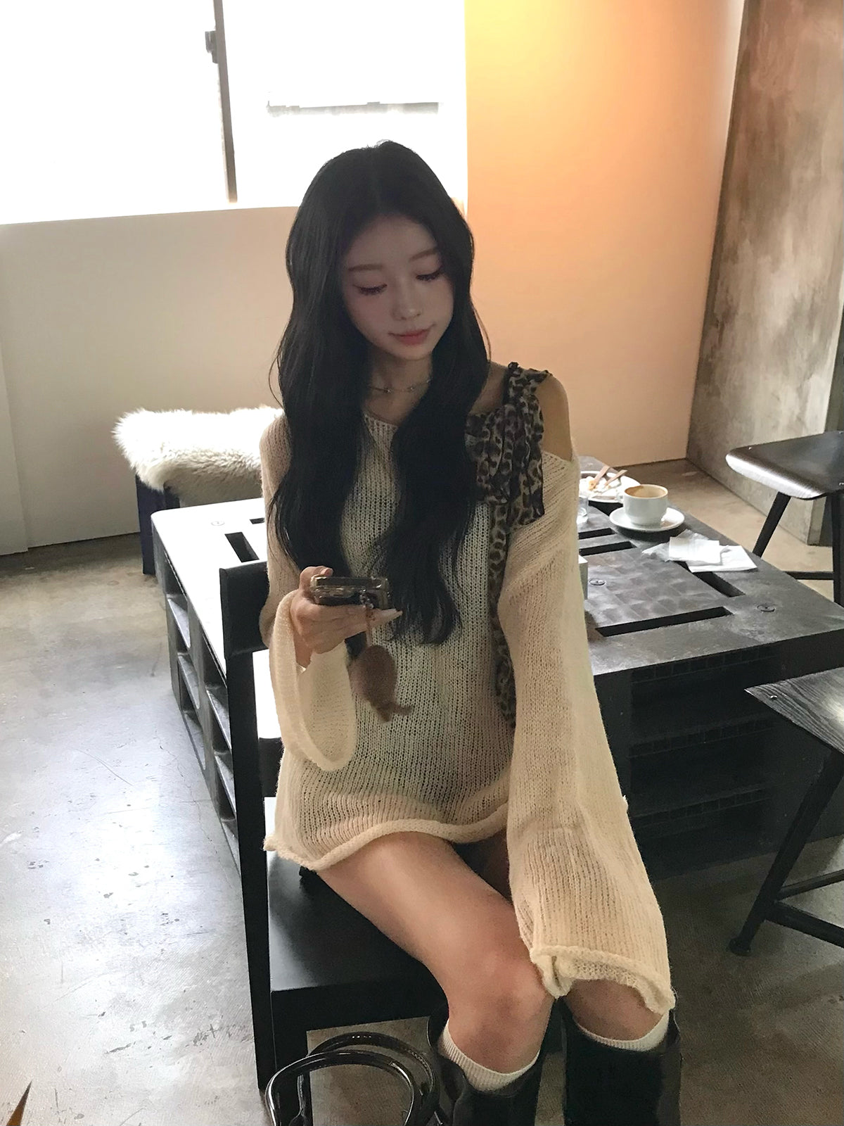 レオパード柄のショルダーリボンがアクセントになったルーズニット。