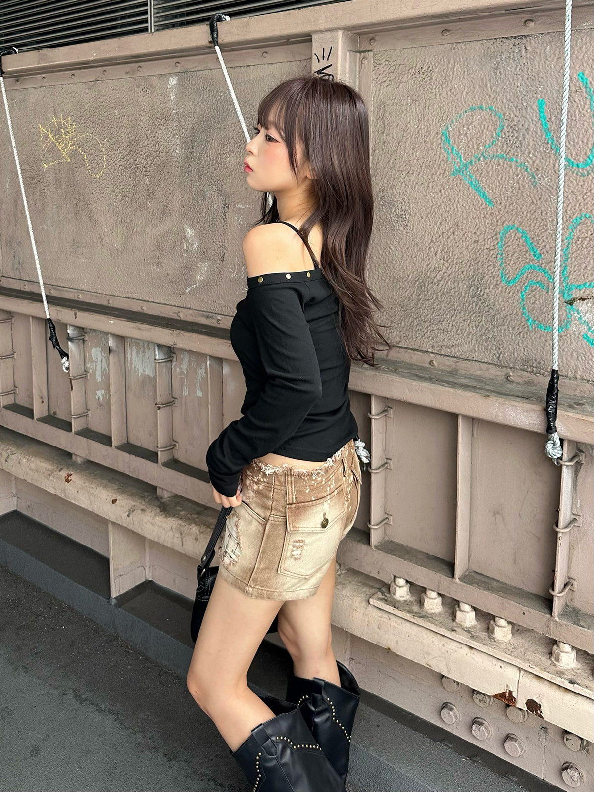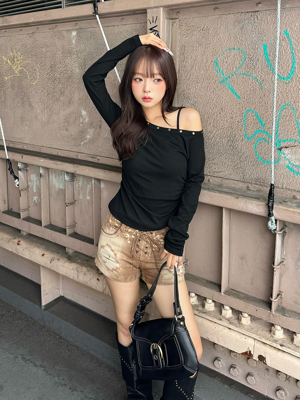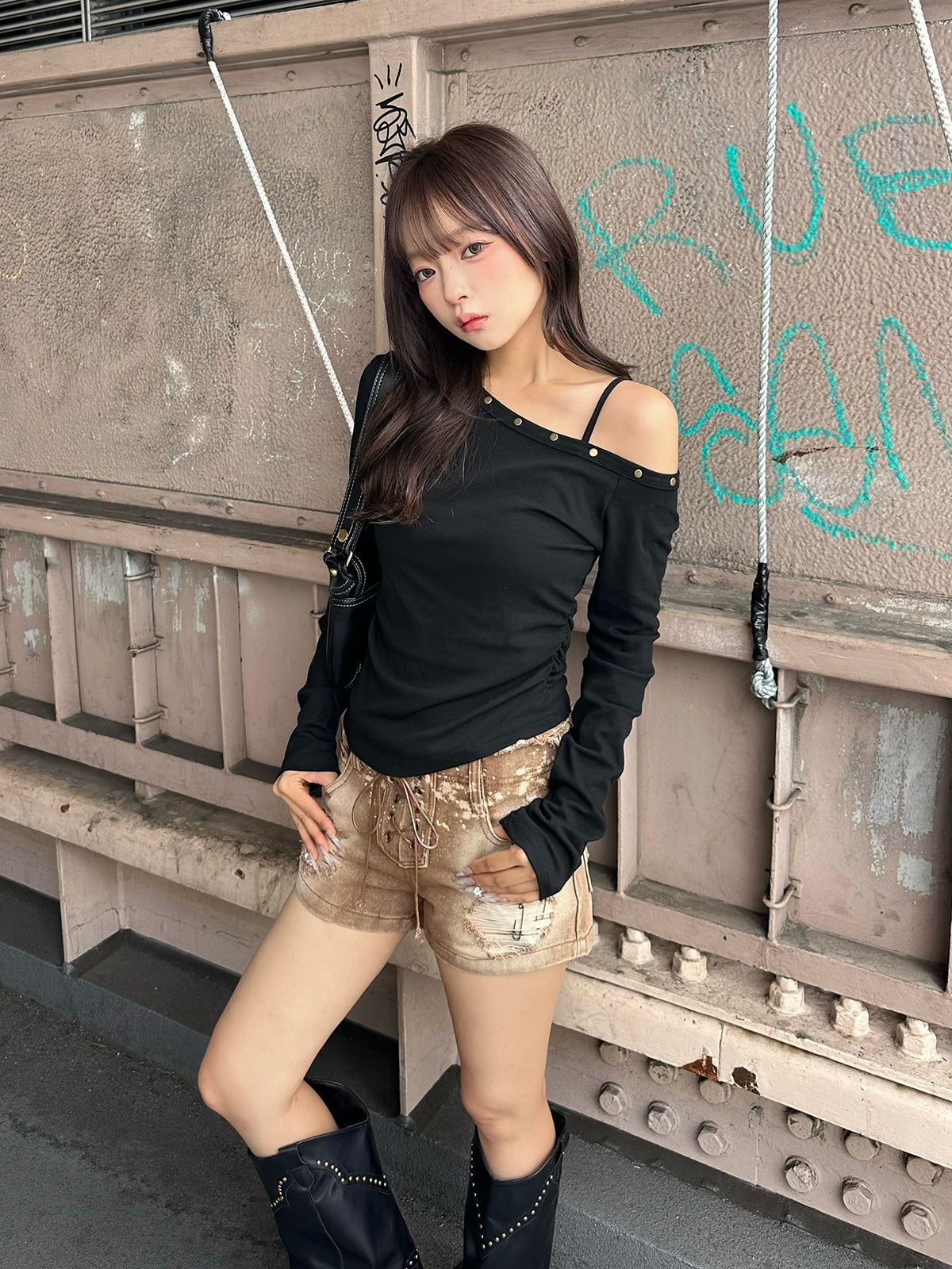 ワンショルデザインが程よく肌見せし、抜け感のあるスタイリングに。