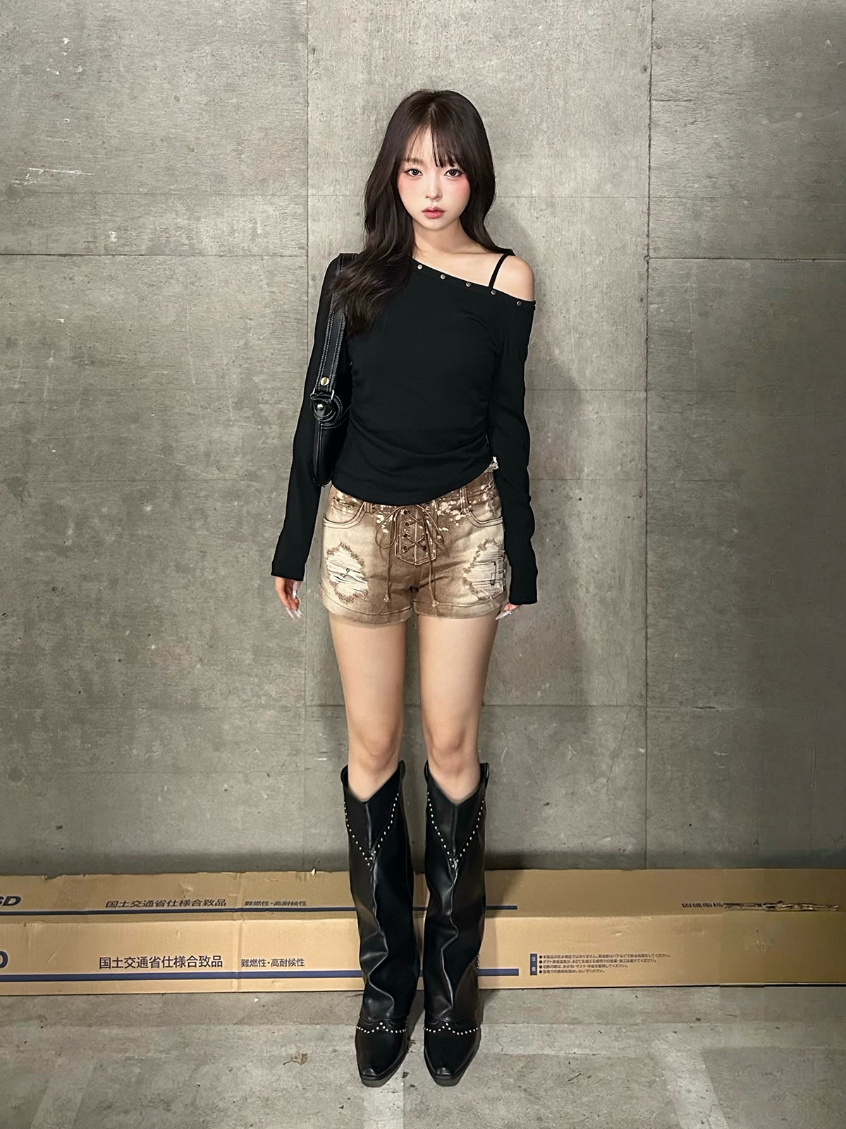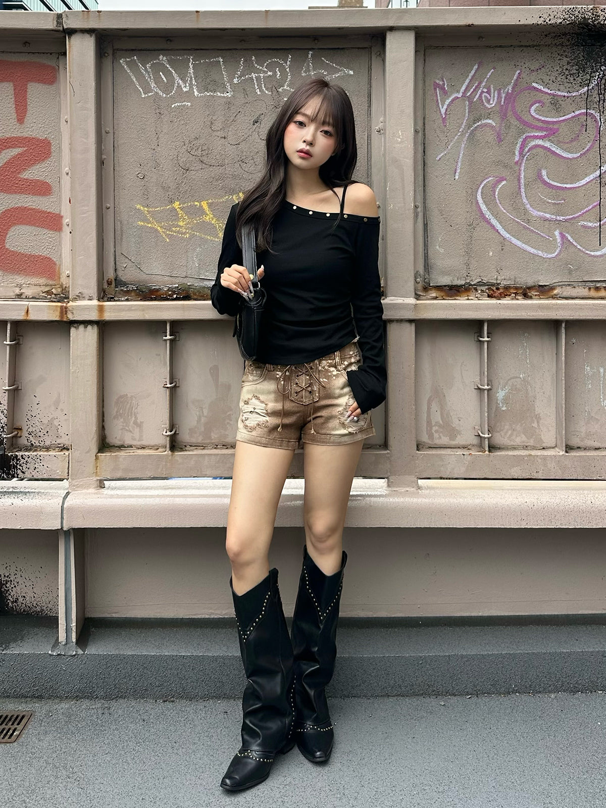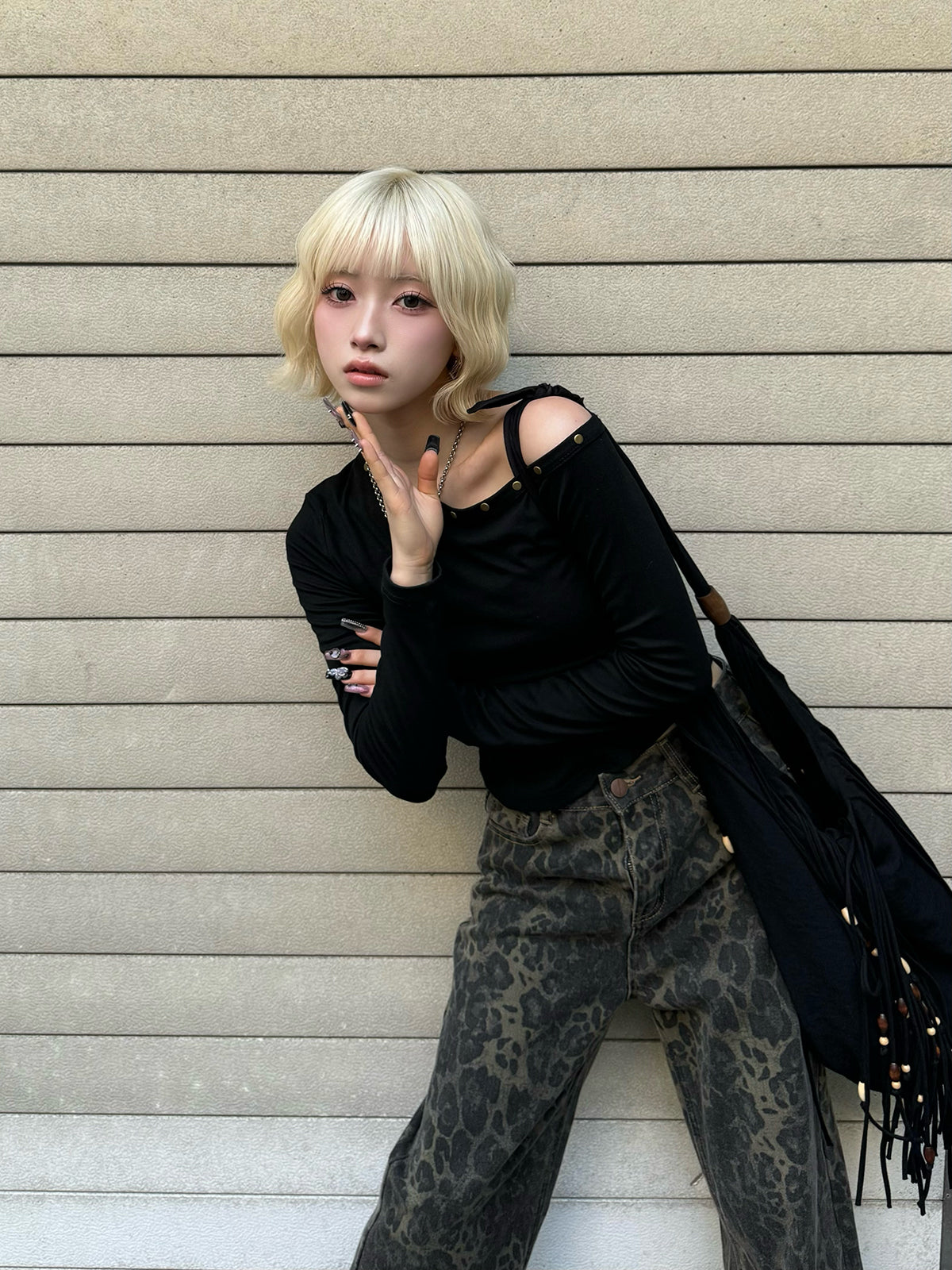 ワンショルデザインが程よく肌見せし、抜け感のあるスタイリングに。