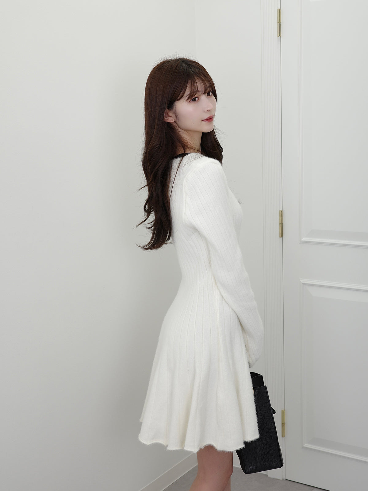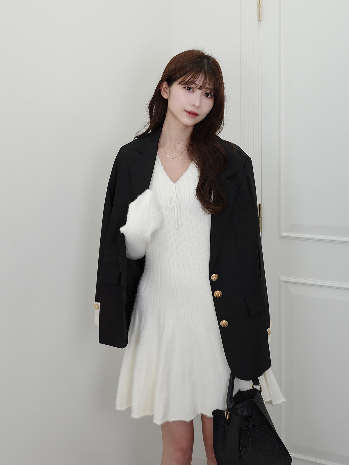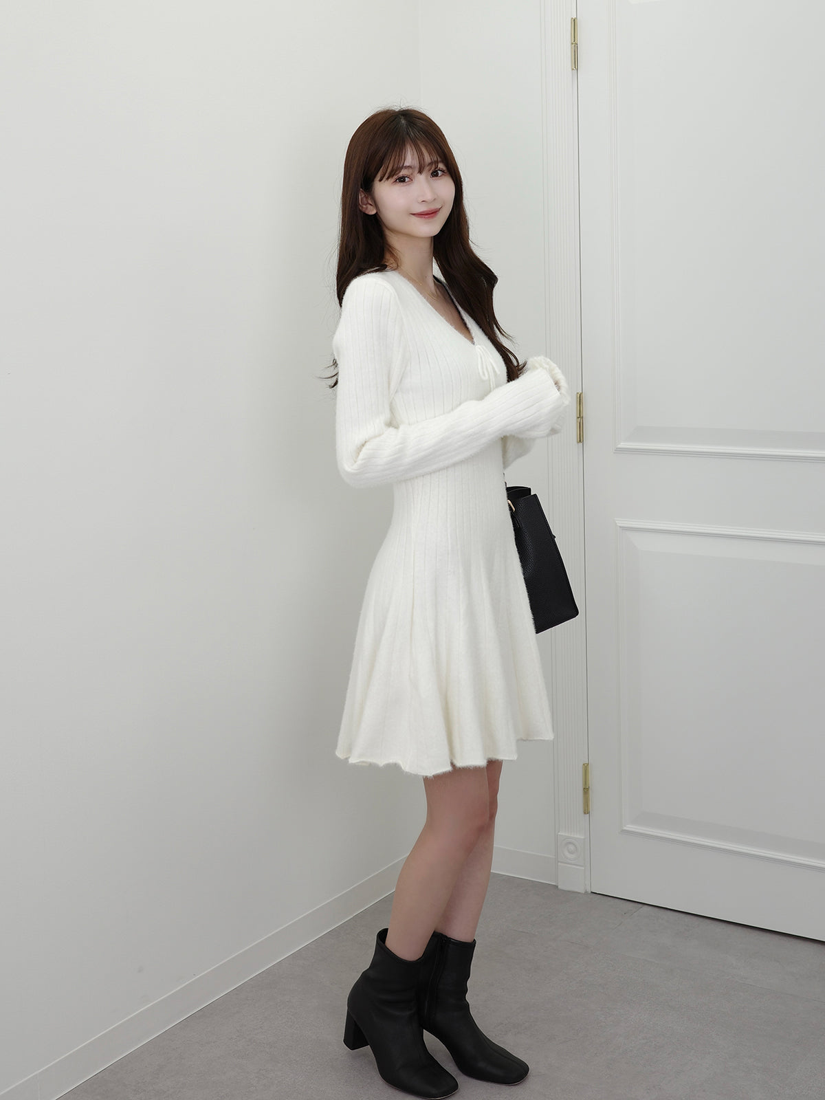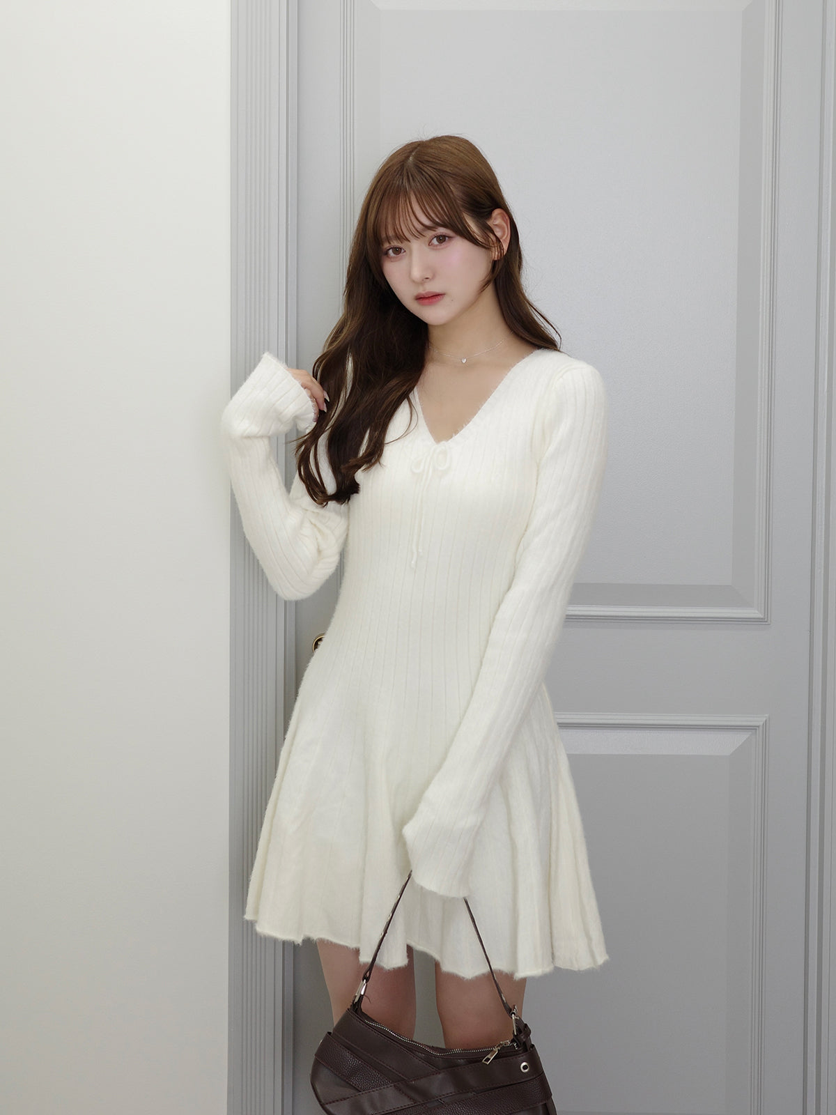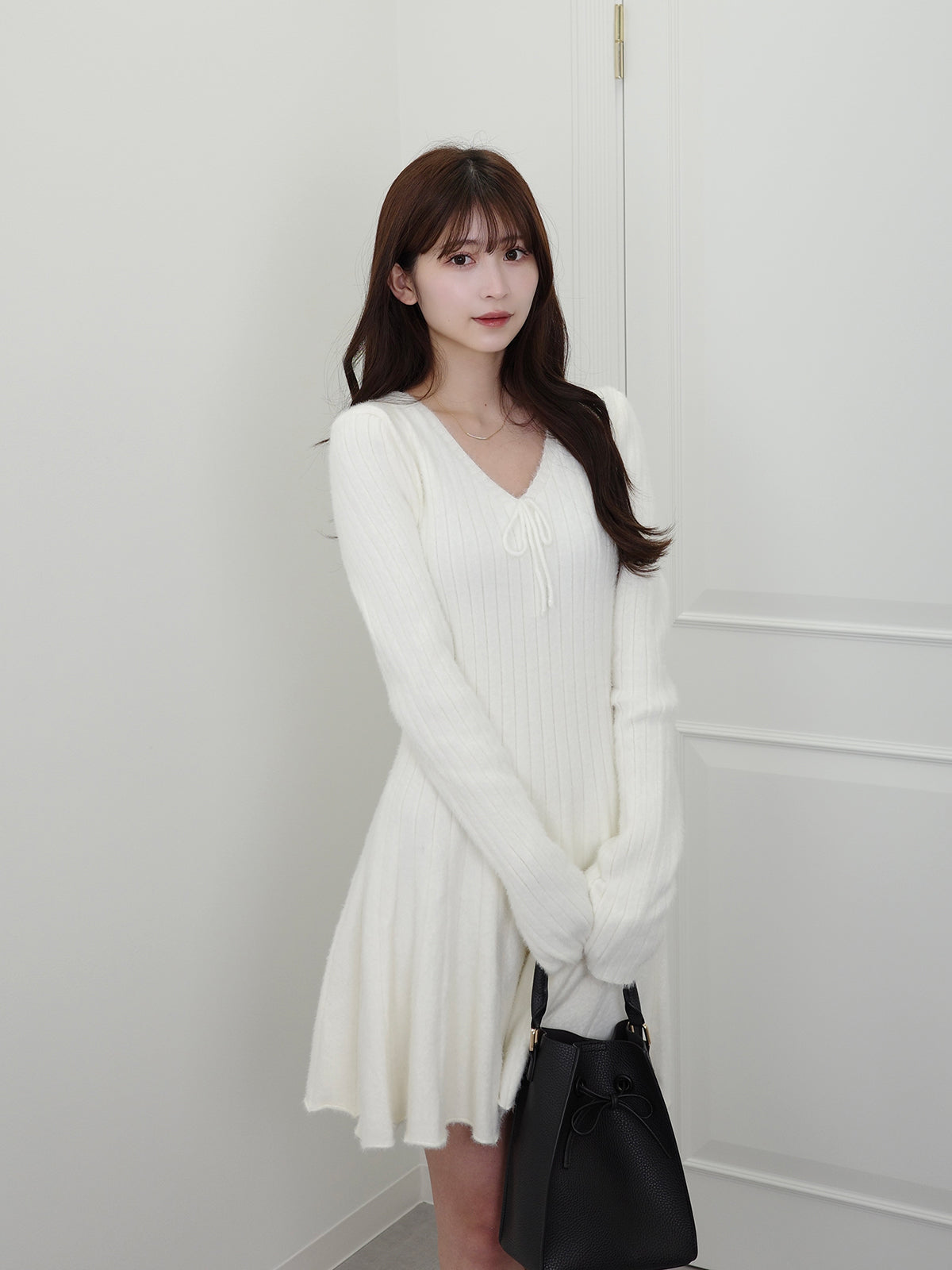 シンプルなニットワンピにフロントリボンがアクセント。